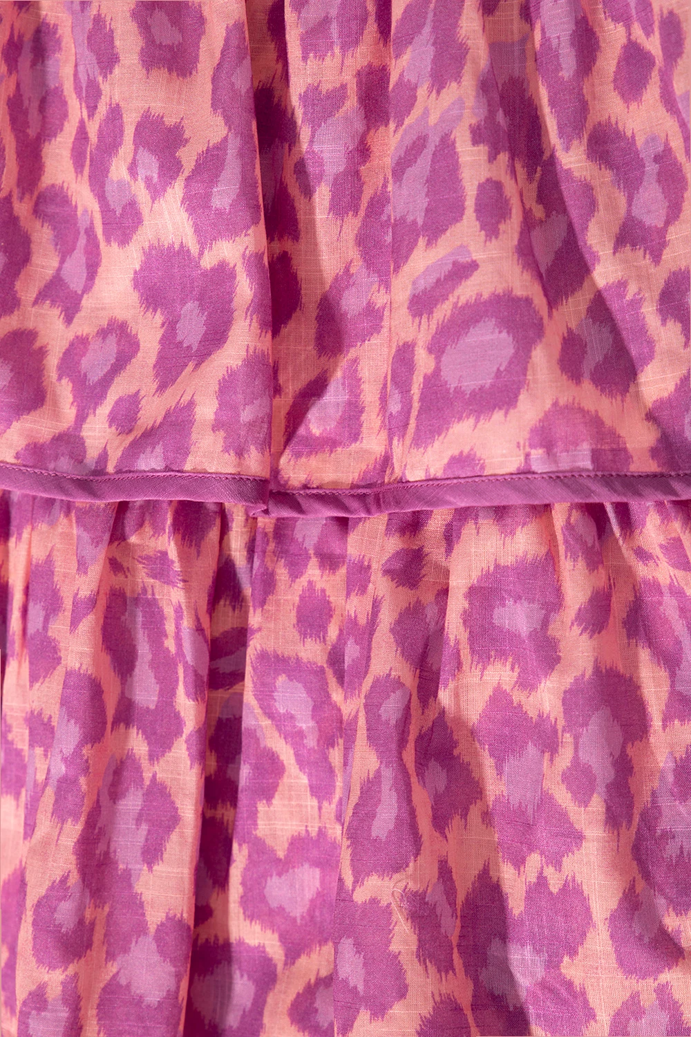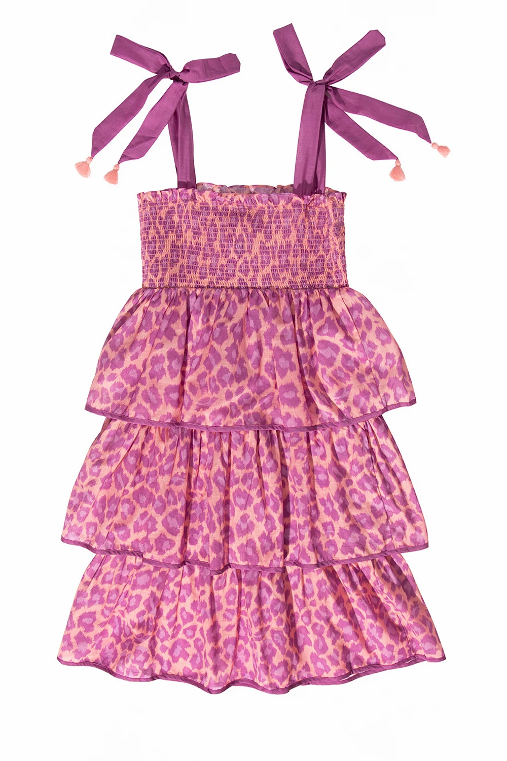 Beige and purple dress from Zimmermann Kids. Crafted from cotton and illustrated with a leopard print, this style features an elastic edge and shoulder straps accentuated with distinctive bows.
