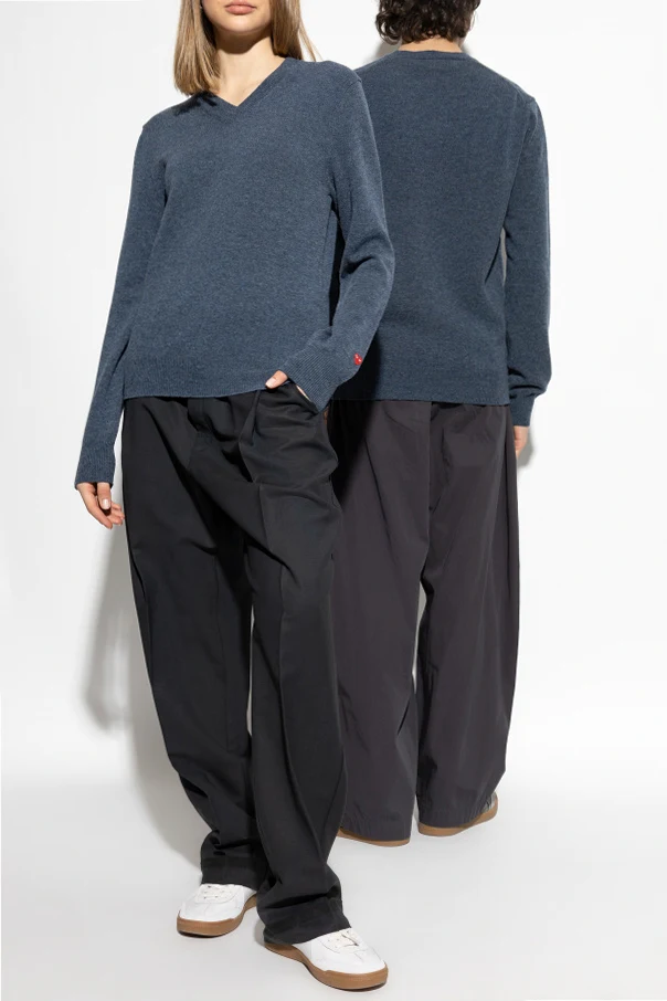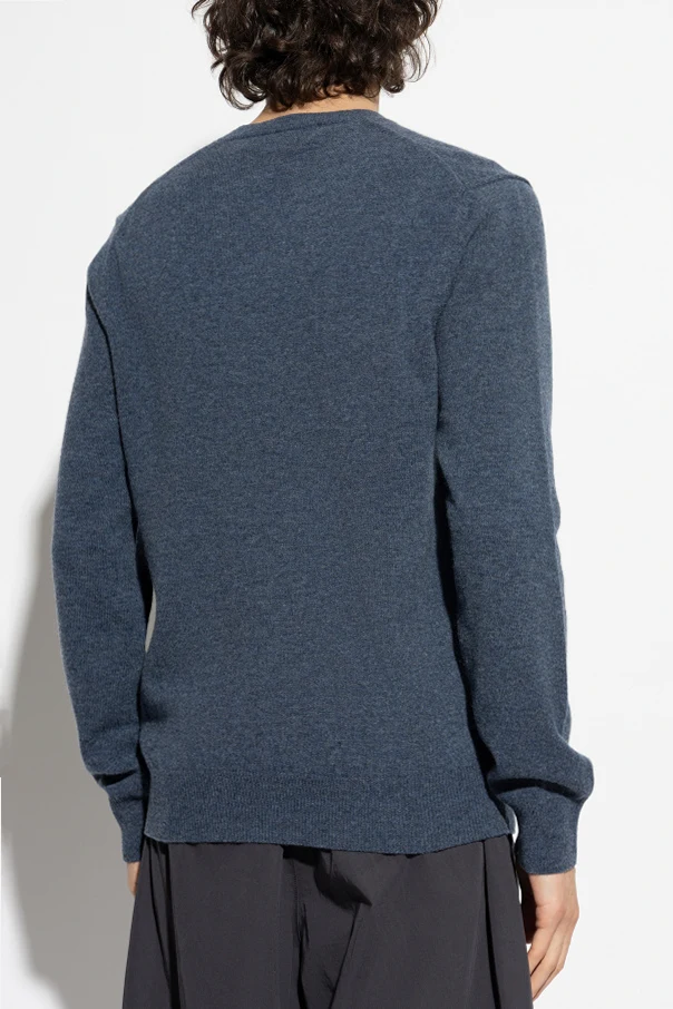 Entdecken Sie den subtilen Charme des V-Ausschnitt-Pullovers von der exklusiven Marke Comme des Garçons Play . Dieser blaue Pullover, hergestellt aus hochwertiger Wolle, vereint Klassik mit Moderne, was ihn zur idealen Wahl sowohl für legere als auch formellere Anlässe macht.