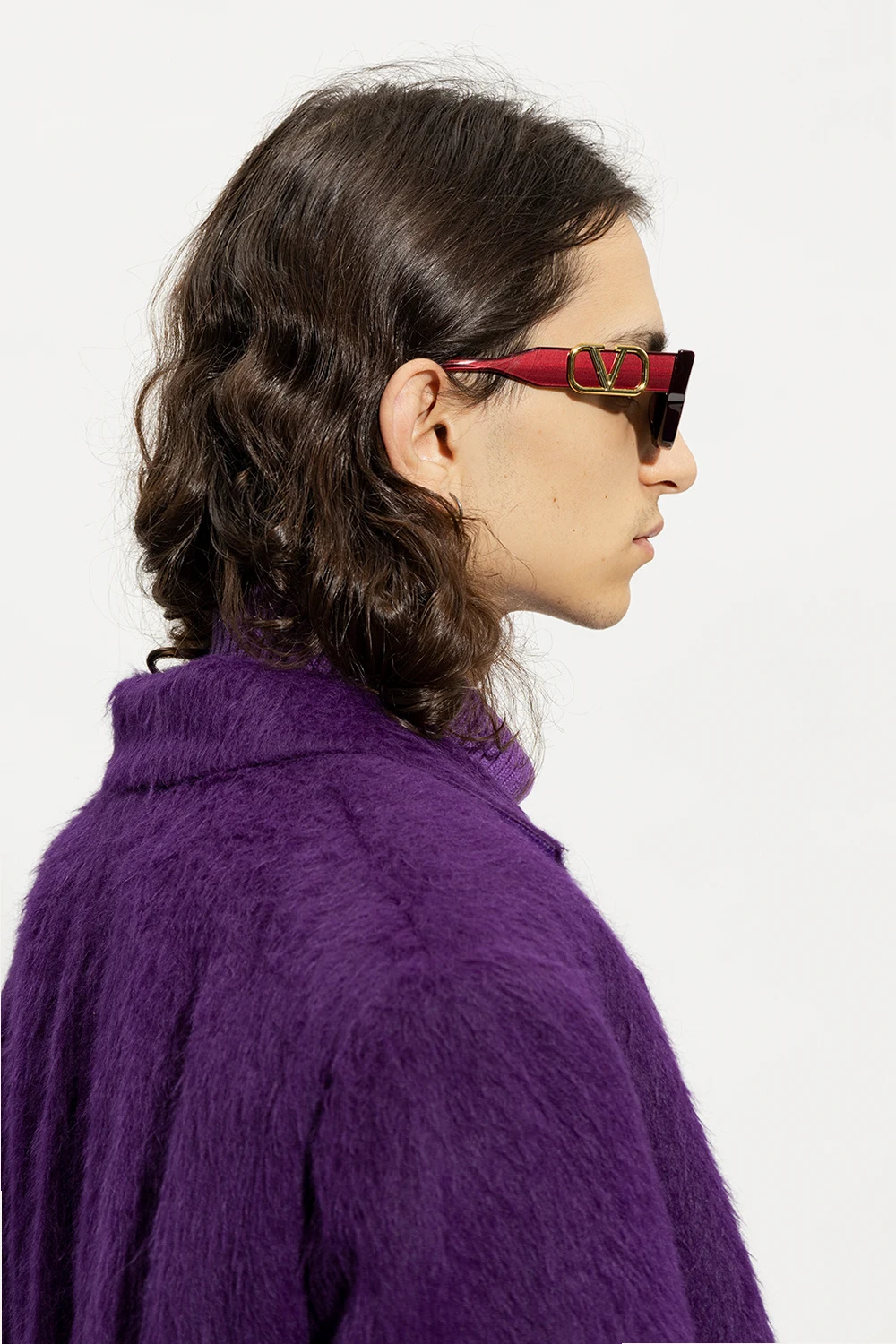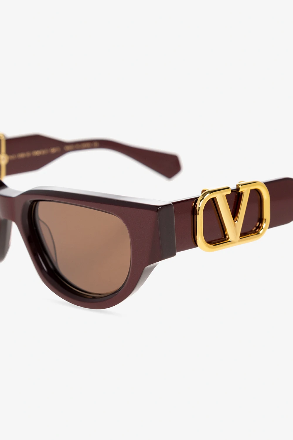 Maroon sunglasses from Valentino Eyewear. Made of Japanese acetate, this pair features cat-eye frames, temples with gold-tone VLogo titanium removable buckle and brown gradient lenses with 100% UV protection. Handcrafted in Japan. Comes with a recycled leather case with strap and cleaning cloth.
