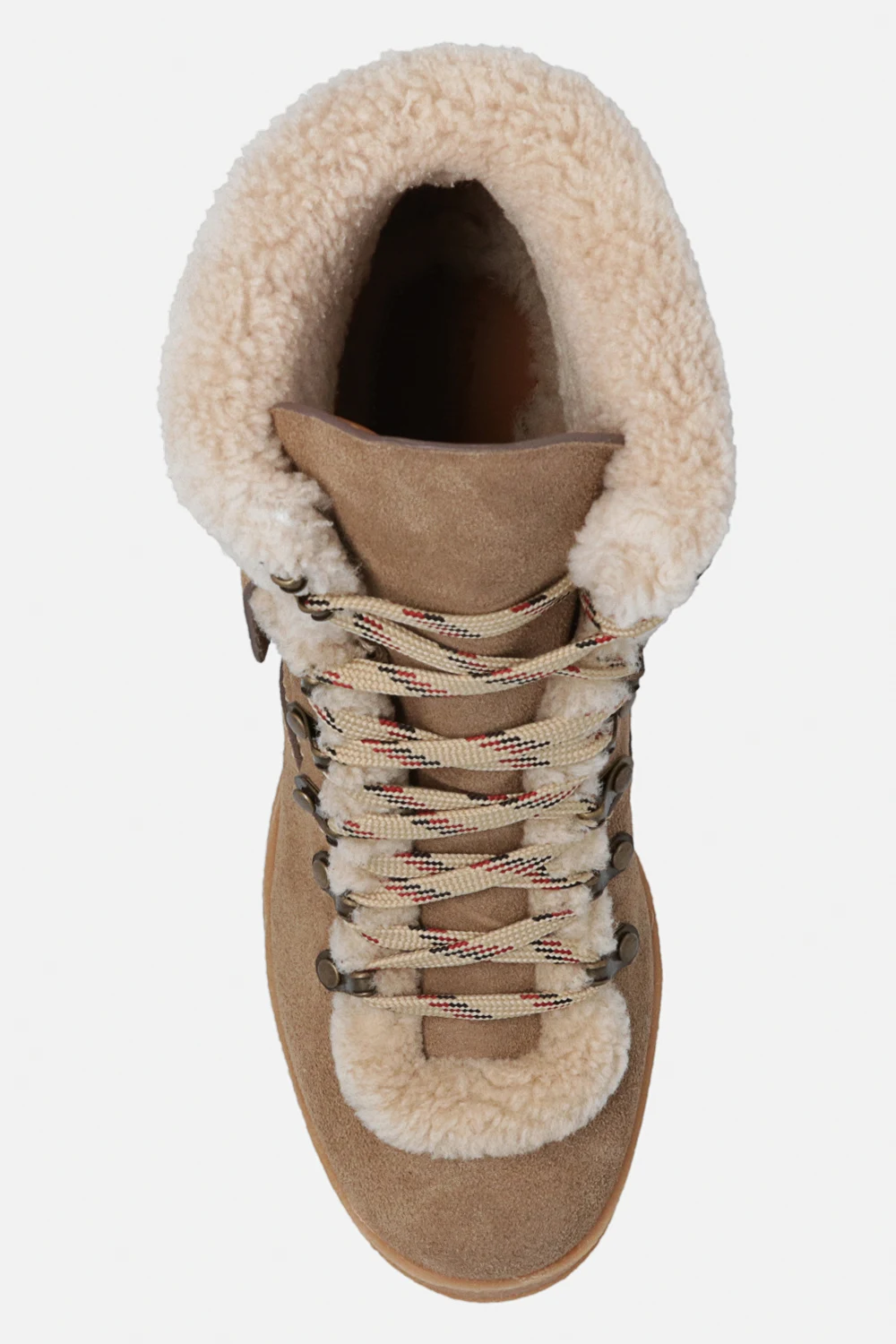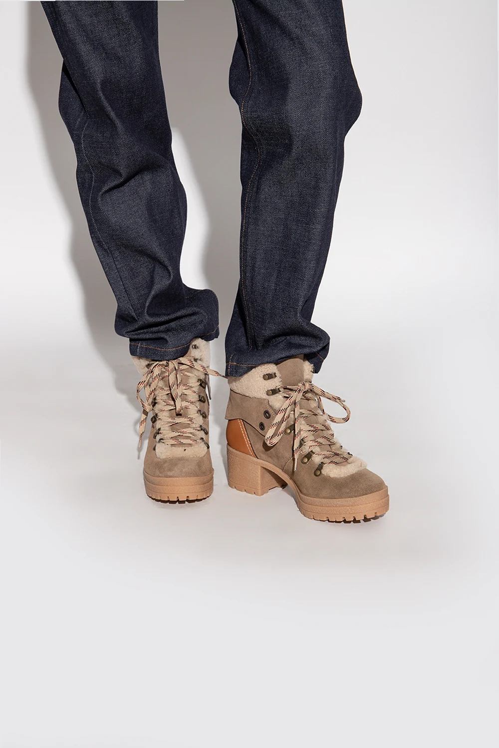 Beige and brown ‘Eileen’ heeled ankle boots from See By Chloe. Crafted from calf suede and lined with shearling, this lace-up model sits on a dark beige rubber sole and showcases the brand's logo.