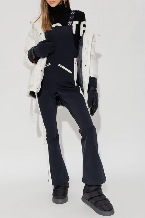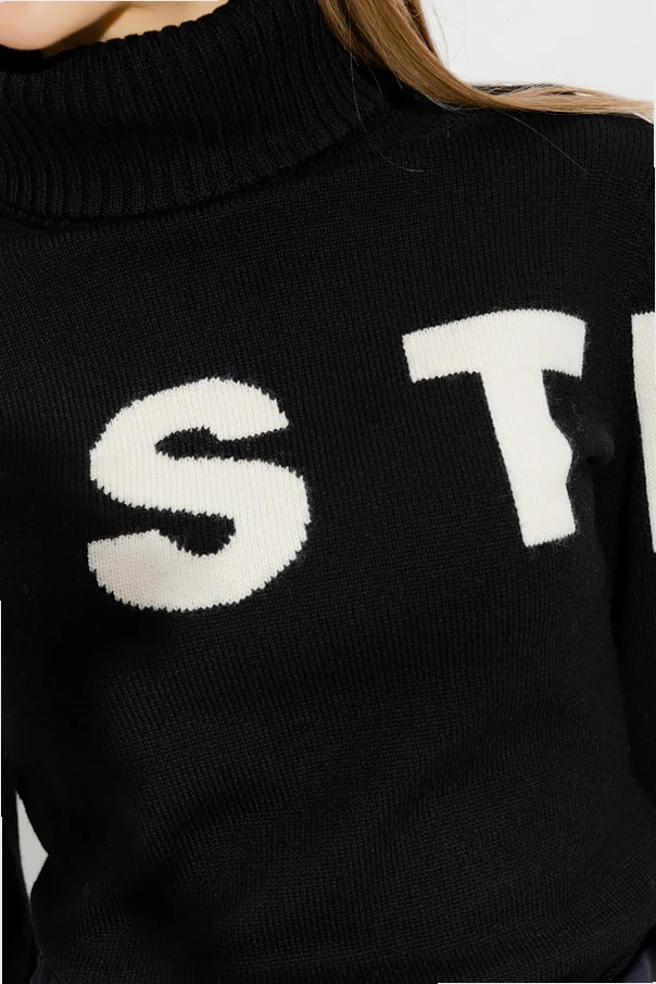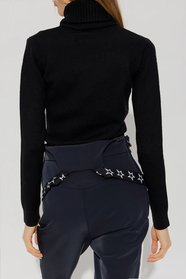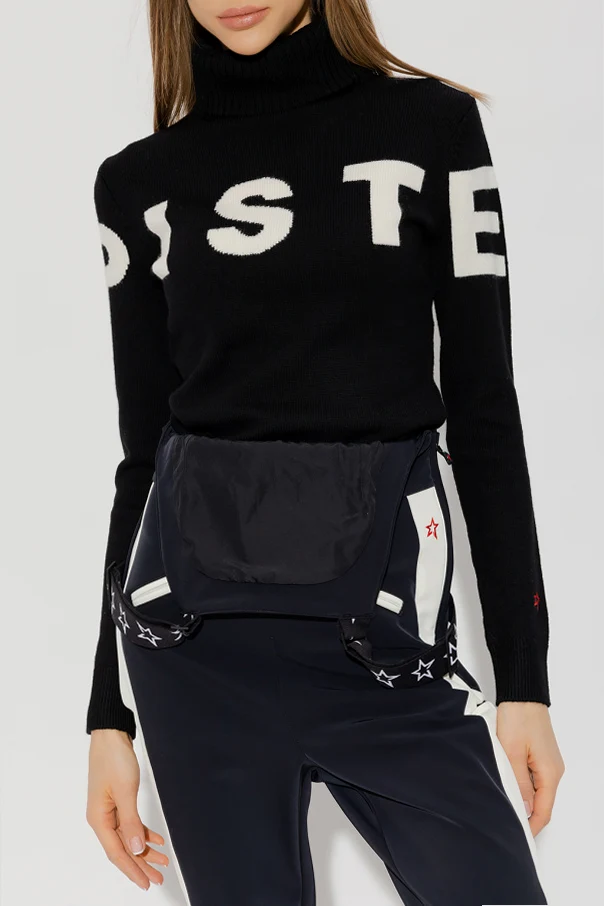 Black ‘Piste’ turtleneck sweater from Perfect Moment. Made of merino wool, this style showcases white lettering on the front, a snug collar, long sleeves and a ribbed bottom hem and cuffs.