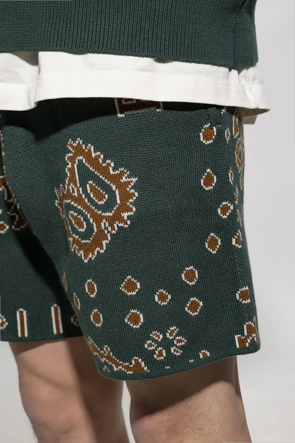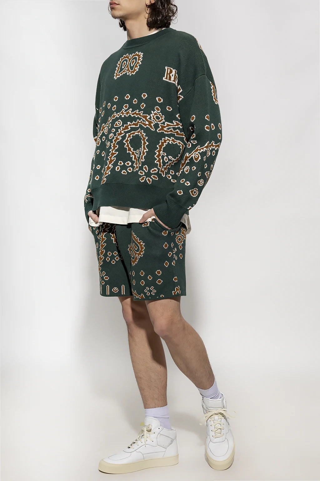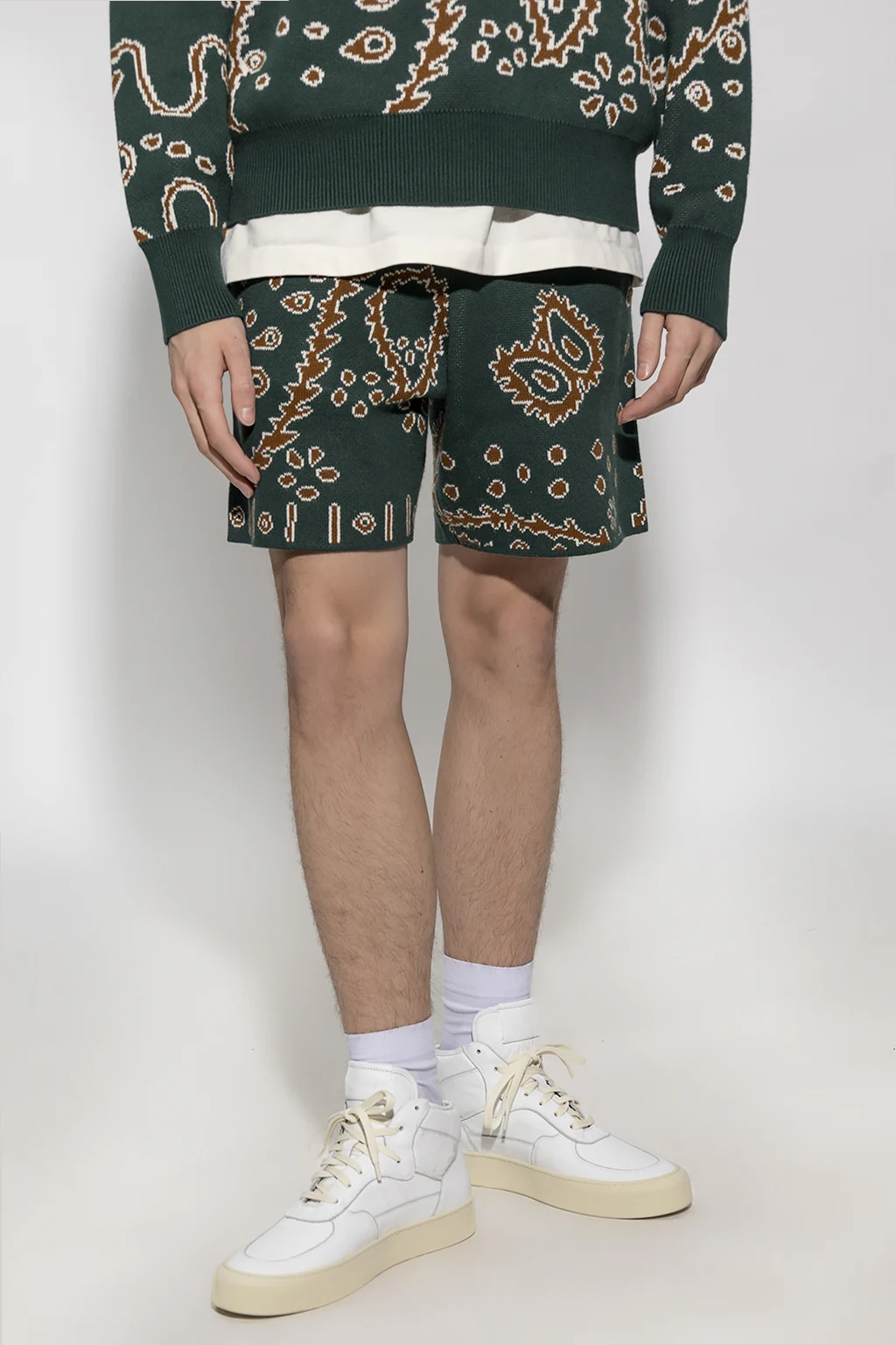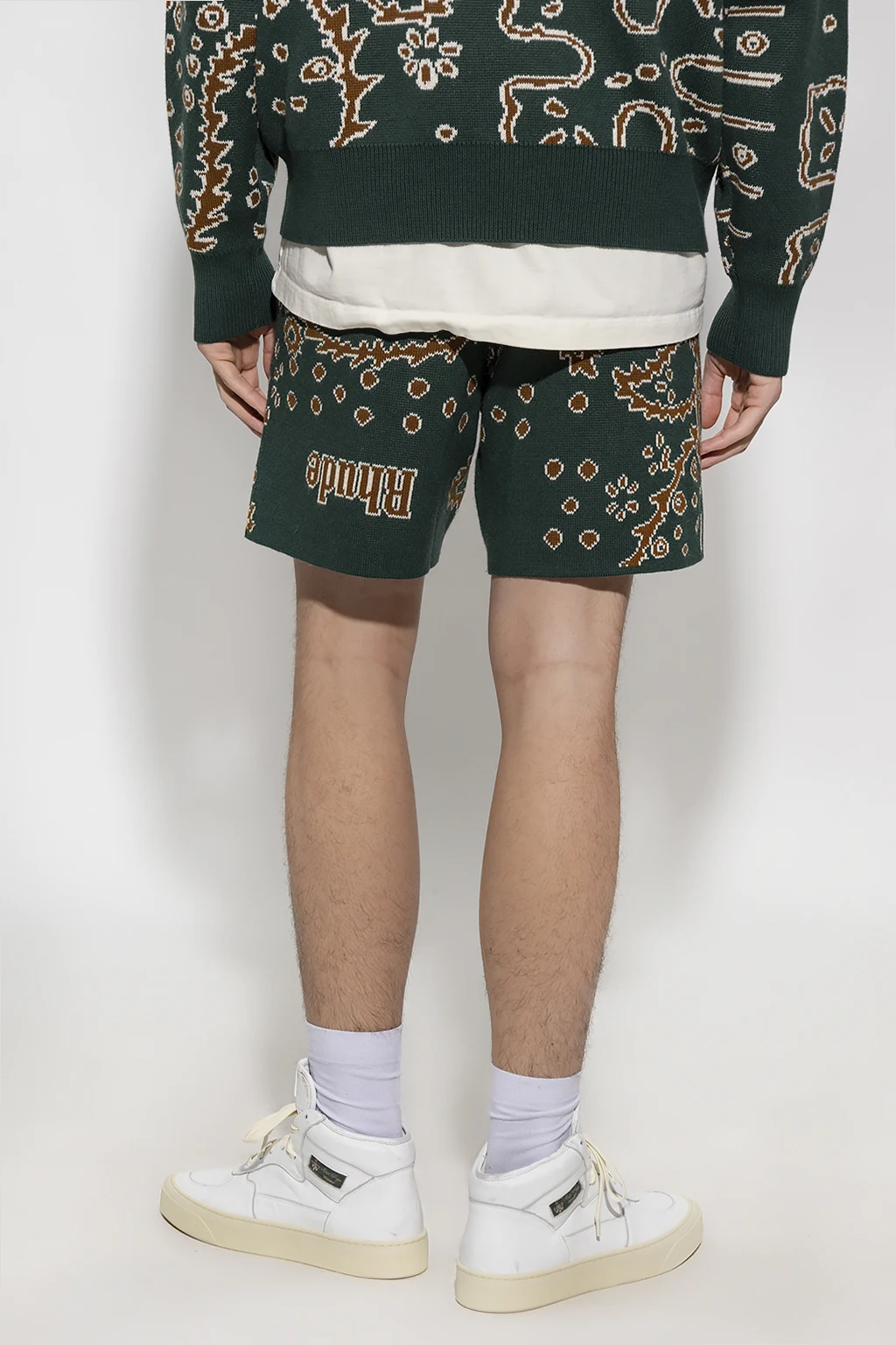 Dark green shorts from Rhude. Crafted from a cotton and cashmere blend, this pair is cinched with drawstrings at the waist and features a decorative brown and white pattern, logo detailing and three slip pockets.