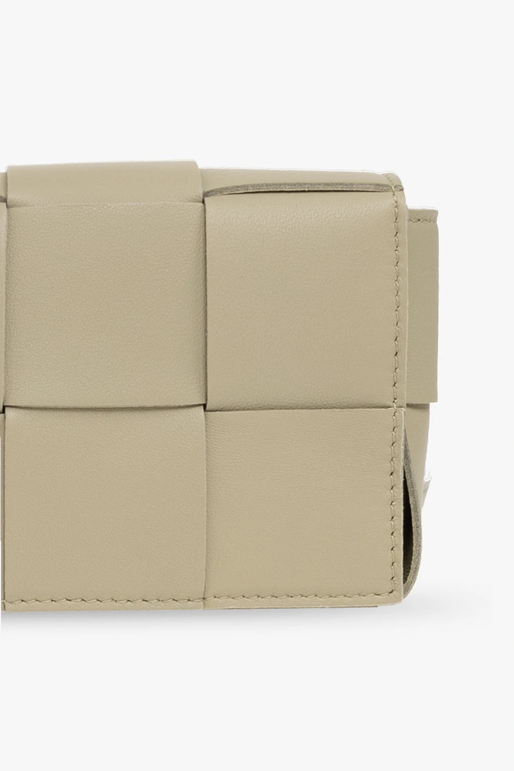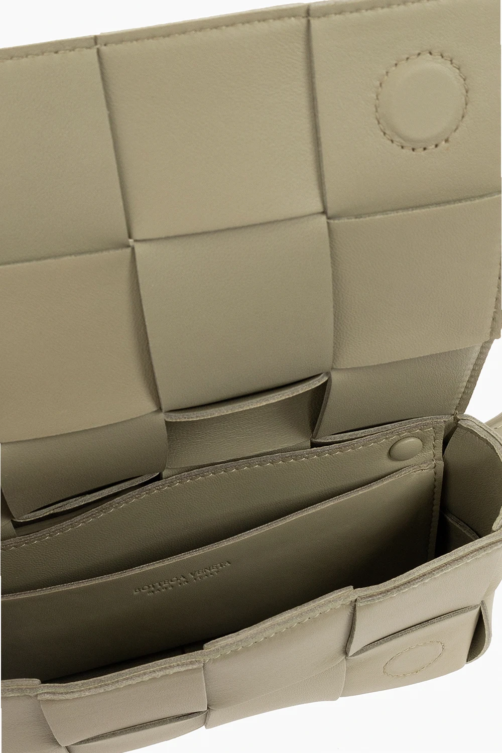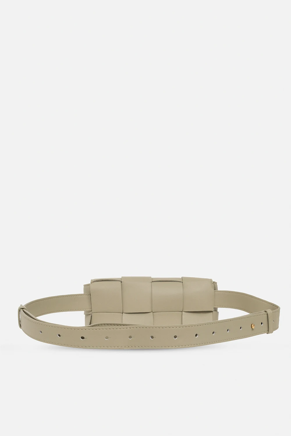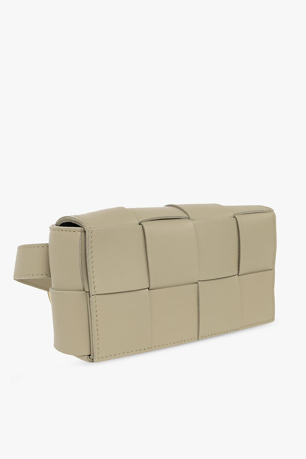 Greenish grey ‘Cassette Mini’ belt bag from Bottega Veneta. Made from lamb leather with the brand's signature Intreccio weave, this design secures with magnetic snaps and features an adjustable strap, gold-tone metal hardware and one slip pocket inside.