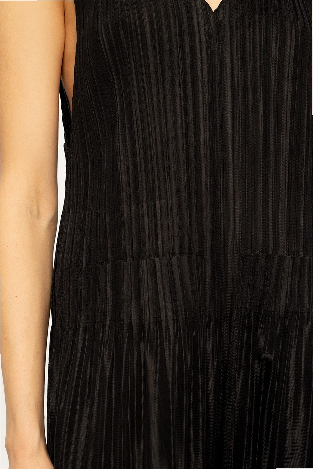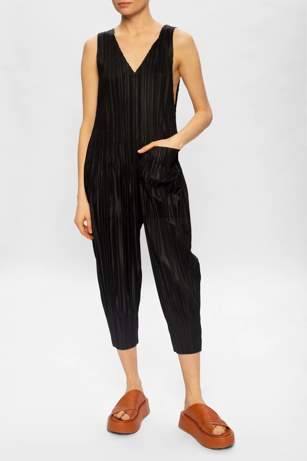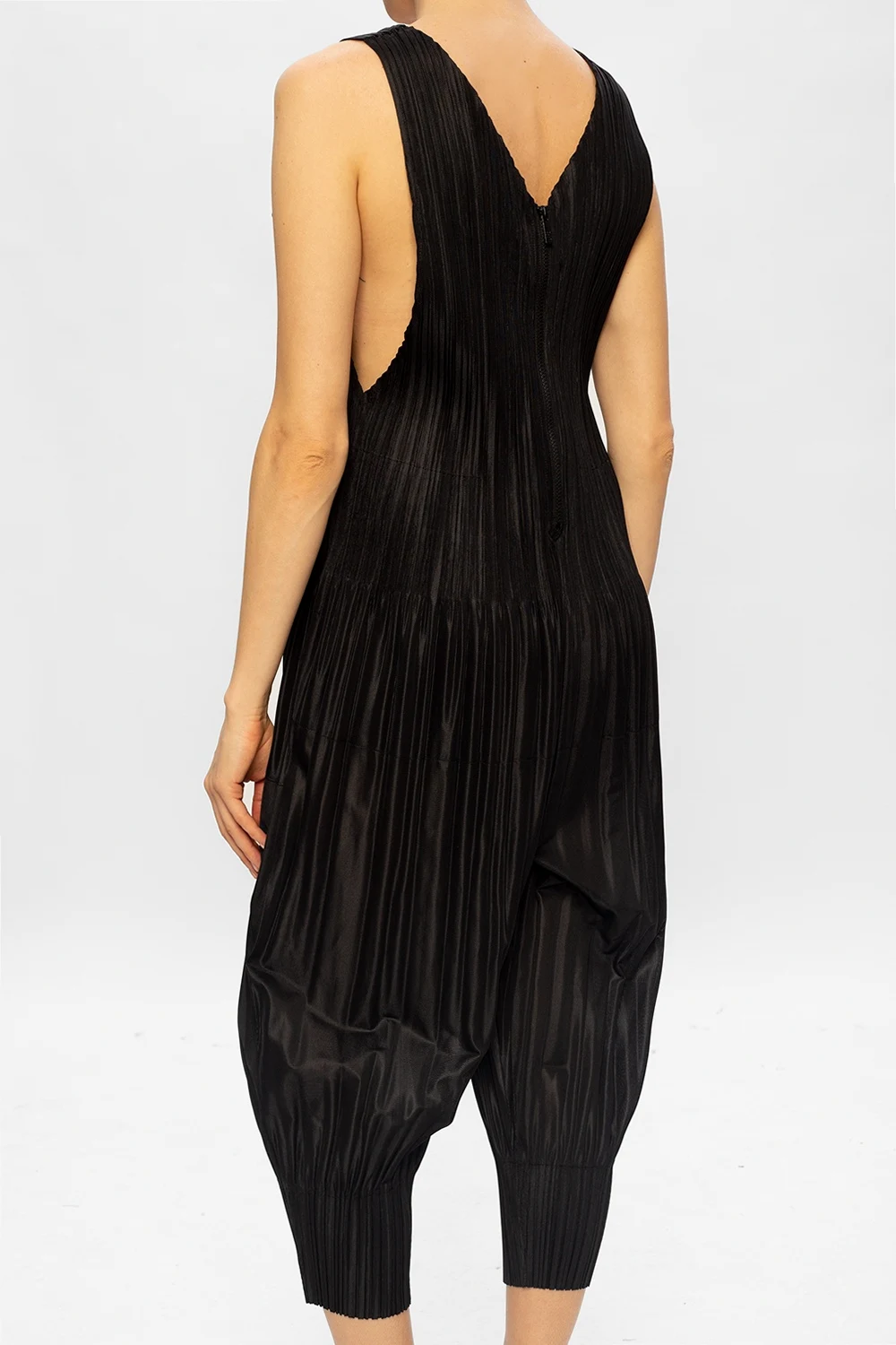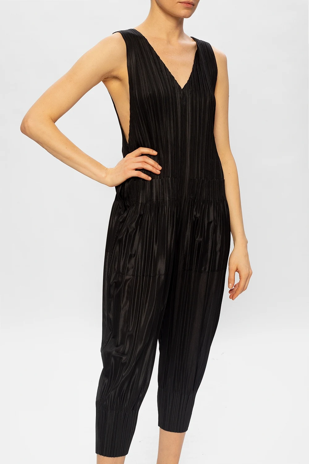Black slip jumpsuit from Issey Miyake Pleats Please. Arrayed with the label's signature pleating, this style falls down with legs that taper towards the ankles and features a back zip fastening, two frontal pockets, a V-shaped neckline and a sleeveless silhouette.