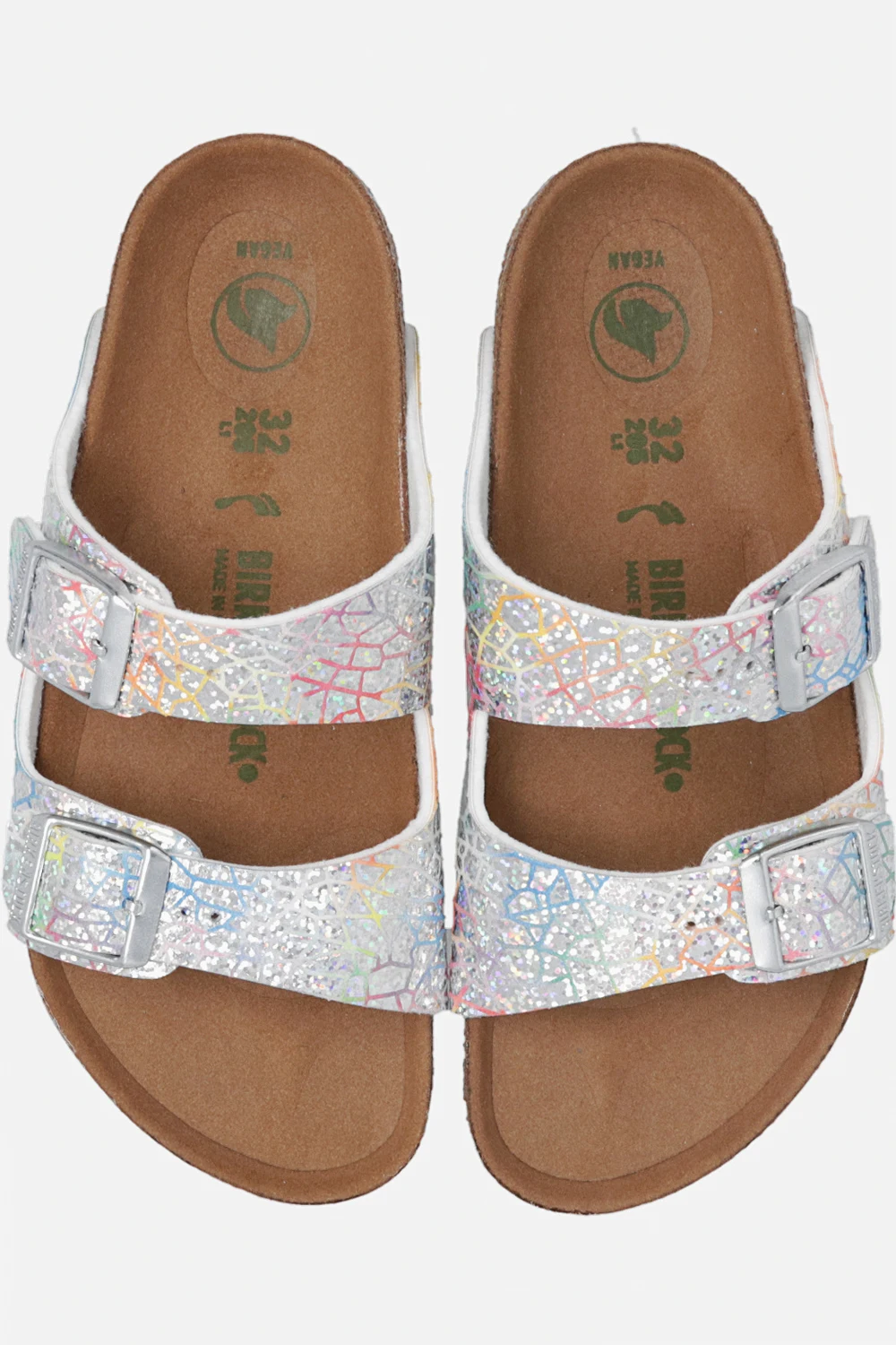 Multicolored ‘Arizona’ slides with a metallic effect from Birkenstock. Resting on a white EVA foam sole with a cork footbed, this pair is complete with straps featuring logo-embossed buckles in silver-tone.