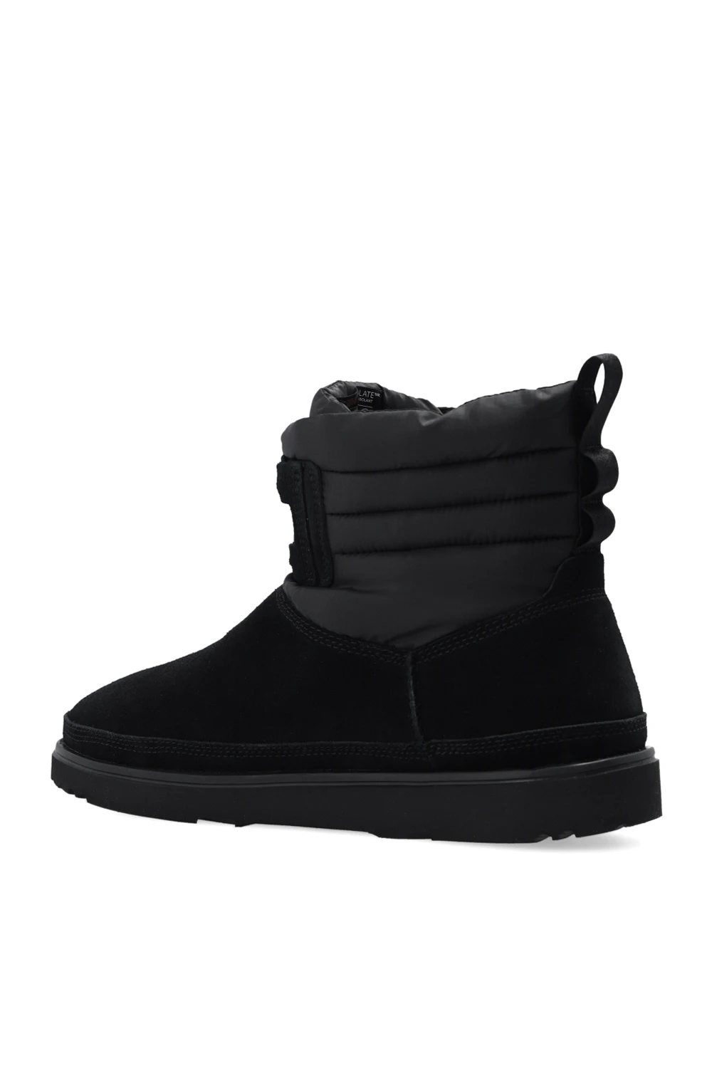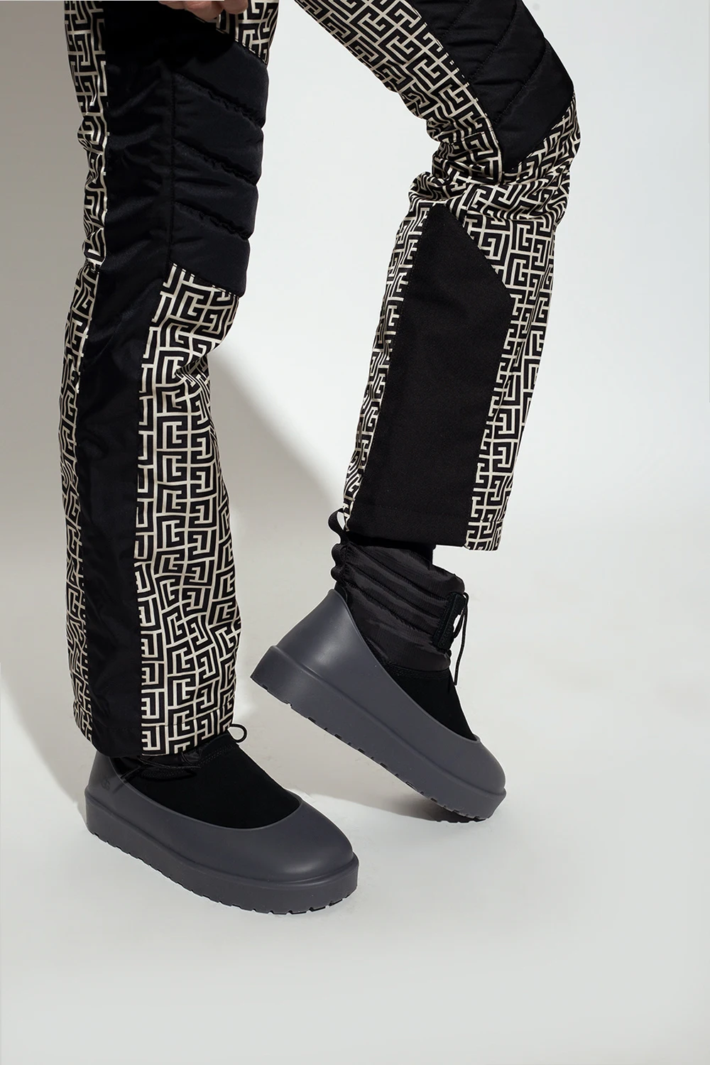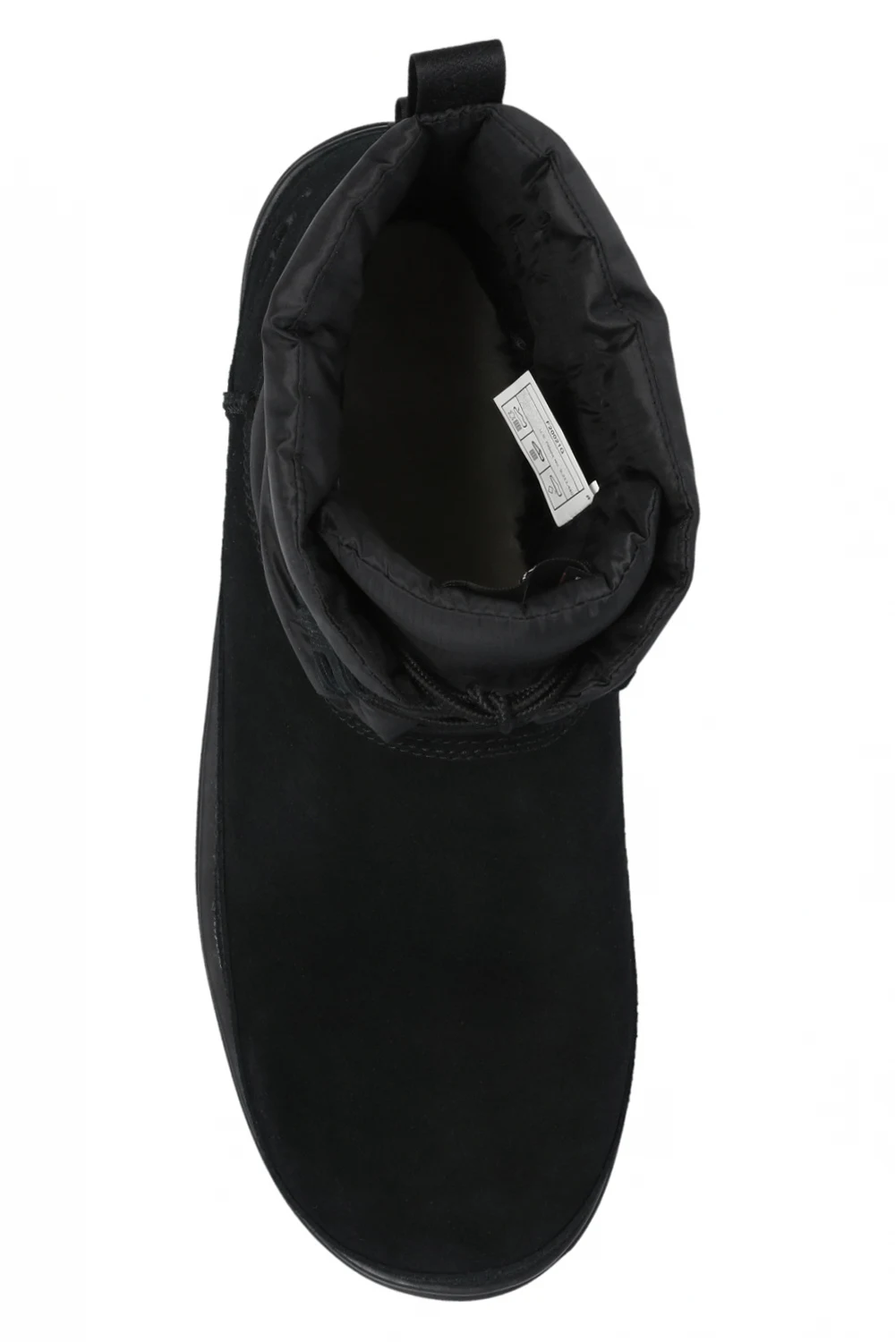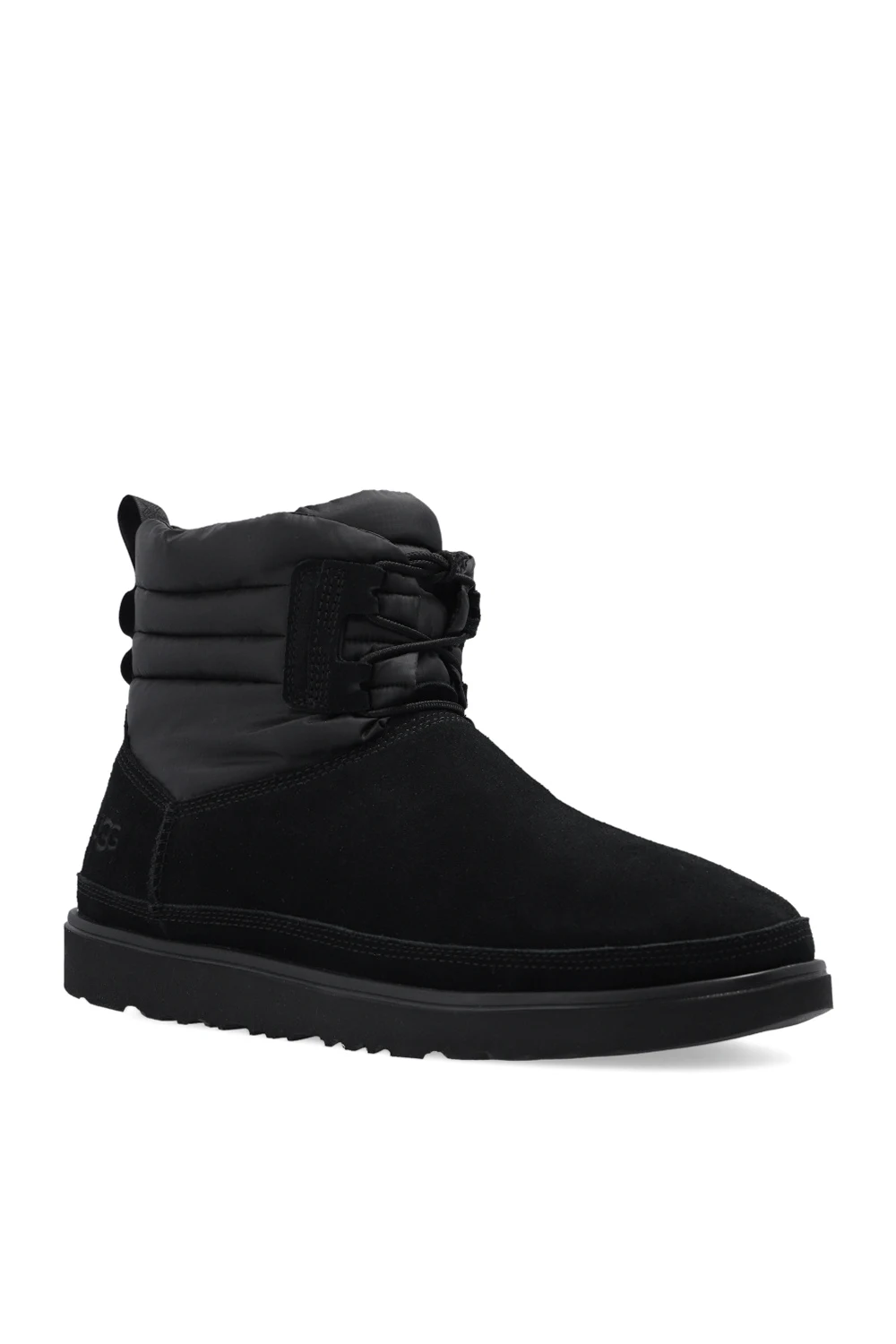 Black ‘M Classic Mini Lace-Up Weather’ snow boots from UGG. Made with innovative and exceptionally durable Ripstop and suede, this lace-up model sits on a black rubber sole and features an innovative DryTech membrane to ensure enhanced protection from the elements, Responsible Down Standard certified down padding, UGGplush™ wool insole and included grey rubber galoshes.