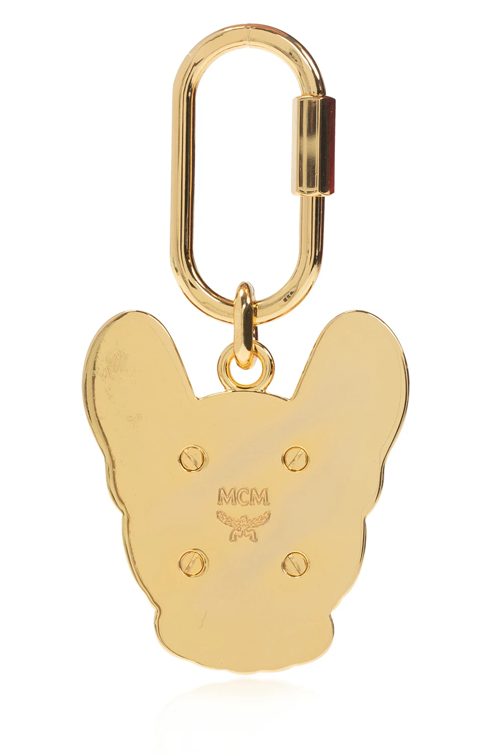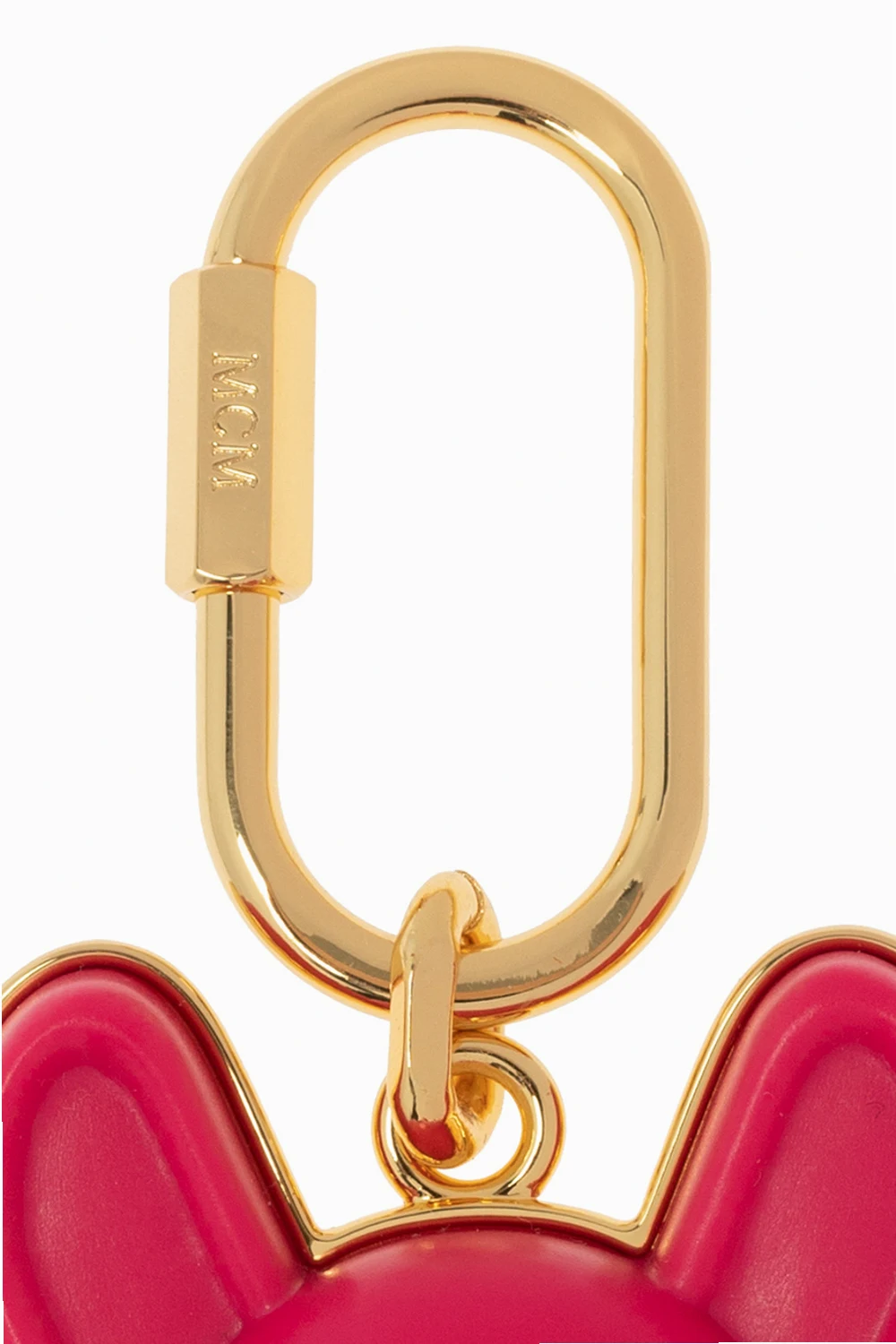 Dark pink and gold-tone ‘M Pup’ keyring from MCM. Fastened with a snap hook, this item features an M Pup charm, engraved logo at the back and metal hardware plated with 24k gold.