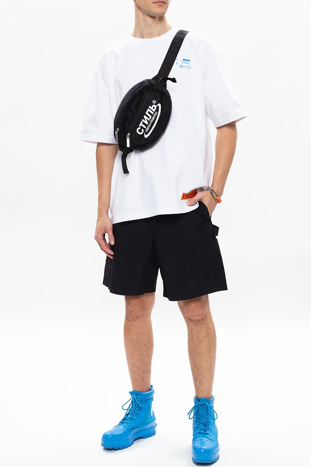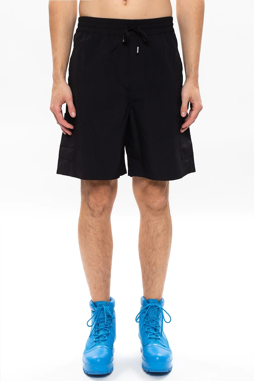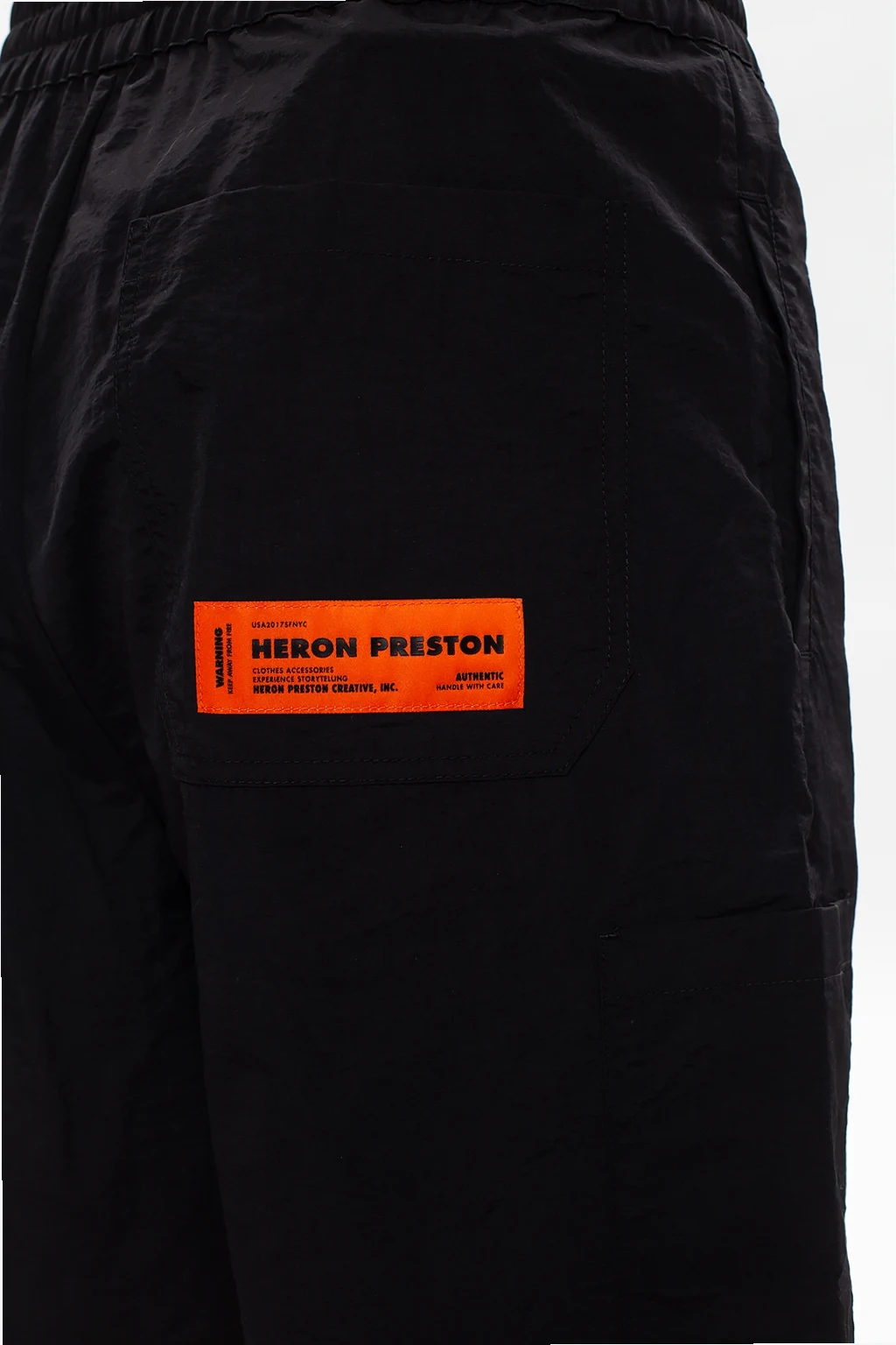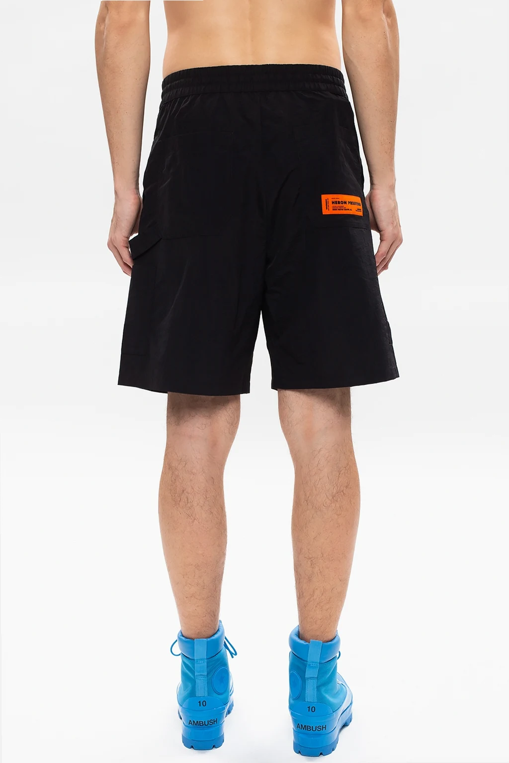 Black shorts from Heron Preston. Fastened with drawstrings, this design features an orange and black logo patch and is complete with two front, two side and two rear pockets.