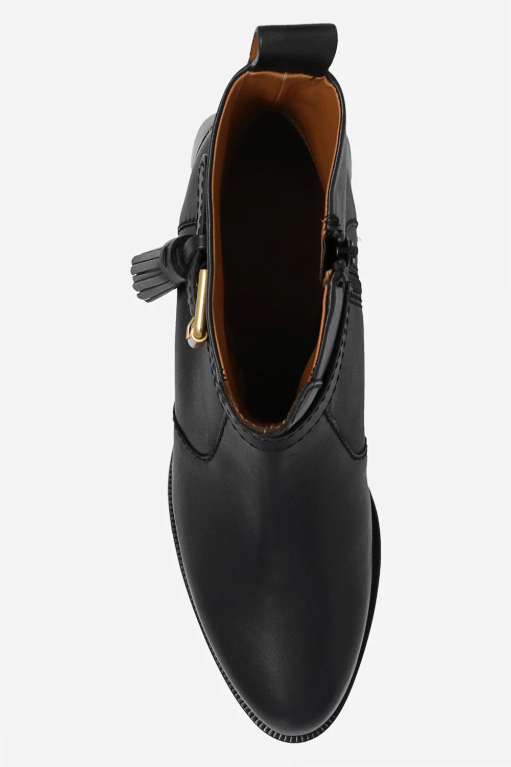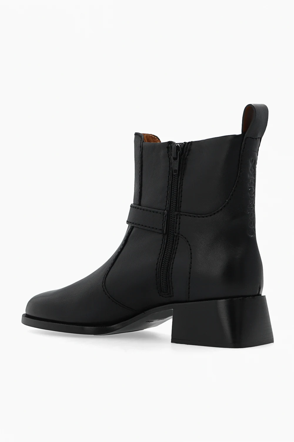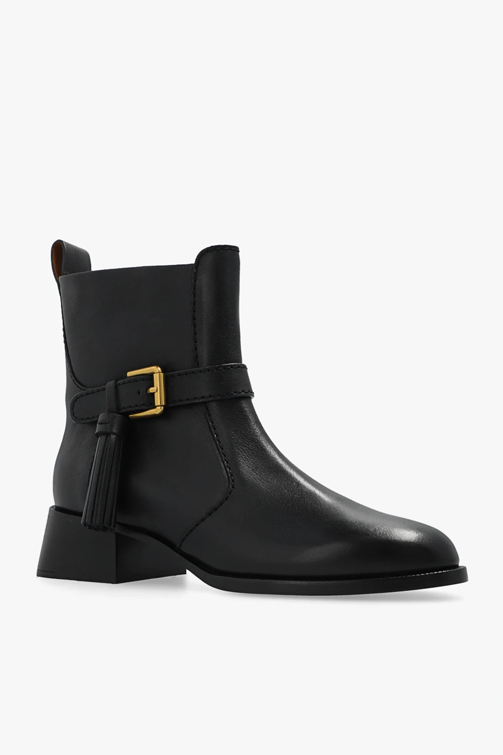 Black ‘Lory’ heeled ankle boots from See By Chloe. Crafted from calf leather, this model sits on a black rubber sole and features a side zipper, a distinctive gold-tone buckle with fringes and an embossed logo at the back.