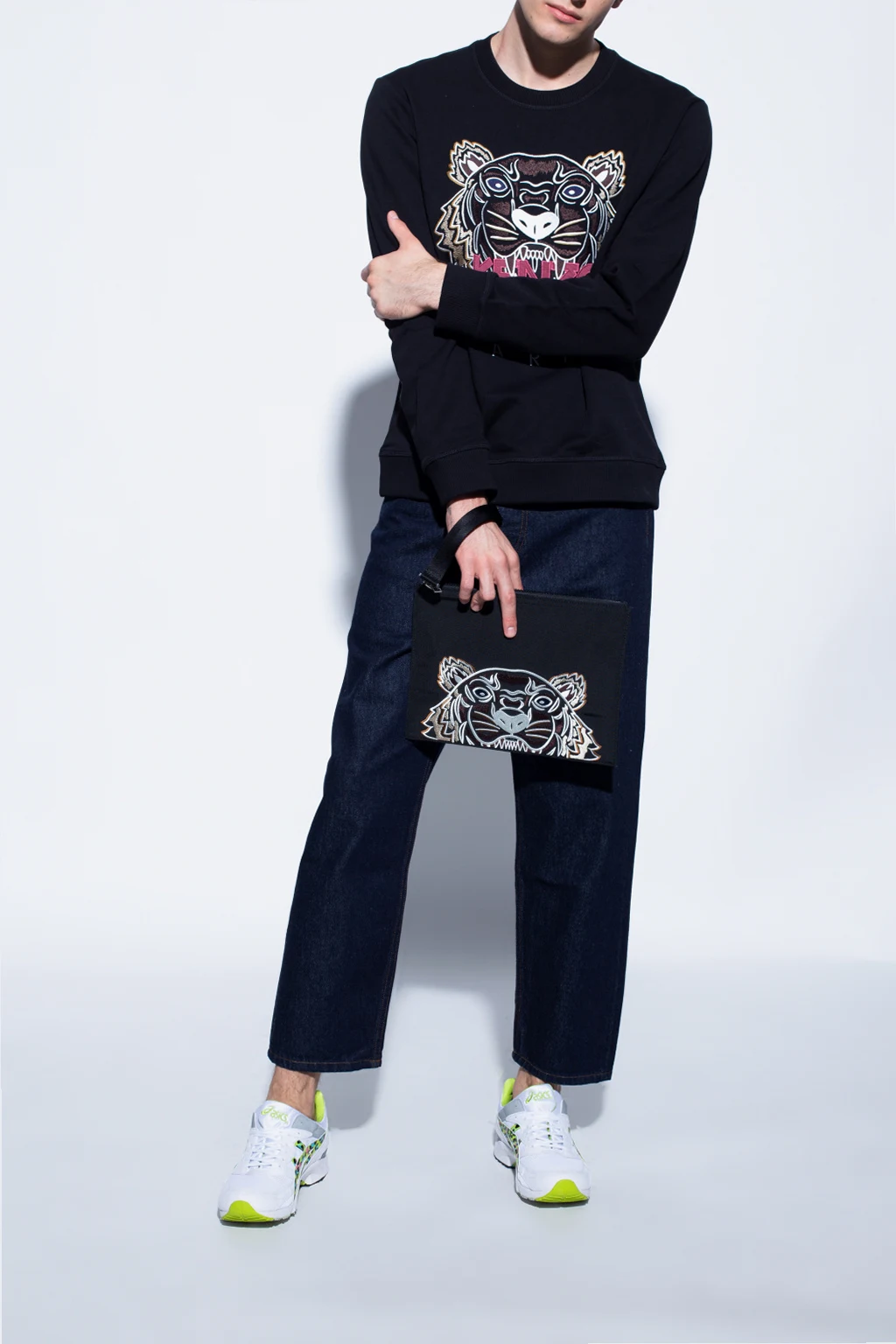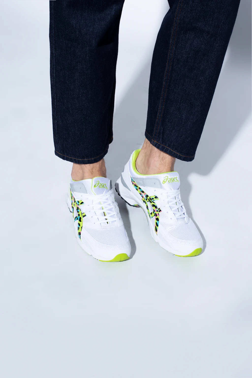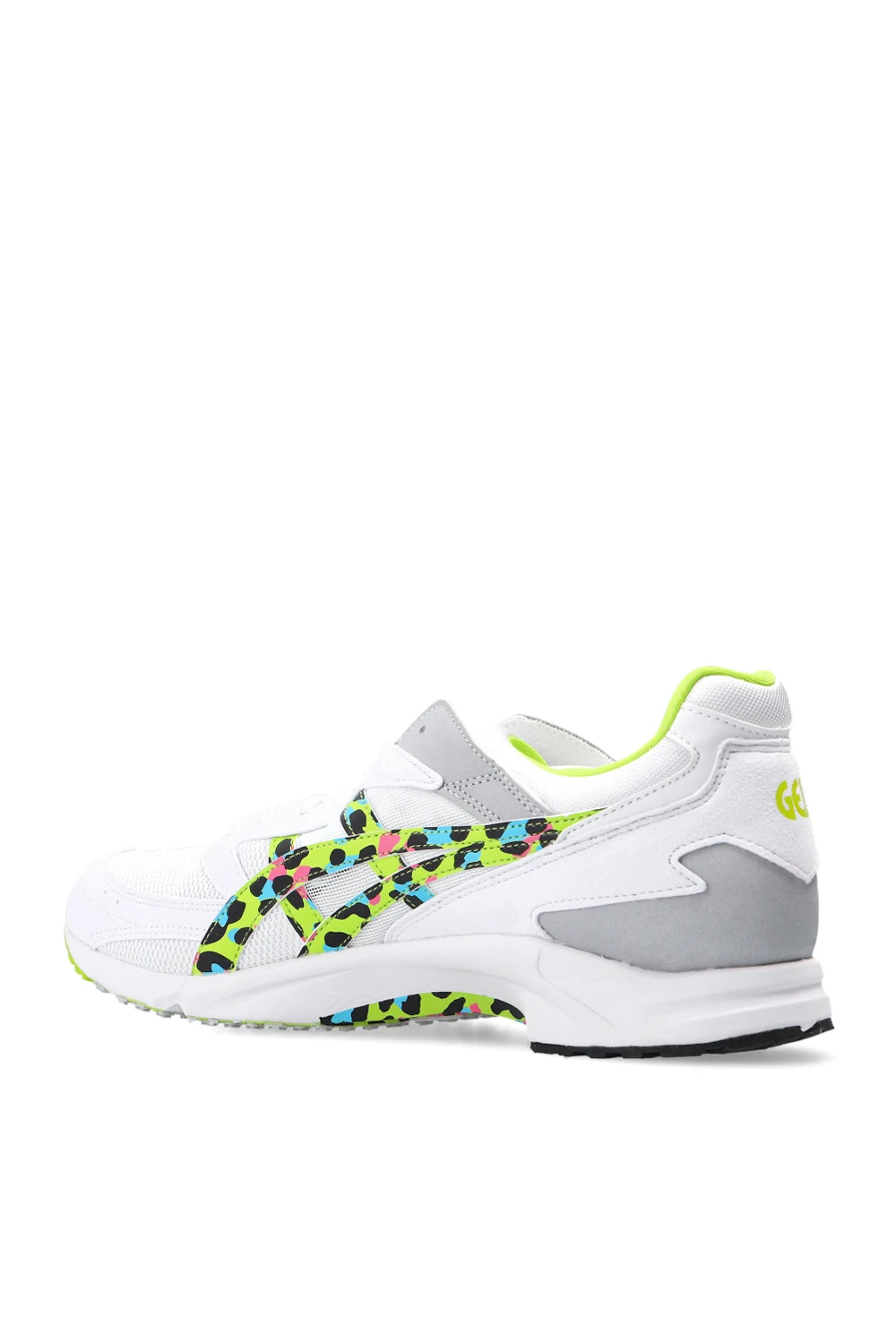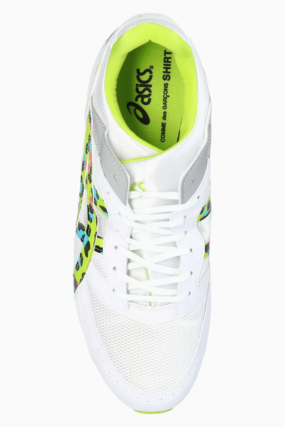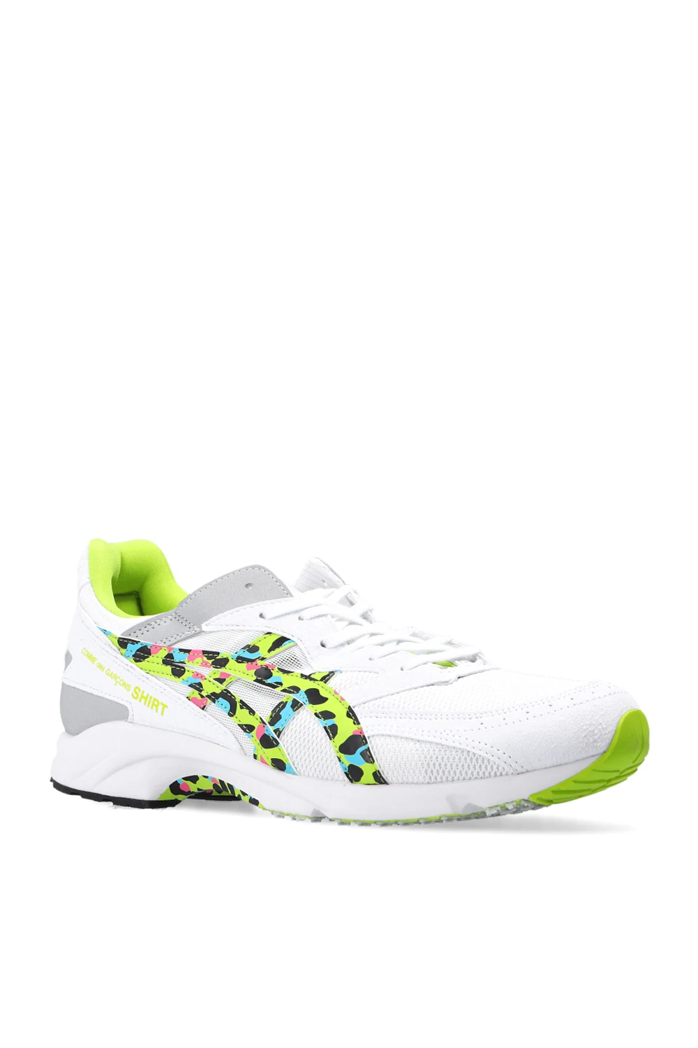 White and grey ‘Tarther SC’ sneakers from Comme des Garcons Shirt x Asics. Featuring a mesh upper, this lace-up pair is complete with a double tongue embroidered with a light green logo, the label’s signature patch with a leopard print and rubber sole in white, black and green.