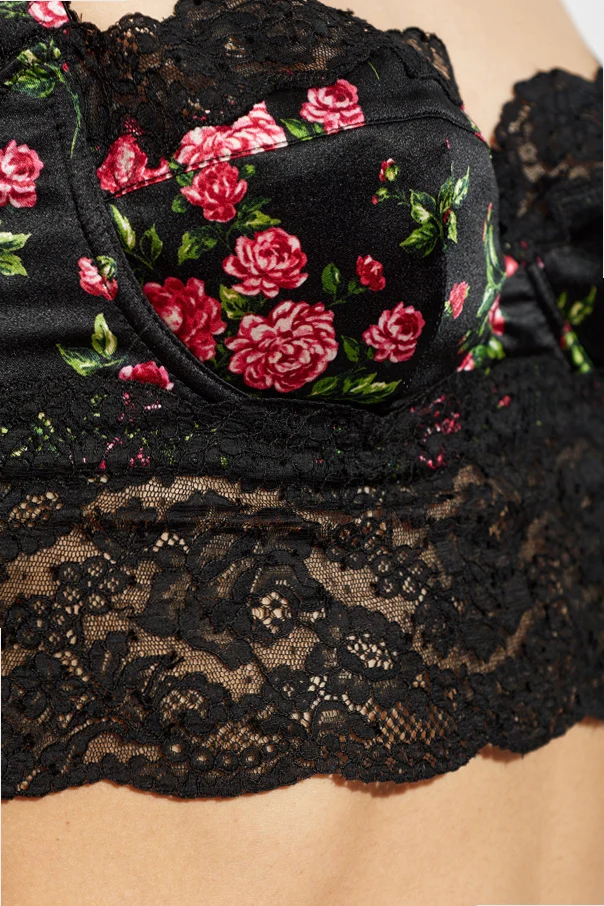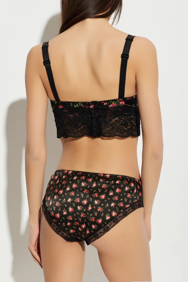 Black bra from Dolce & Gabbana. This item fastens via hook & eye closures on the back and showcases adjustable shoulder straps and a patch with a floral motif.