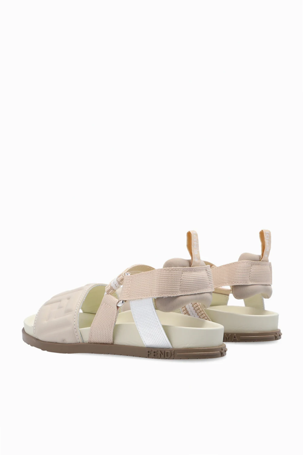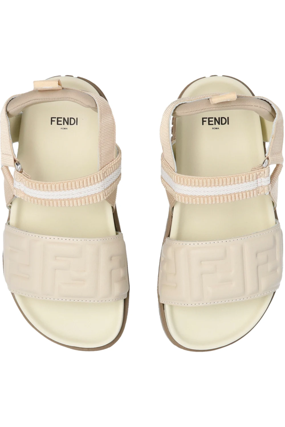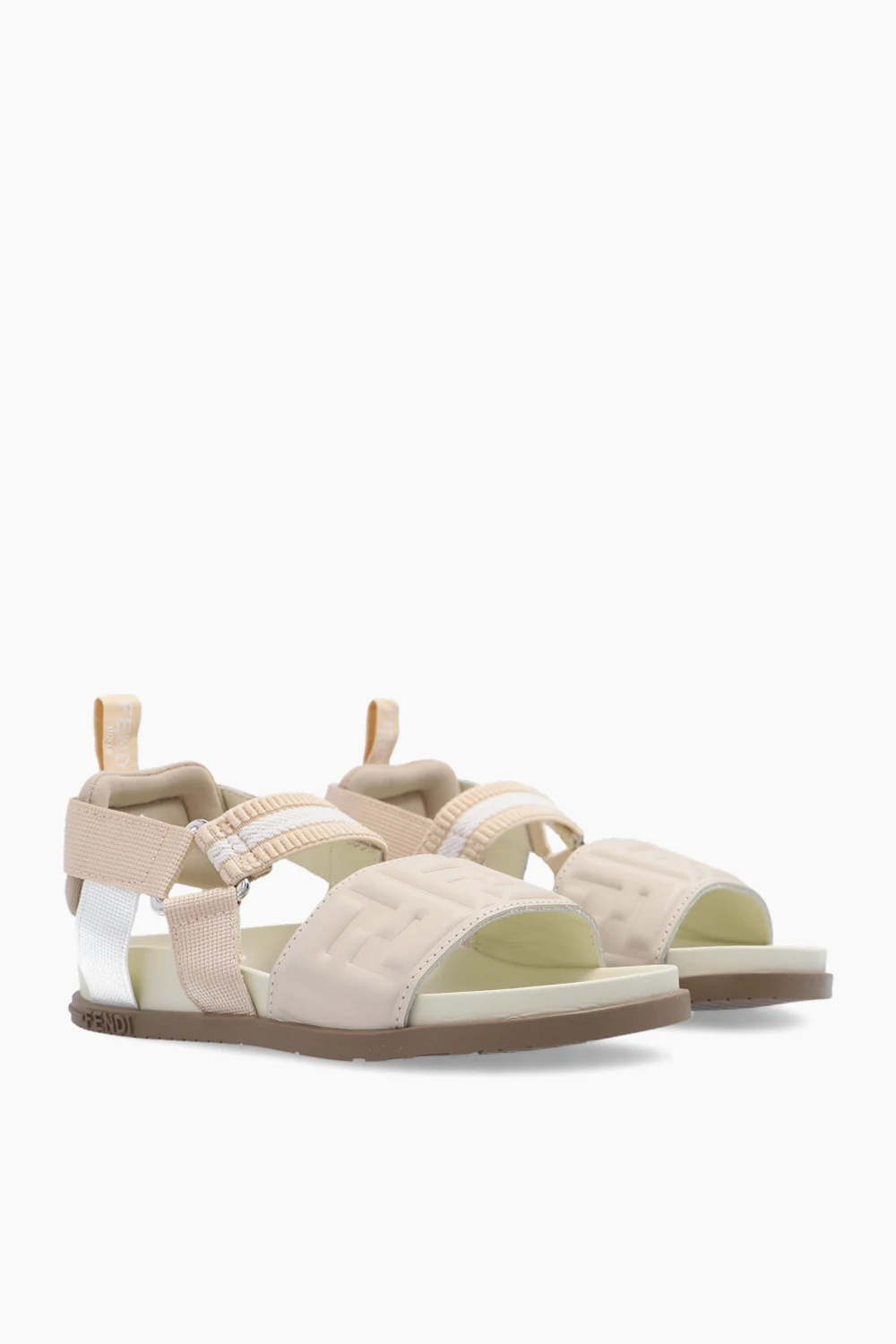 Cream, beige and white sandals from Fendi Kids. Sitting on a brown rubber sole, this model features a velcro closure and raised branding on the front.