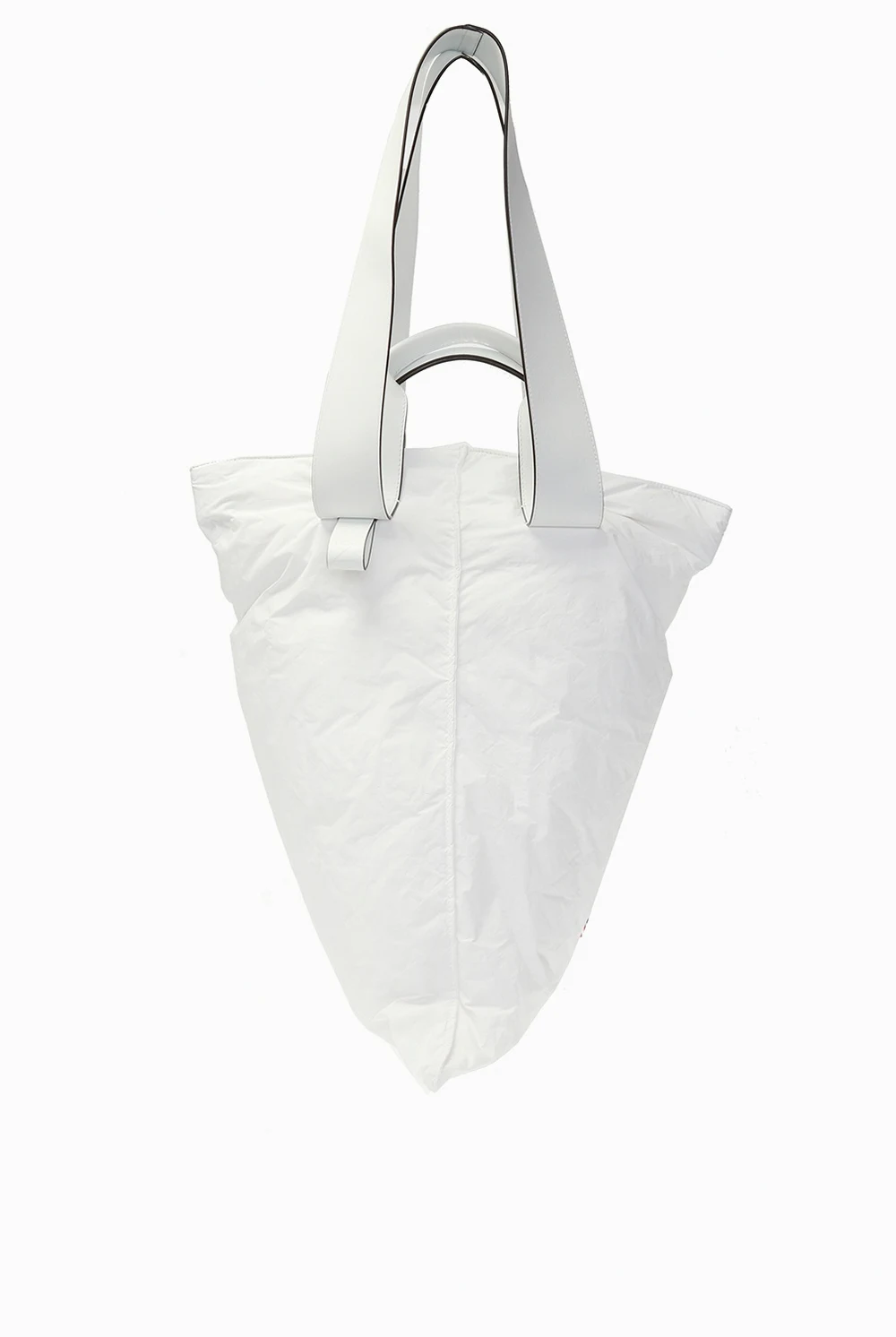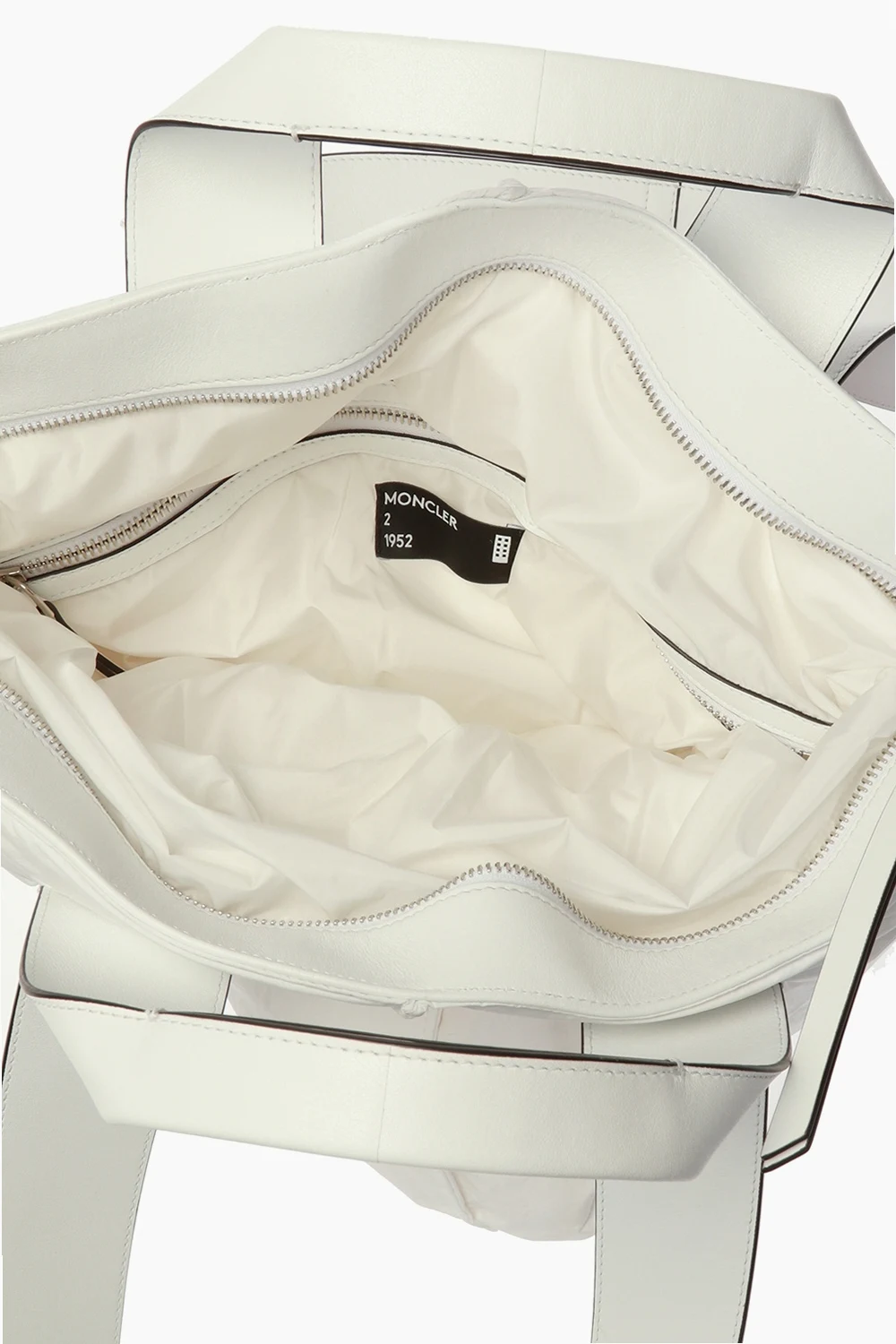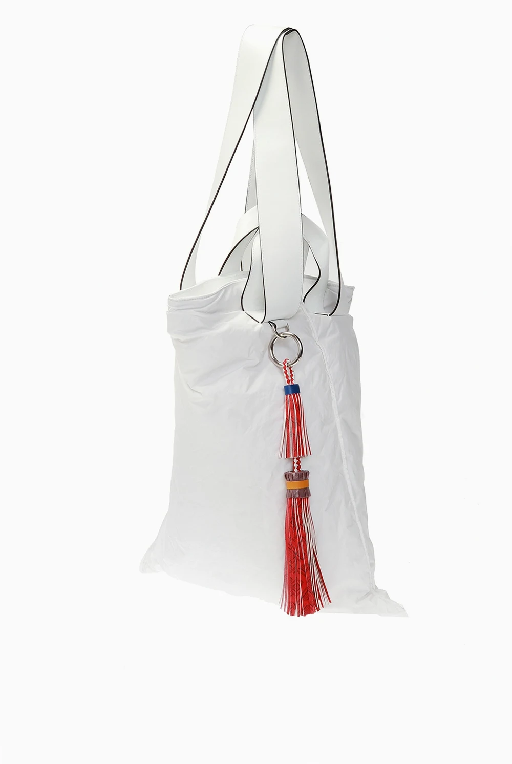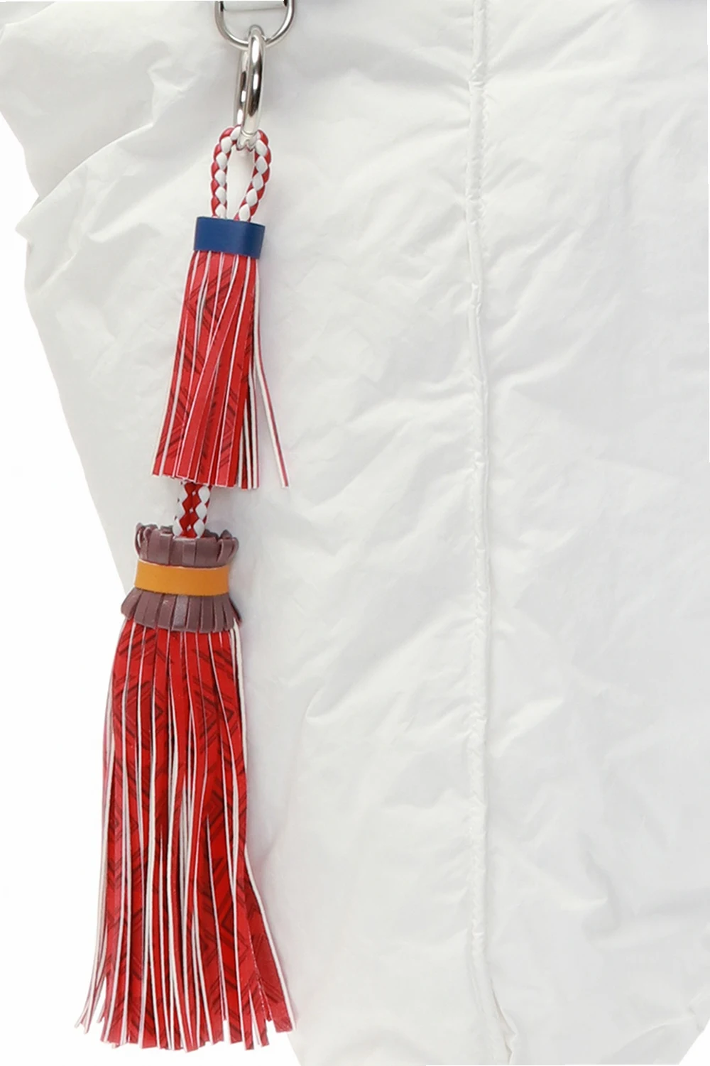 White shoulder bag from Moncler Genius, ‘1952 no.2’ collection. Zip fastening. Features two half-round handles and two shoulder straps. Comes with a detachable decorative charm with red tassels. Main internal compartment with a zip pocket. Silver-tone metal hardware.