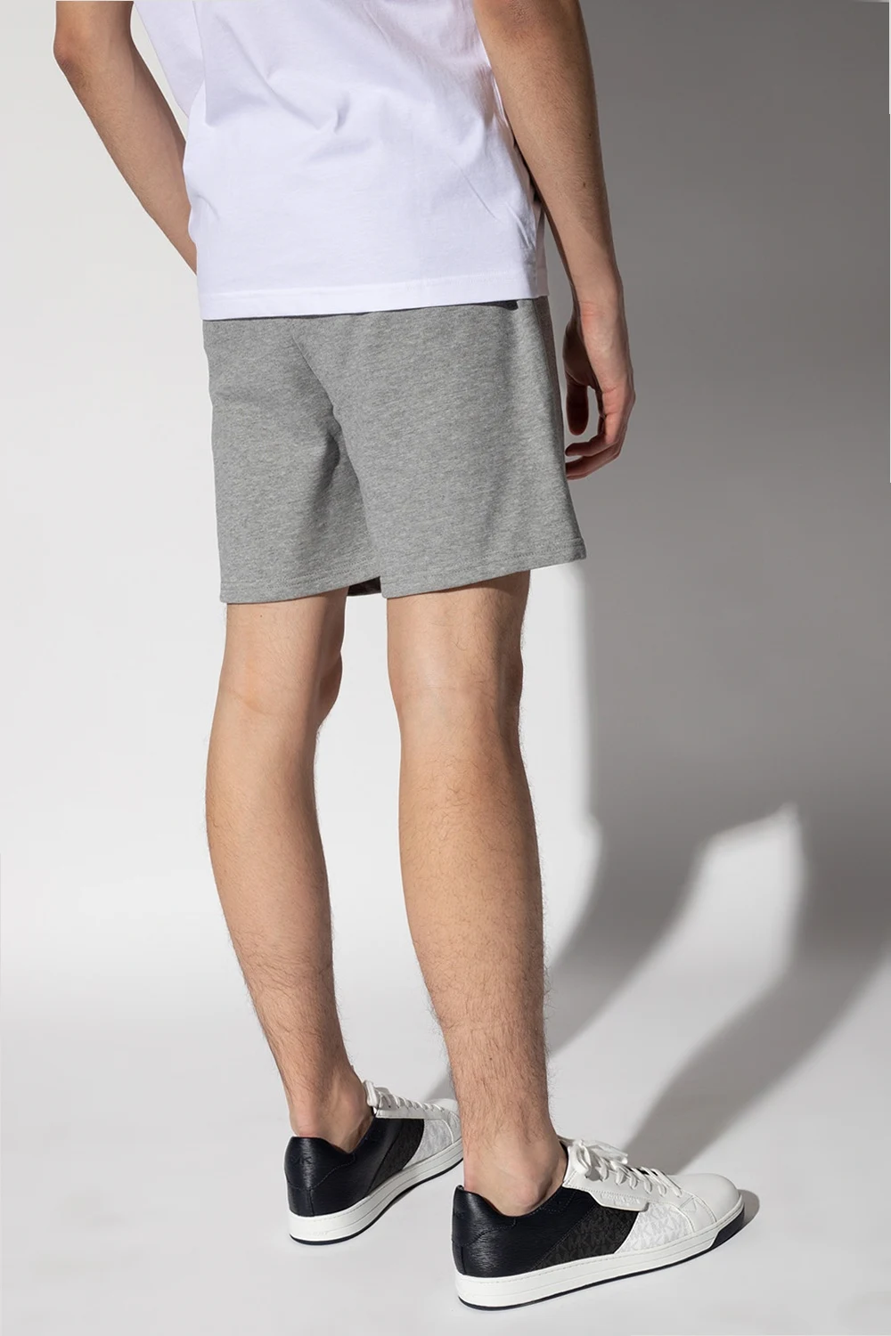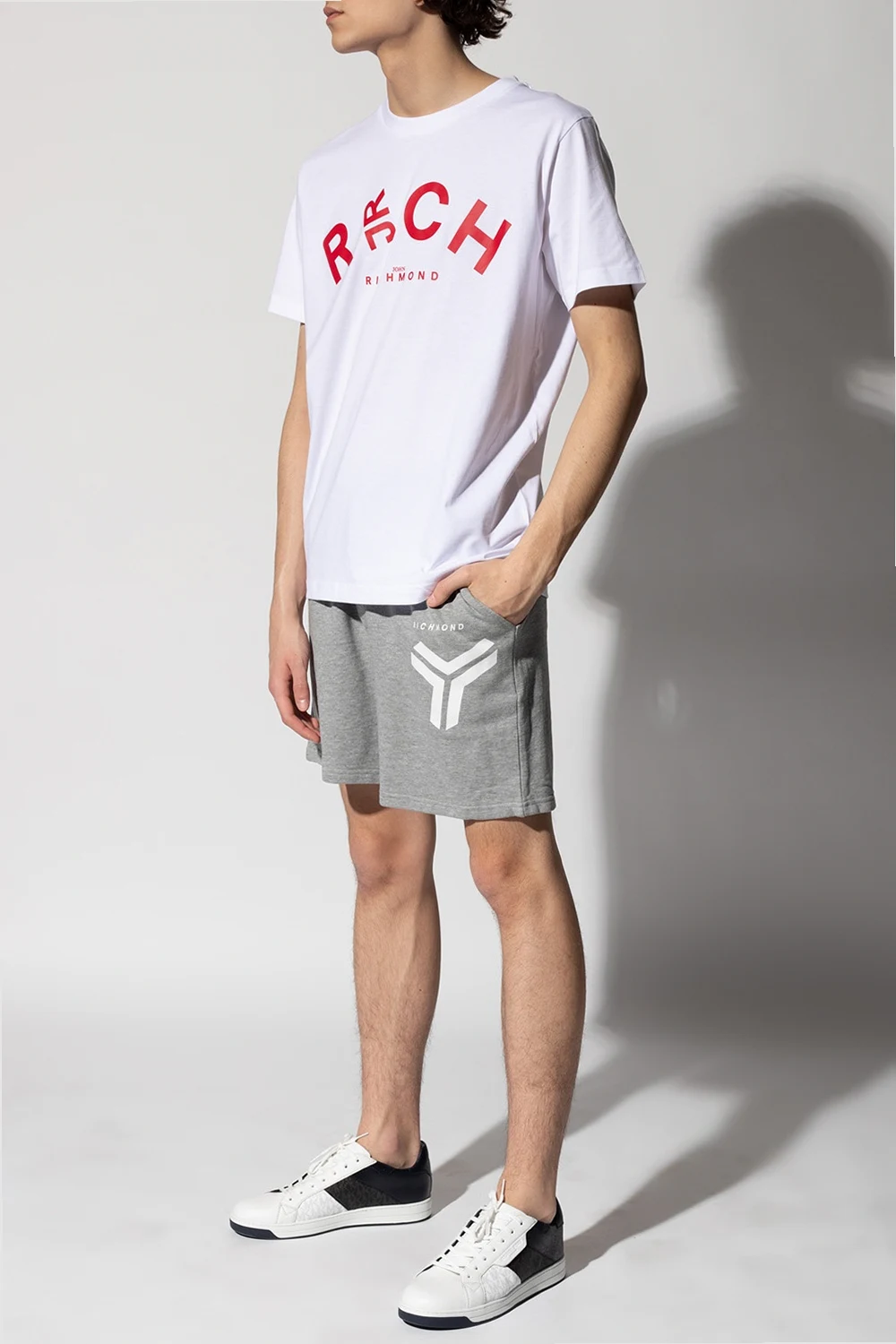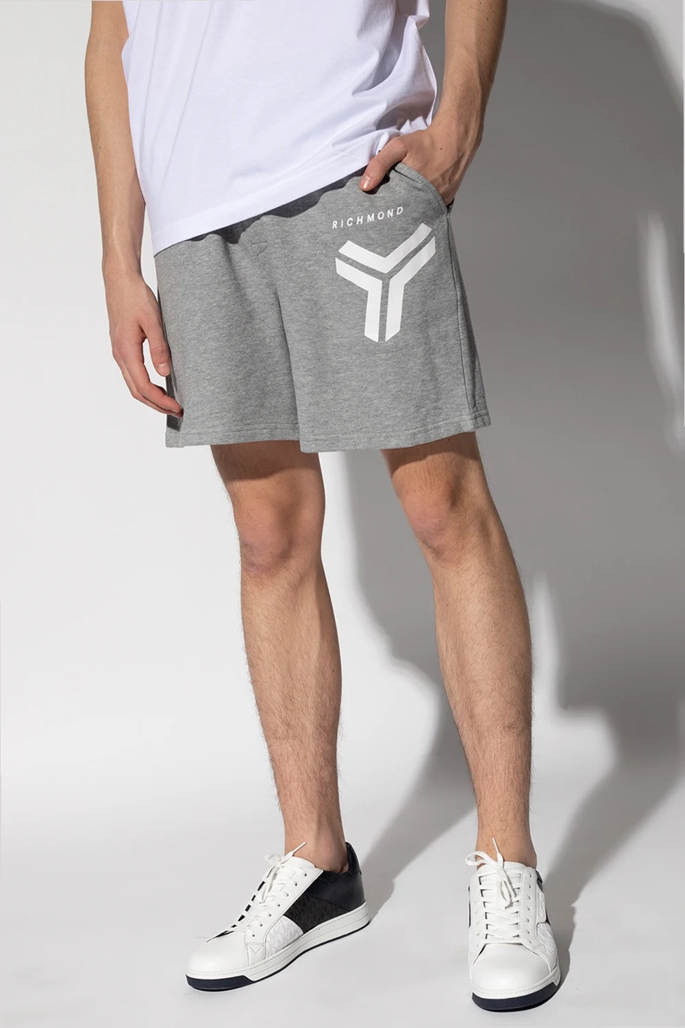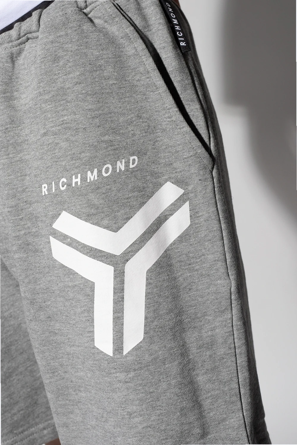Grey shorts from John Richmond. Crafted from cotton, this design features a printed logo pattern in white, elastic waistband with drawstrings and two slip pockets.