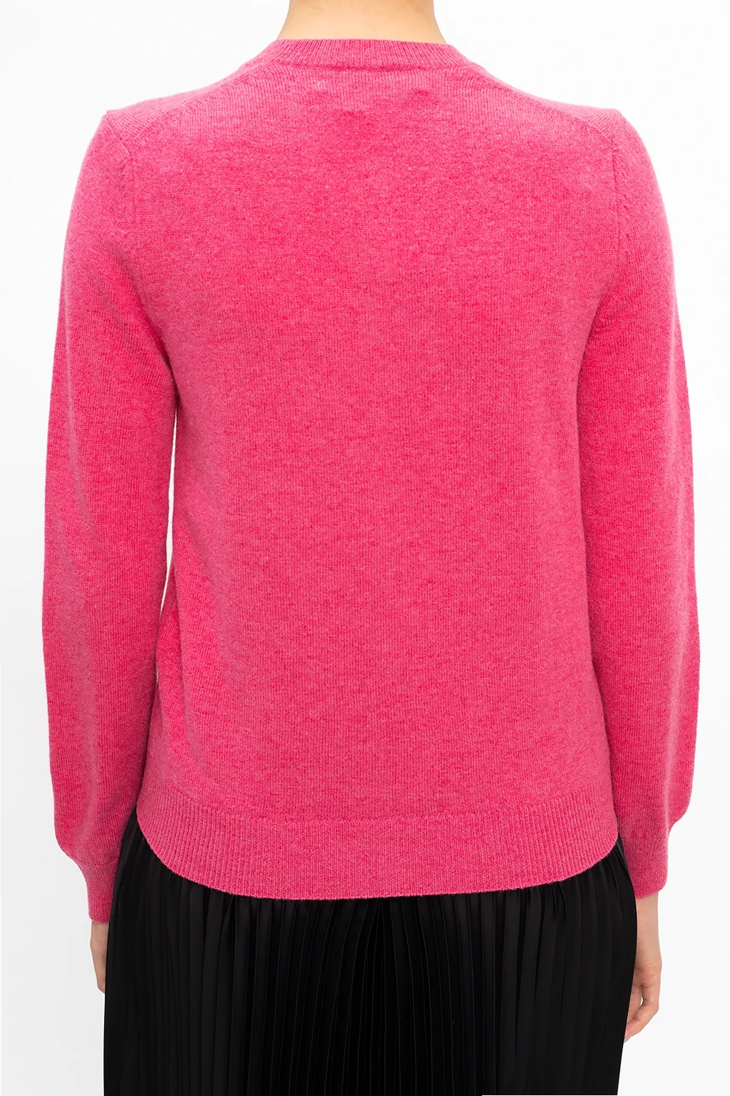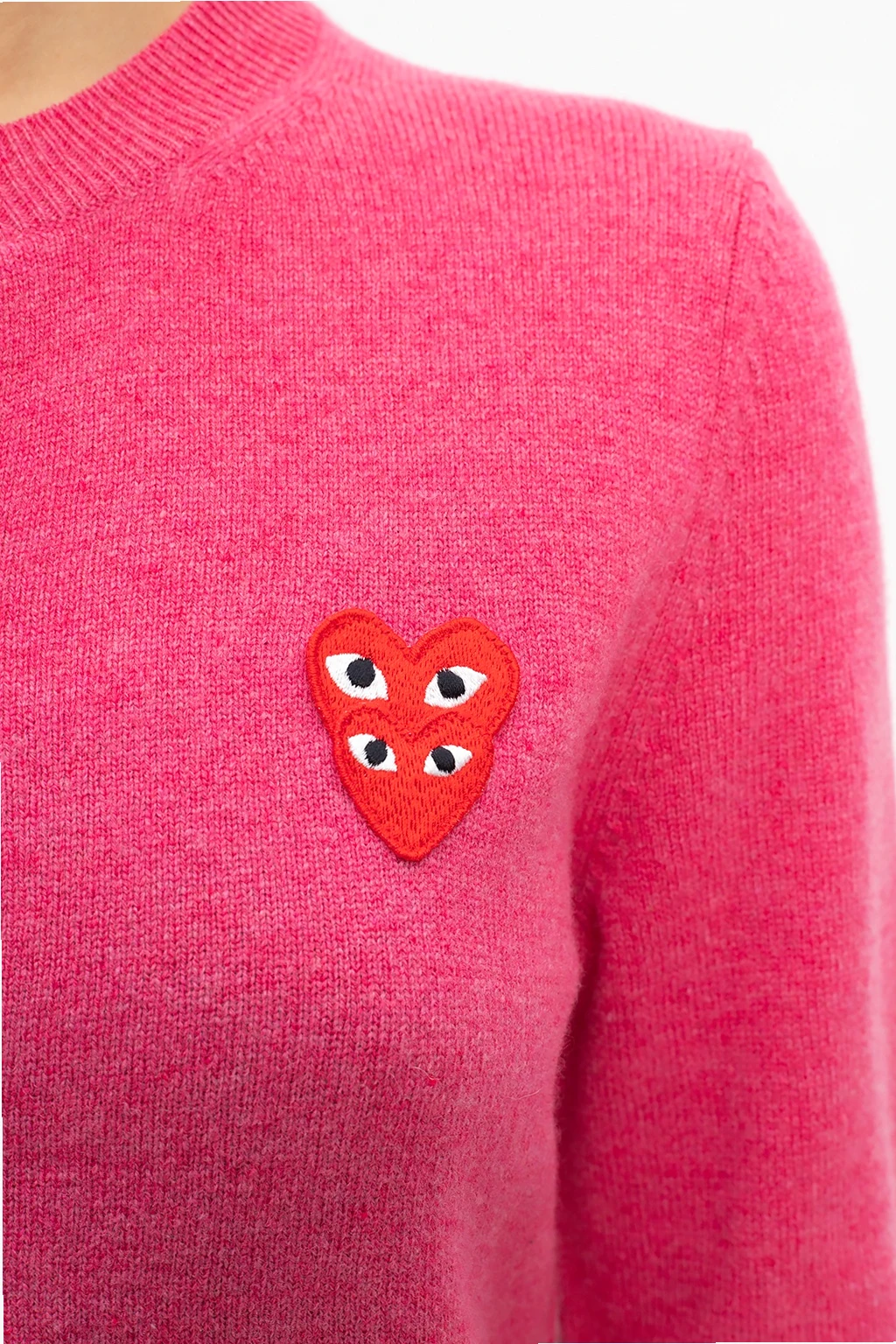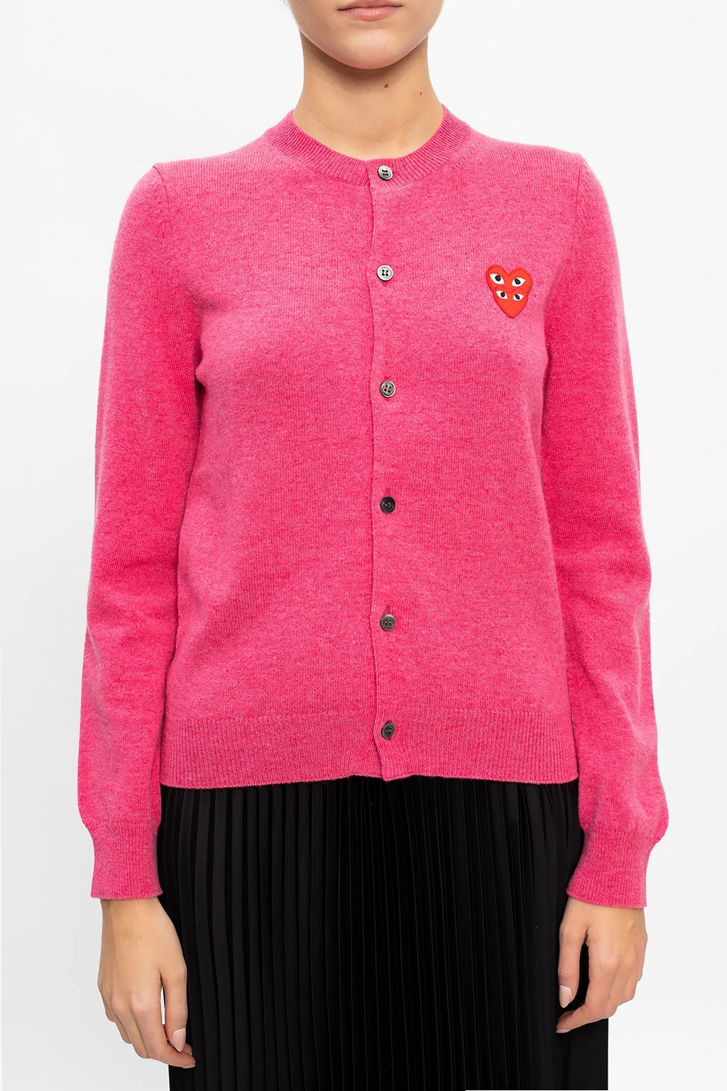 Pink sweater from Comme des Garçons Play. Crafted from wool, this round neck design features button fastenings, red, black and white logo patch and ribbed trims at the neckline, hem and cuffs.