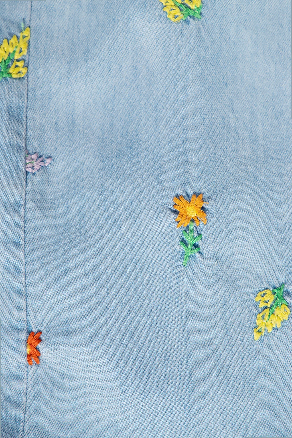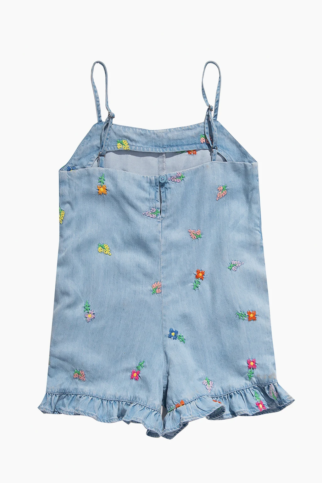 Light blue denim jumpsuit from Stella McCartney Kids. Fastened with buttons, this design features short sleeves with ruffle trims, two slip pockets and embroidered multicolored flowers.