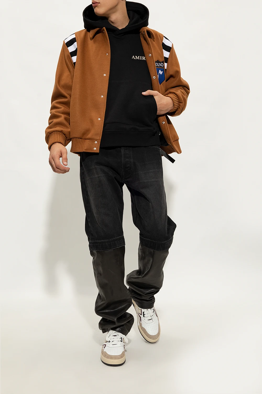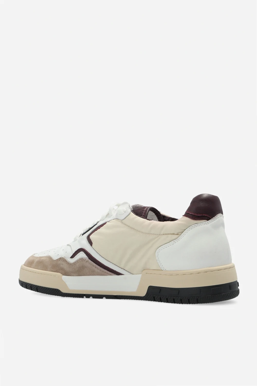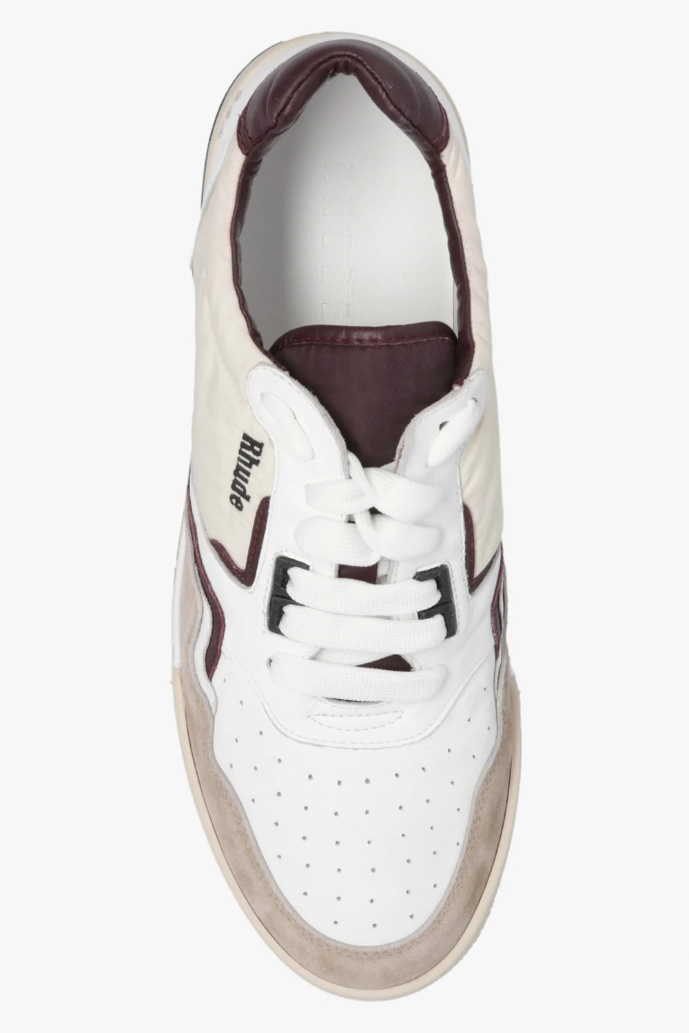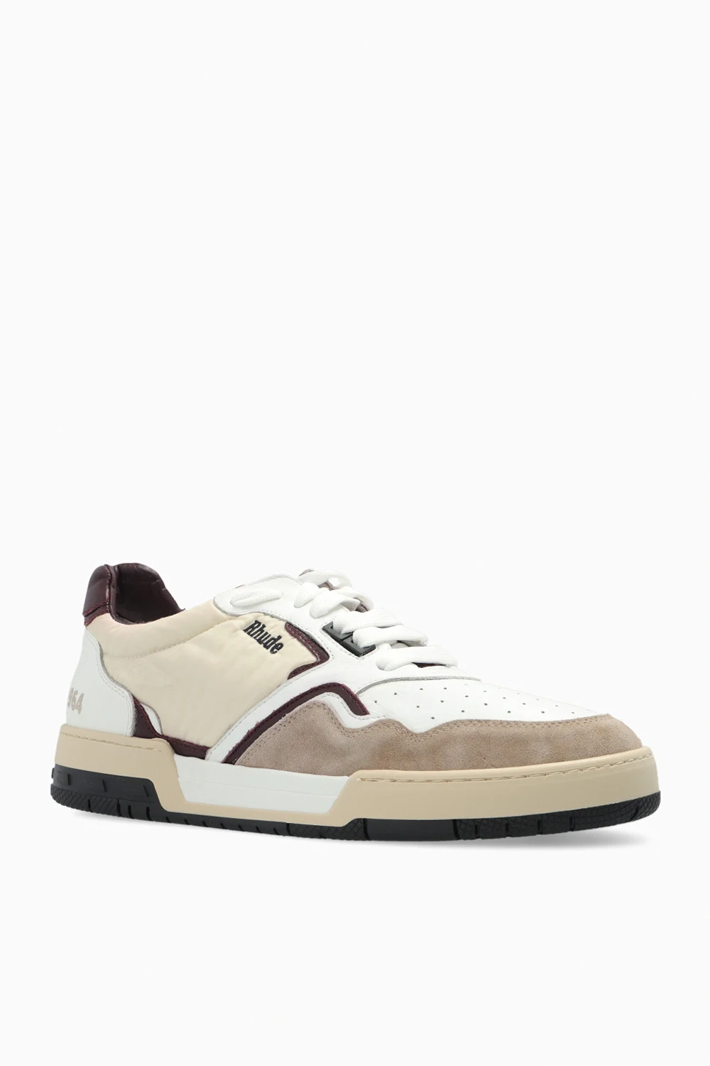 White, cream and maroon ‘Racing’ sneakers from Rhude. Made of leather with suede and fabric trims, this lace-up pair features a logo embroidery on the side, perforations, vintage effect and rubber sole in black, white and cream.