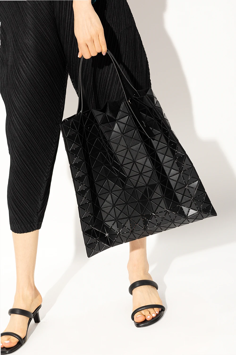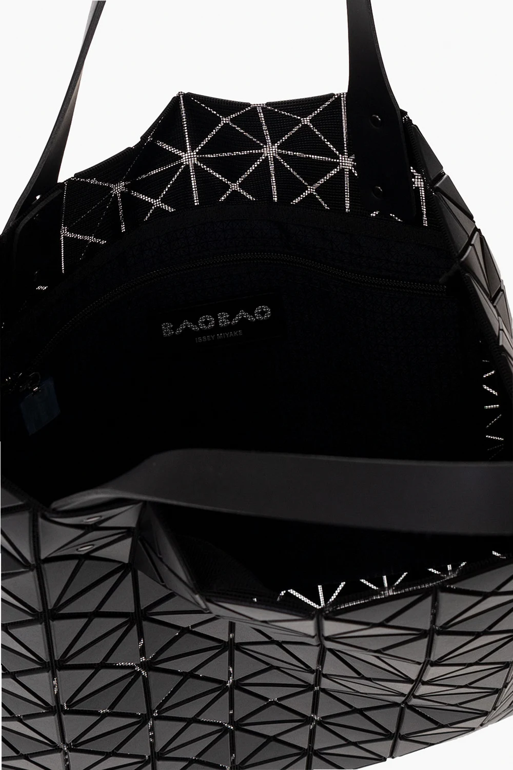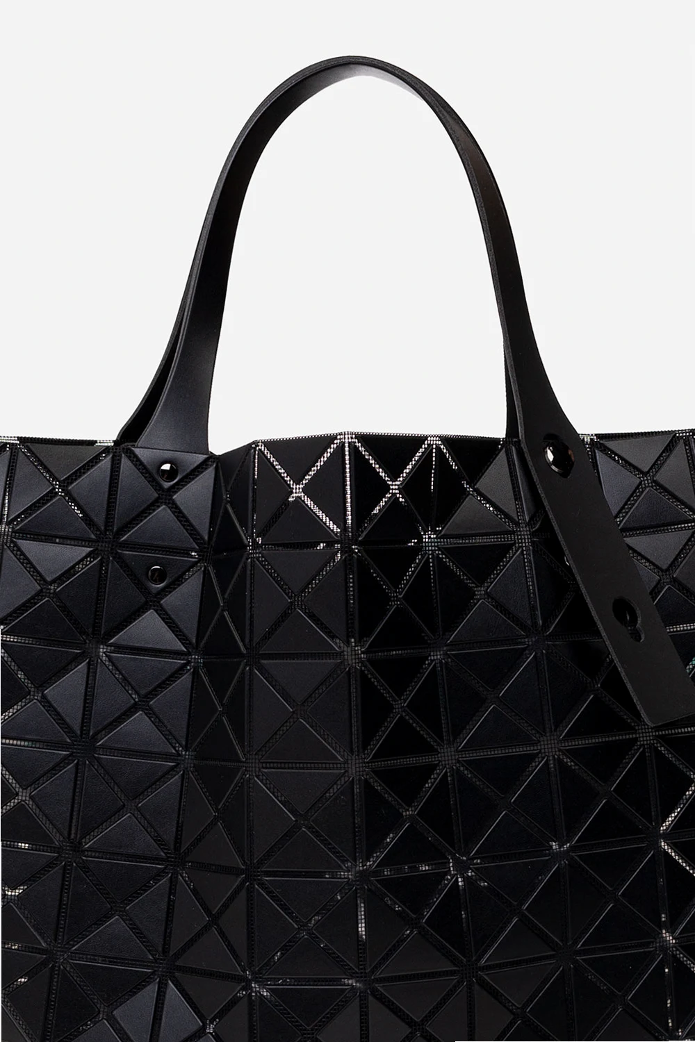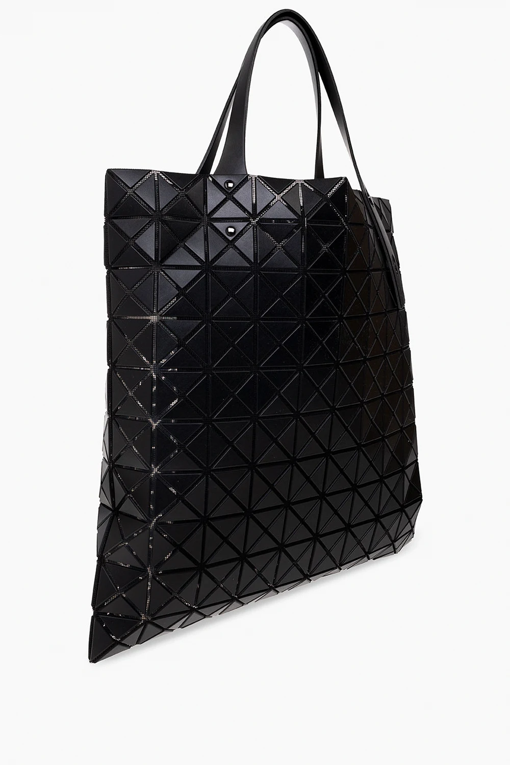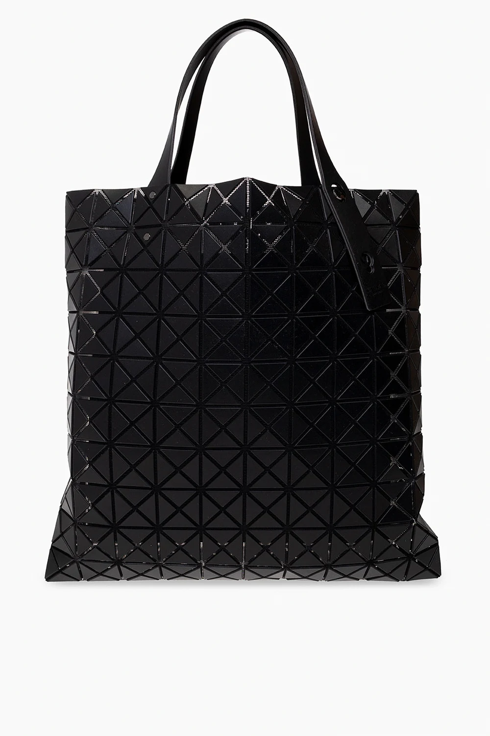 Black ‘Prism Matte’ shopper bag from Issey Miyake Bao Bao. This model features a raised geometric pattern, two adjustable half-round handles, black metal hardware and one internal compartment with one zip pocket.