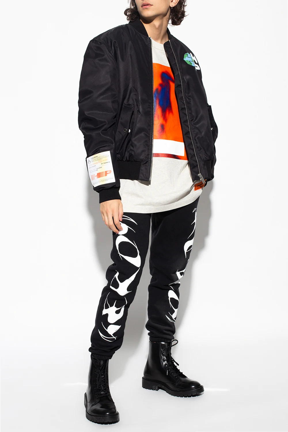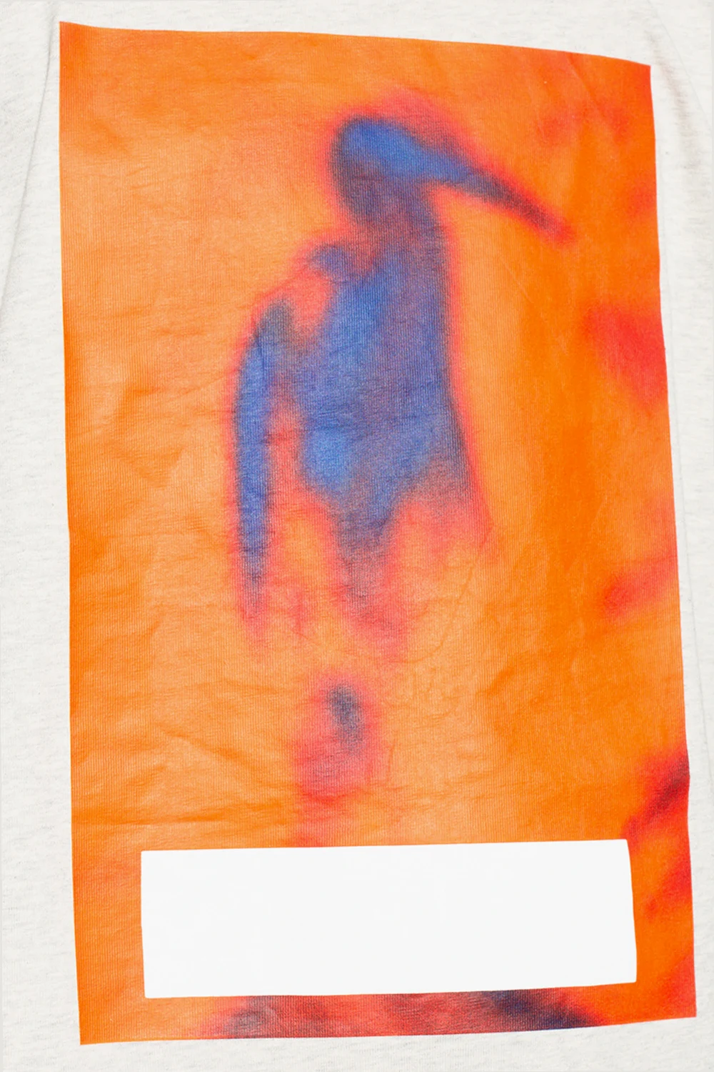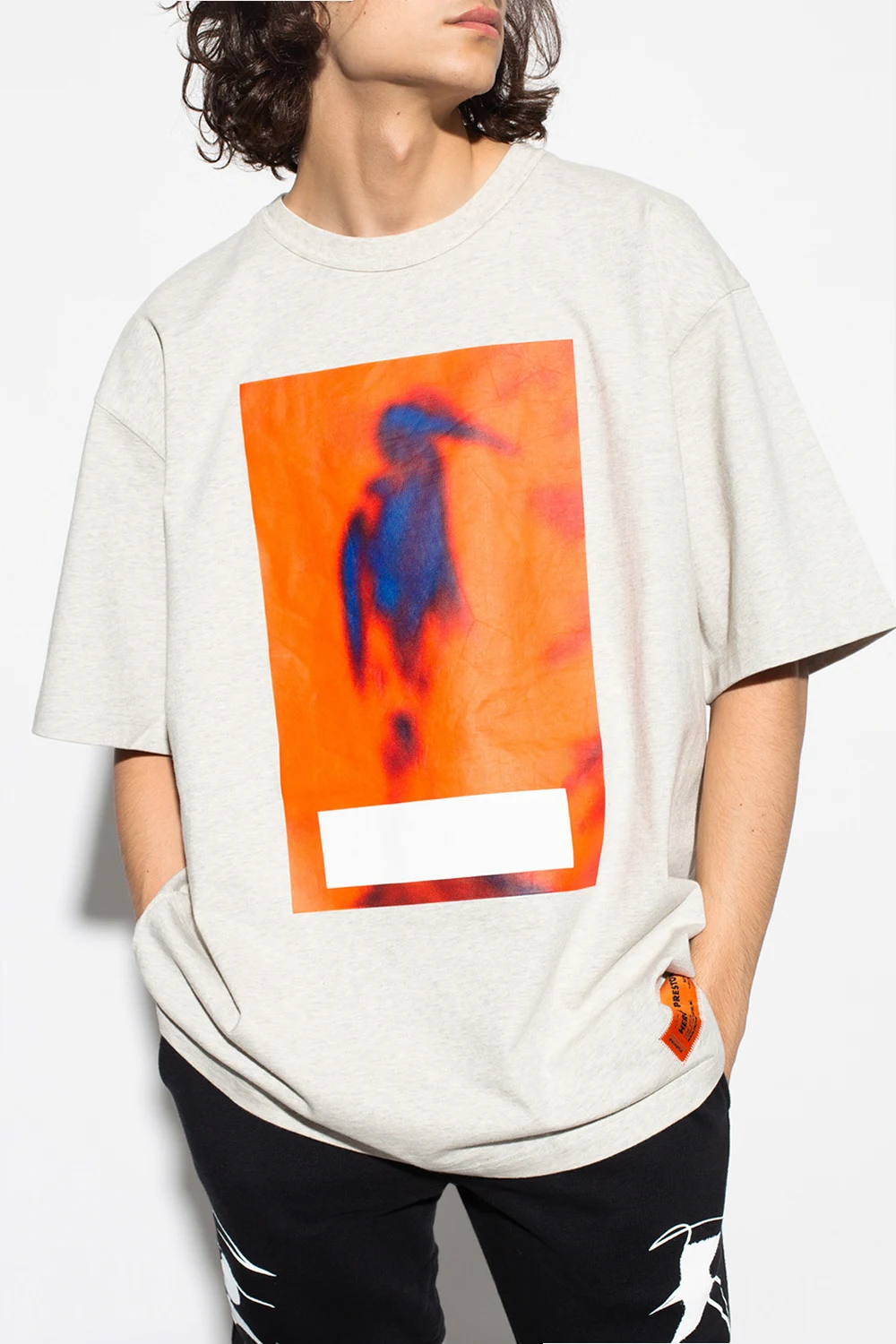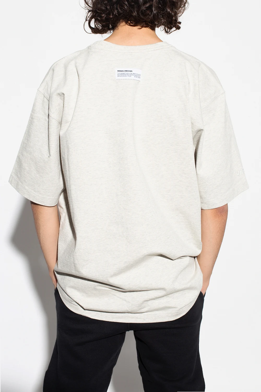 Light grey and cream T-shirt from Heron Preston. Made of organic cotton, this oversize design features an orange, blue and white print, patches, short sleeves and a ribbed crewneck.