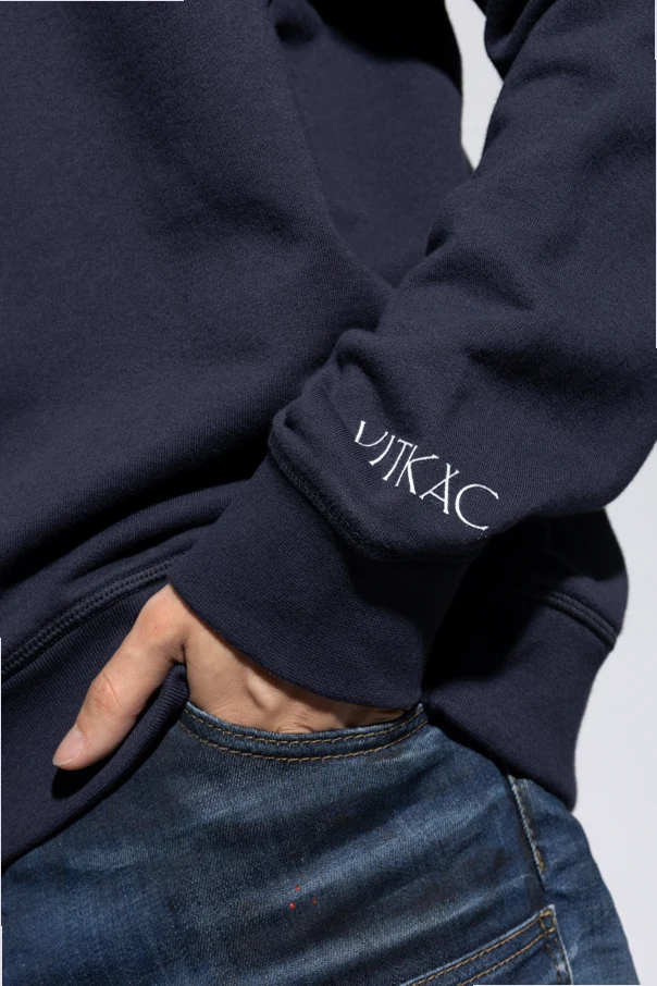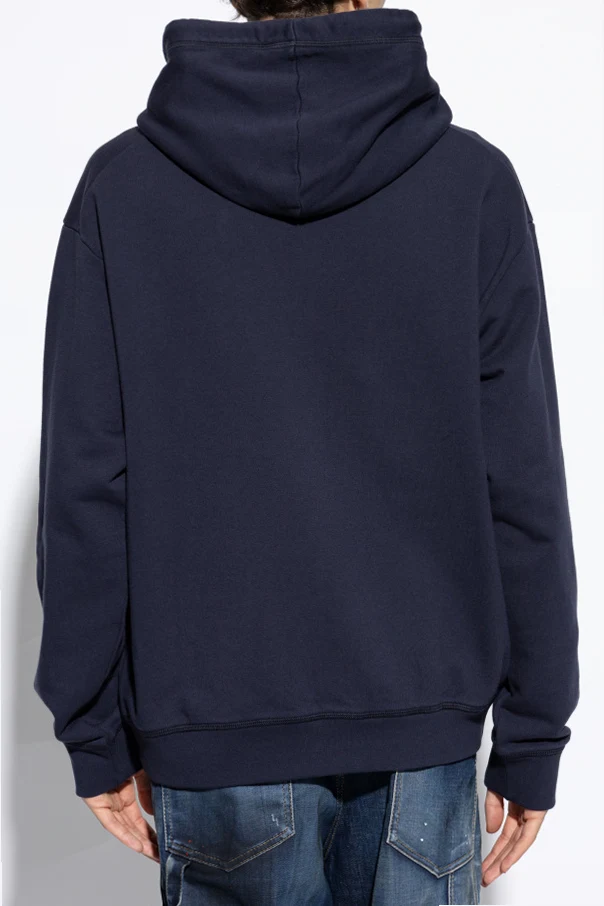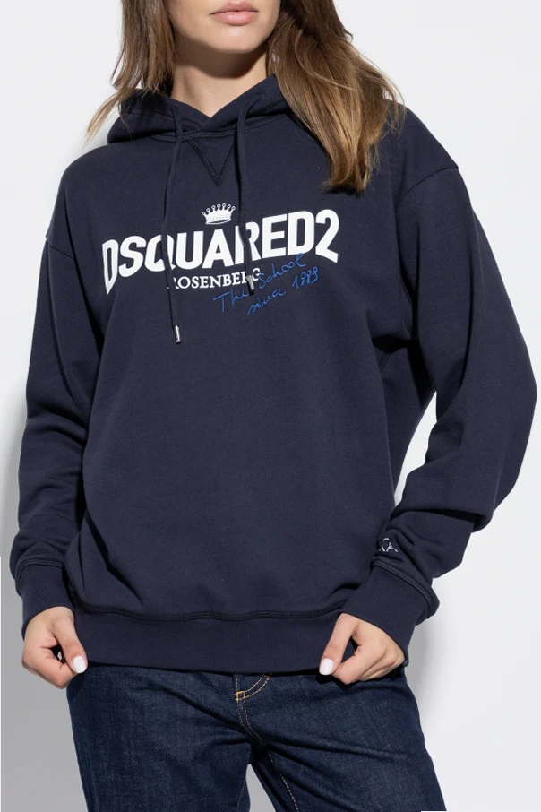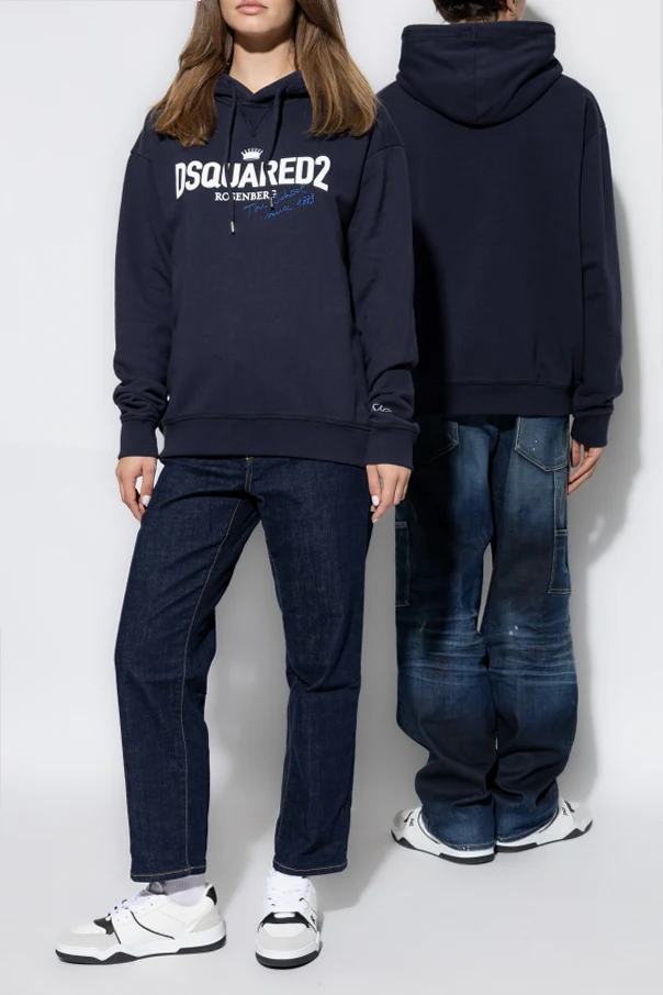 Die dominierende tiefblaue Farbe und der klassische Hoodie-Schnitt mit Kapuze und langen Ärmeln unterstreichen seinen universellen Charakter. Auf der Vorderseite des Pullovers befindet sich ein großes weißes "DSQUARED2"-Logo, ein kleinerer Schriftzug "ROSENBERG" sowie eine blaue handschriftliche Aufschrift, die ihm ein einzigartiges Aussehen verleiht. Zusätzlich befindet sich auf dem linken Ärmel der weiße Schriftzug "VITKAC".
