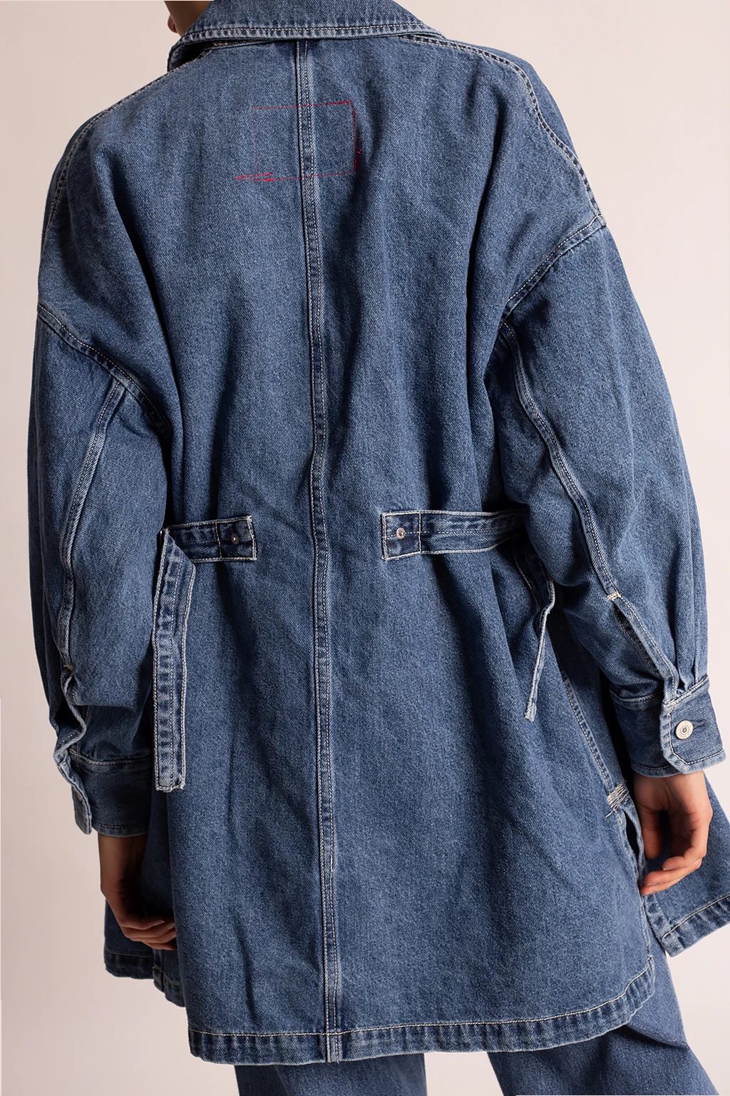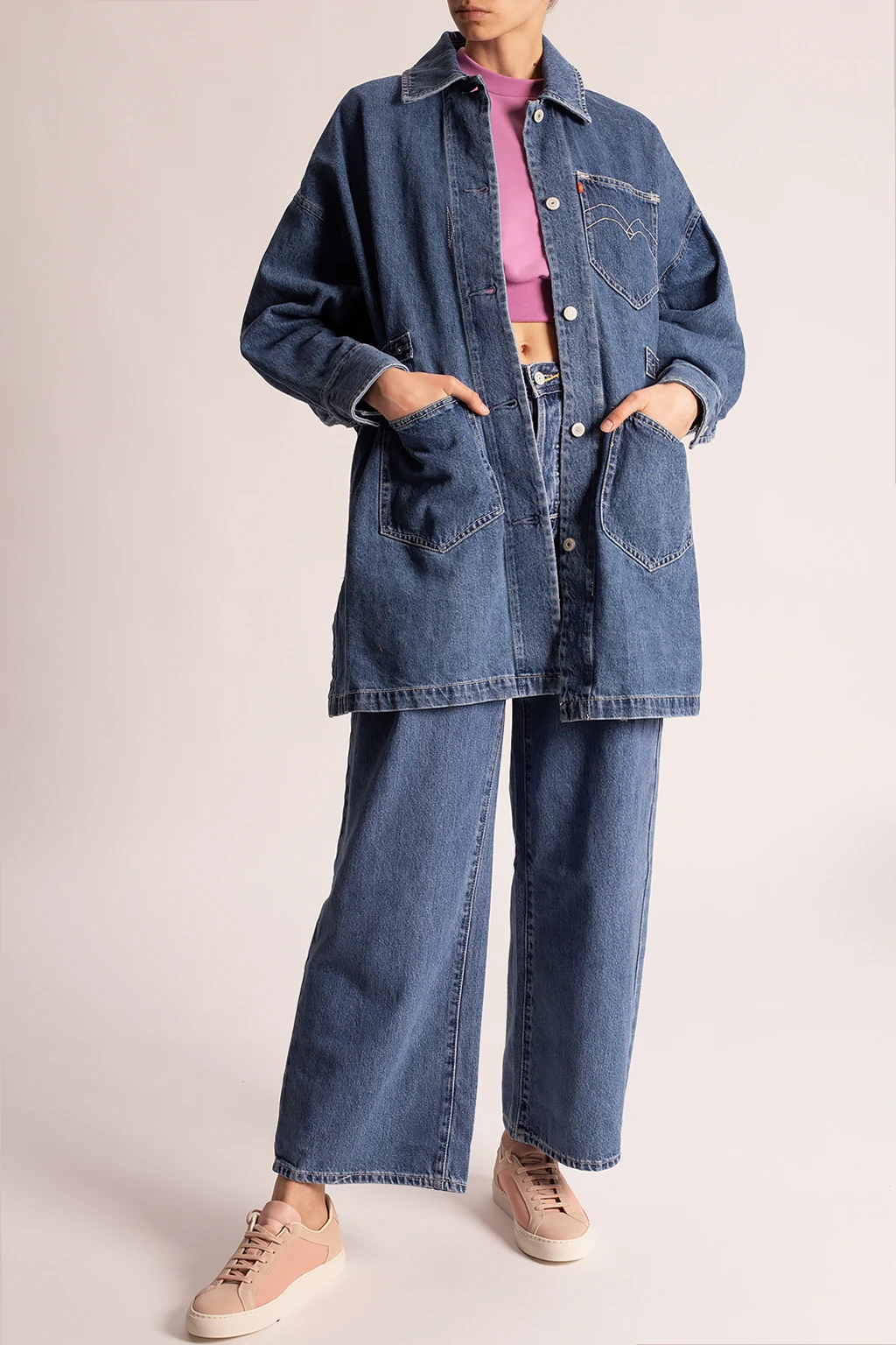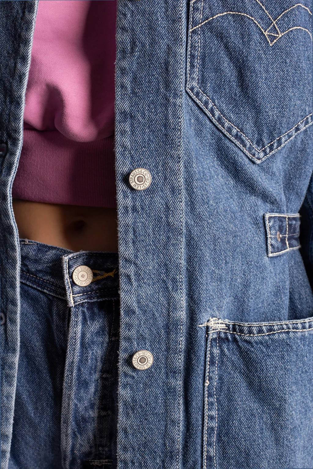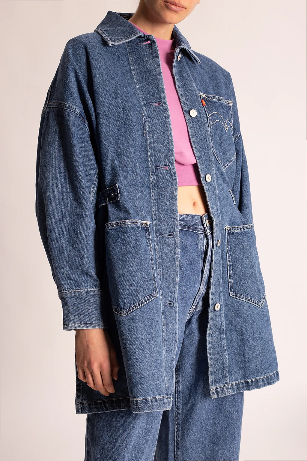 Blue stonewashed denim jacket from Levi’s, the ‘Red’ collection. Crafted in cottonised hemp denim, this garment features button fastenings, distinctive white stitching details, adjustable straps on the sides and three front pockets.