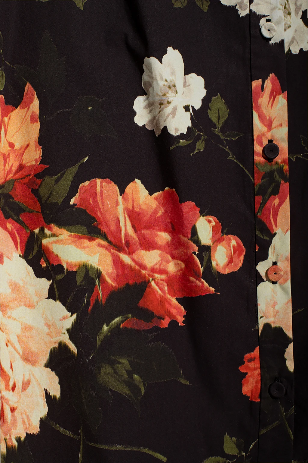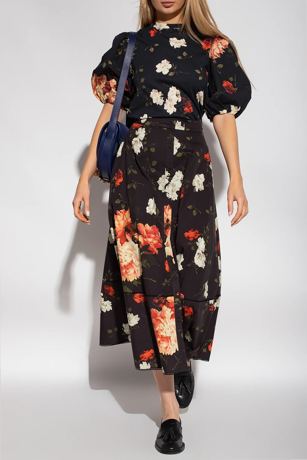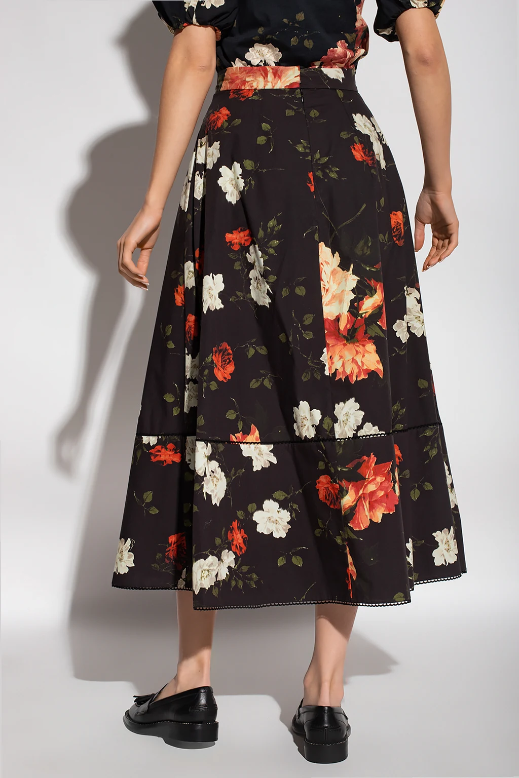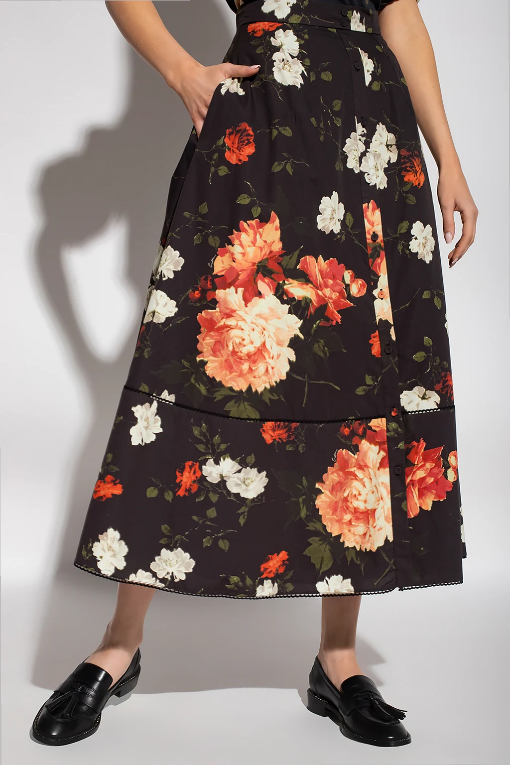 Black ‘Mervyn’ skirt from A-line skirt from Erdem. Made of cotton poplin, this A-line design, button fastening, decorative lace trims and multicolored Sitwell Bloom motif depicting roses and peonies.