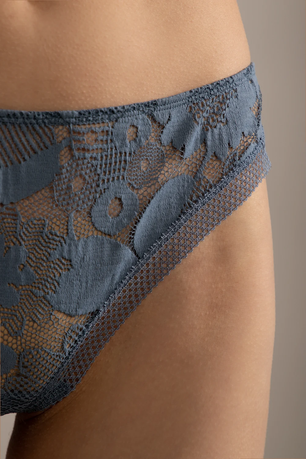 Bluish grey ‘Voile’ tanga briefs from Eres. Made of floral lace.