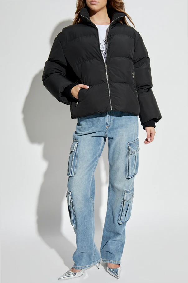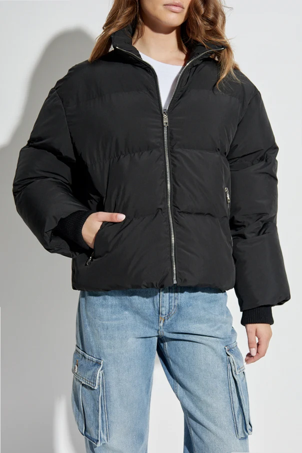 Details wie der durchgehende Metallreißverschluss und zwei Vordertaschen mit Reißverschluss machen sie äußerst praktisch. Elastische Ärmelbündchen schützen zusätzlich vor Kälte. Auf der Rückseite der Jacke, im oberen Rückenbereich, befindet sich eine Metallplakette mit dem Designerlogo, die mit vier Nieten fest befestigt ist und ein charakteristisches Identifikationselement der Marke darstellt.