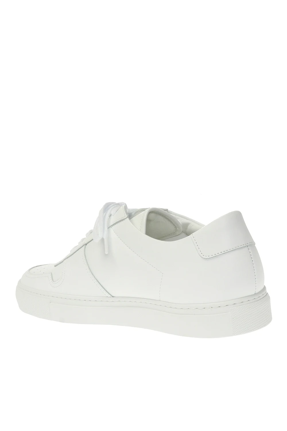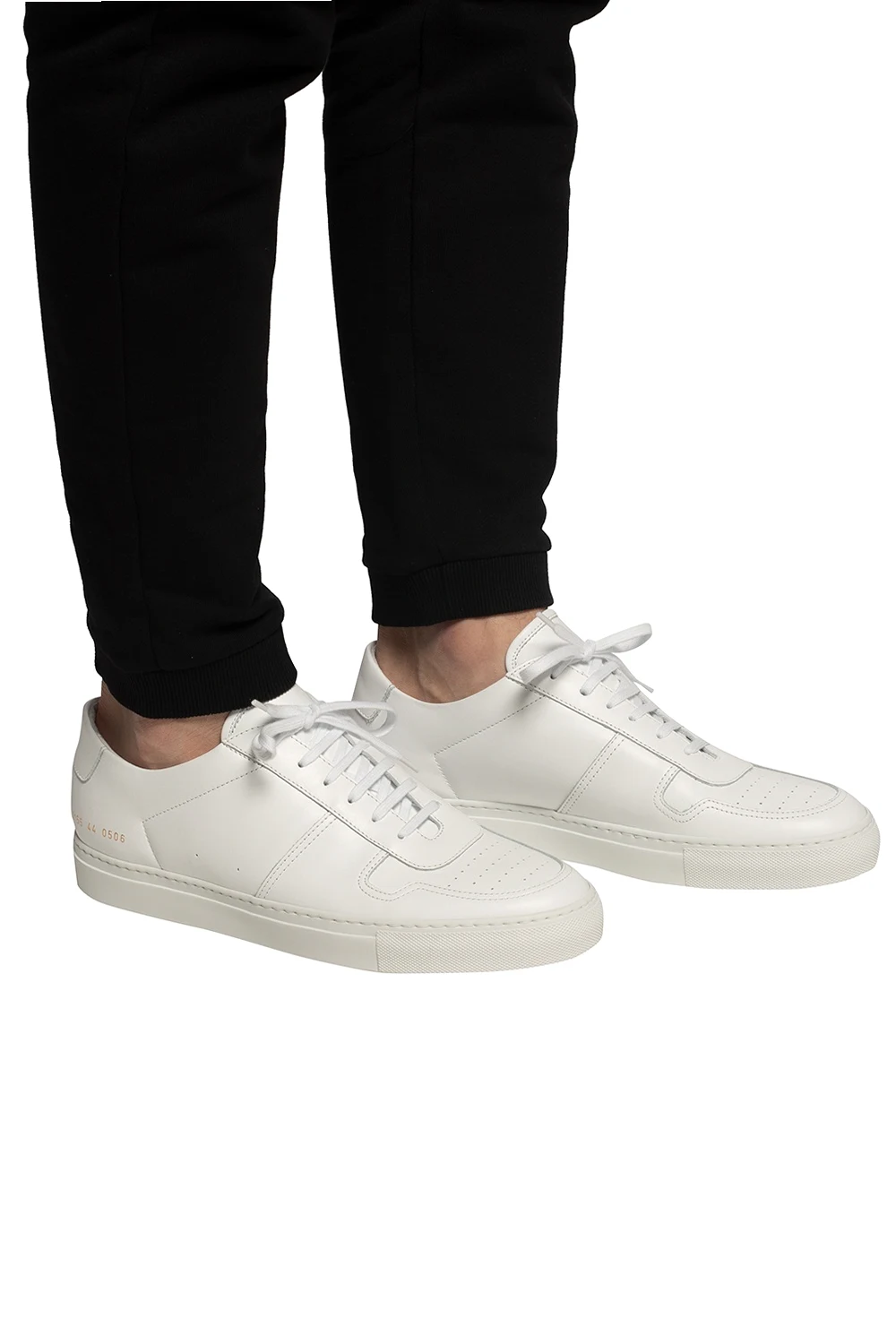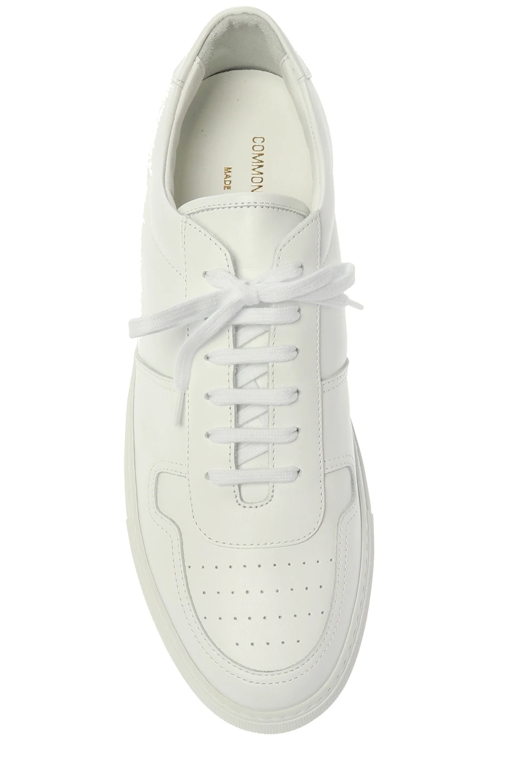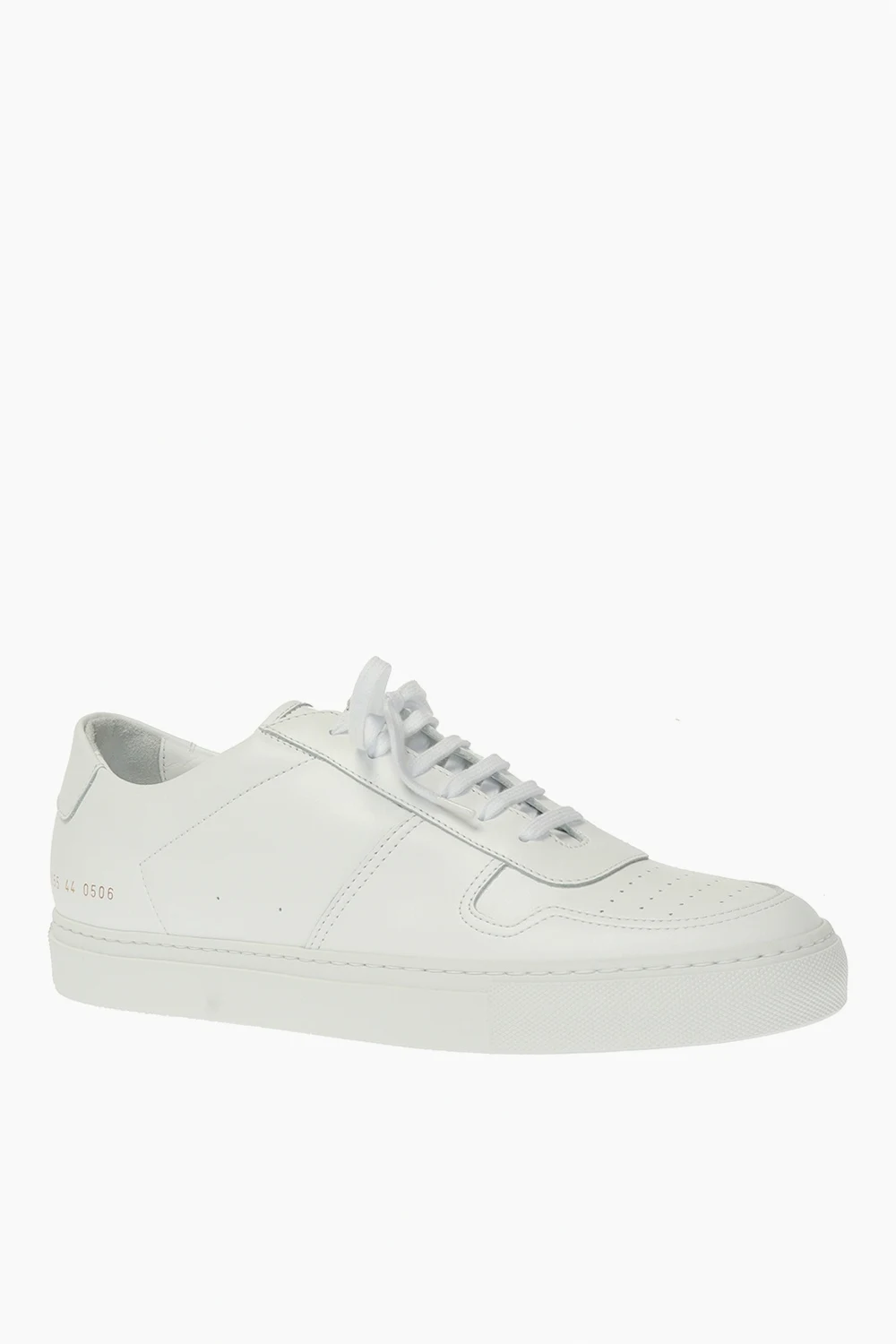White ‘Bball’ lace-up sneakers from Common Projects. Made of leather. Decorated with a printed pattern in gold-tone. Perforated details on the front. White rubber sole.