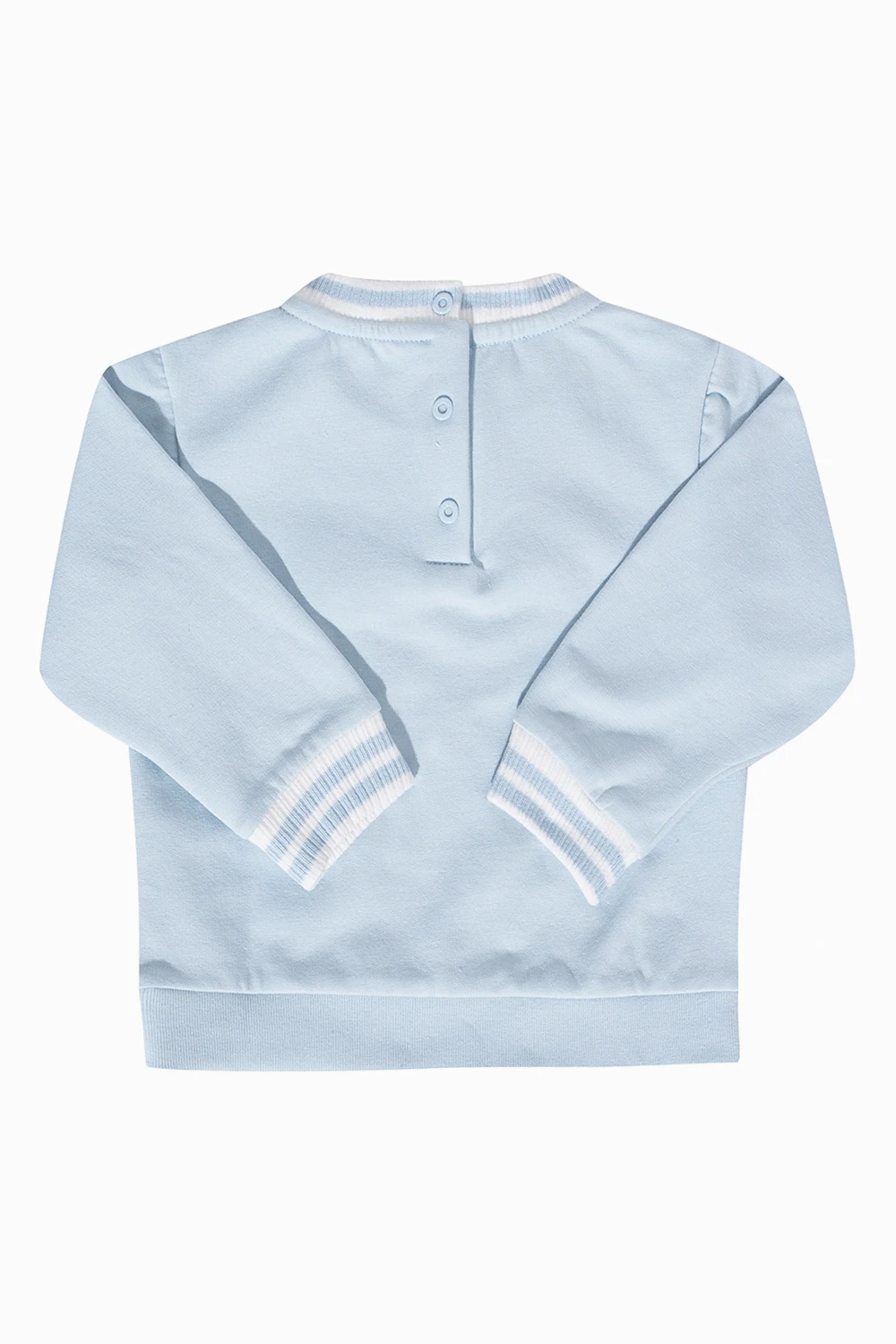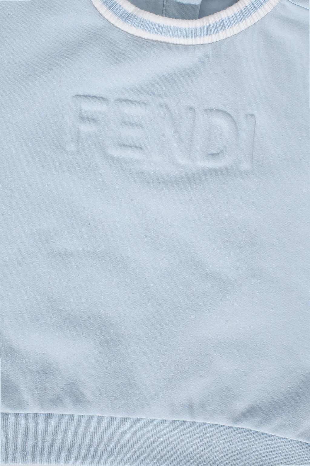 Light blue crewneck sweatshirt from Fendi Kids. Fastened at the back with snaps, this garment is enriched by a logo pattern and ribbed trims at the neck, hem and cuffs.