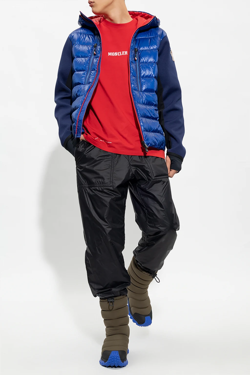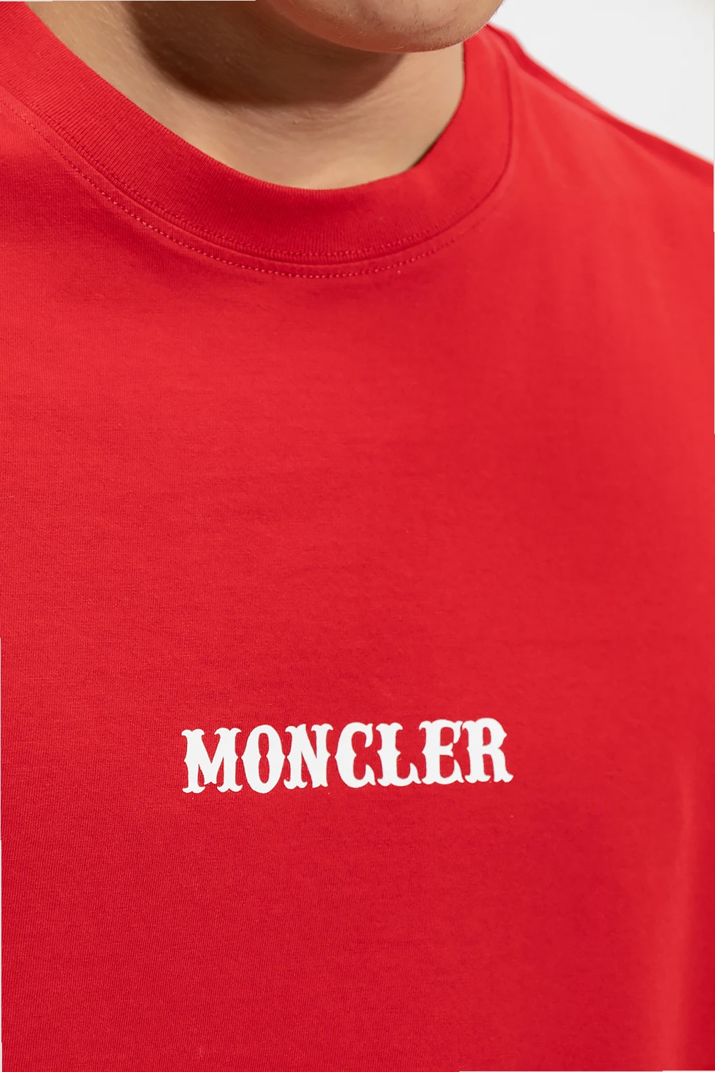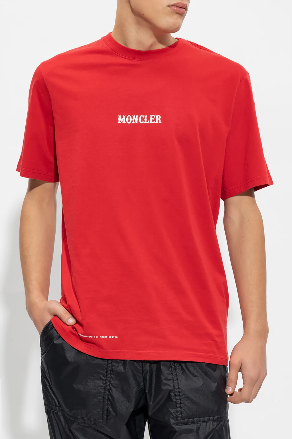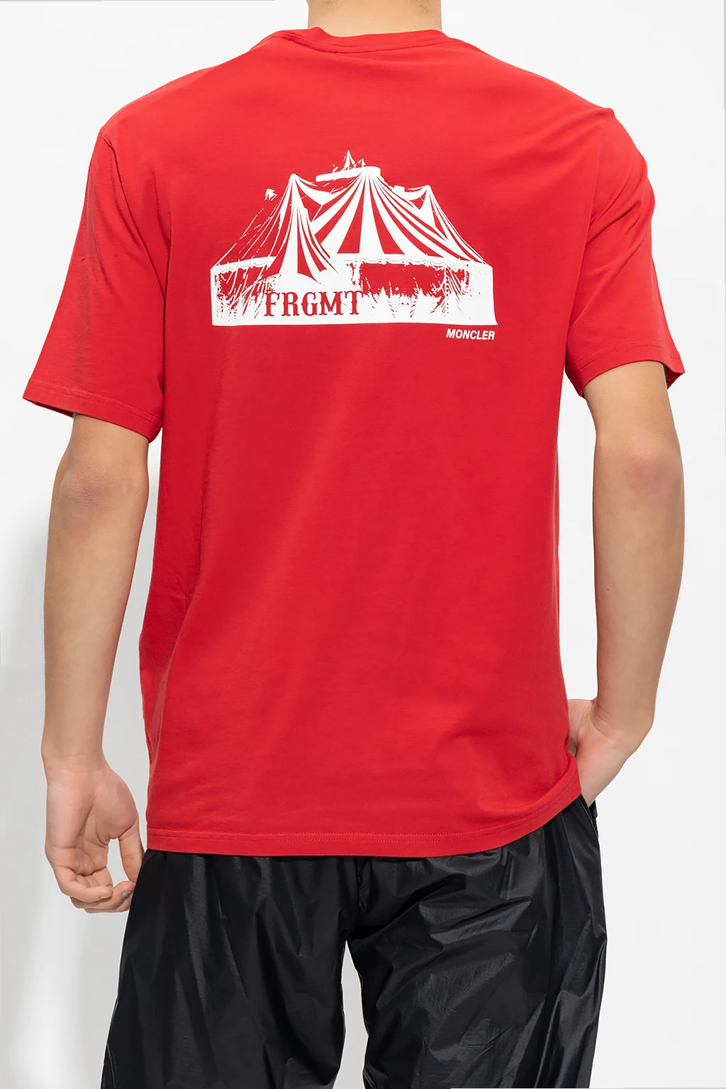 Red crewneck T-shirt from Moncler Genius, the ‘7 Moncler FRGMT Hiroshi Fujiwara’ collection. Crafted from cotton, this style features short sleeves, an elasticated collar and a white logo print.