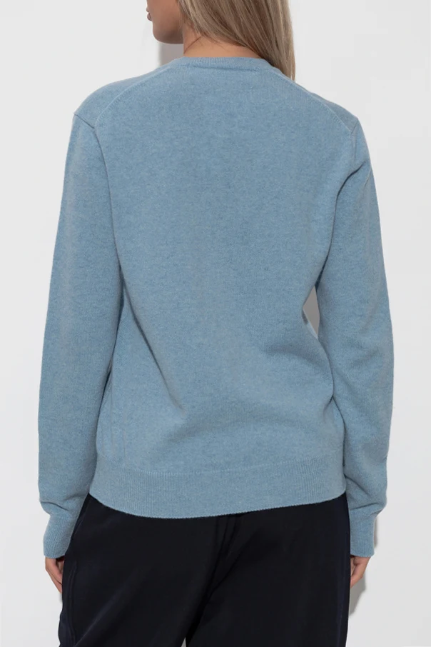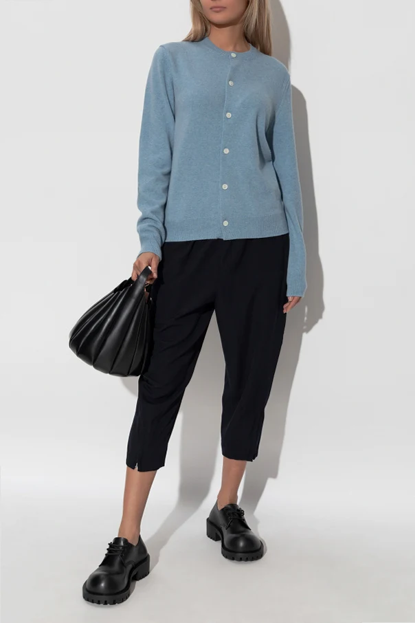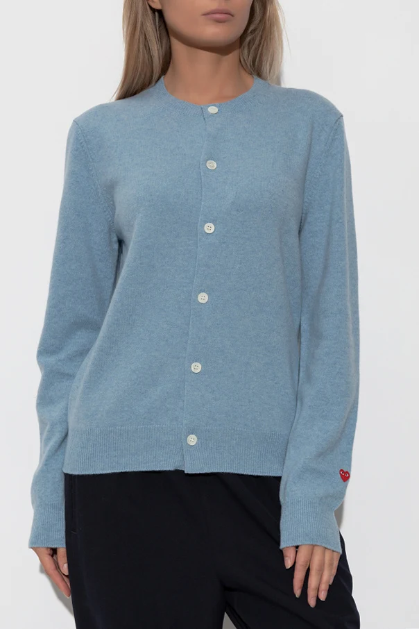 Entdecken Sie den einzigartigen Woll-Cardigan von Comme des Garçons Play , der klassischen Stil harmonisch mit einem modernen Akzent verbindet. Dieser elegante Cardigan in einem pastellblauen Farbton ist die Quintessenz raffinierter Einfachheit und zeitlosen Designs.