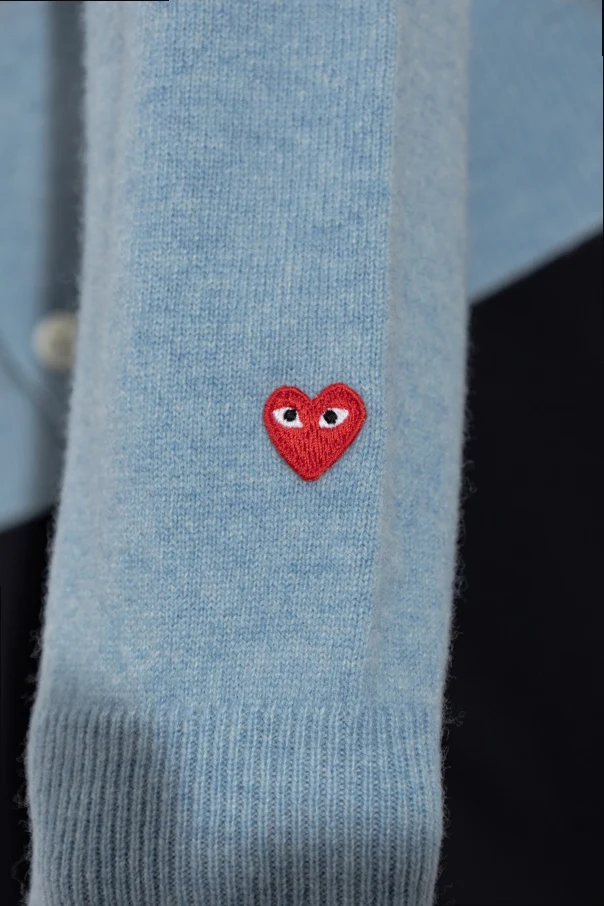 Elastische Bündchen an den Enden der Ärmel und am unteren Saum des Cardigans sorgen für eine perfekte Passform und betonen seine Funktionalität und Bequemlichkeit. Auf der Innenseite des Kragens ist ein Etikett mit der Aufschrift „PLAY“ sichtbar, das die Exklusivität der Marke beweist.