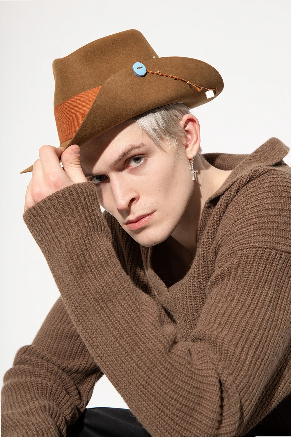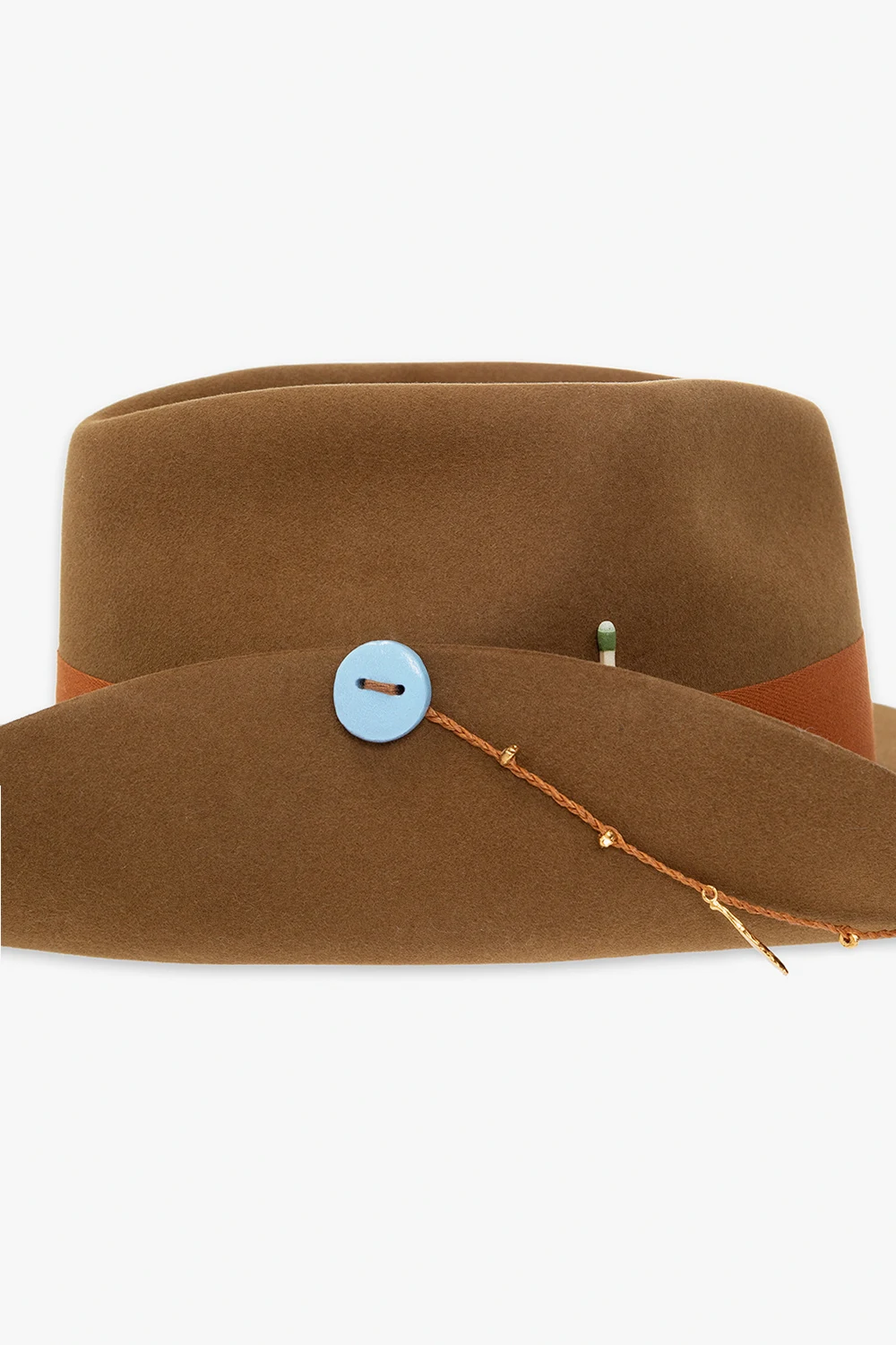 Brown ‘Renaissance’ hat from Nick Fouquet. Made from felt, this item features a folded brim on the side and colourful applications accompanied by the brand's signature matchstick.