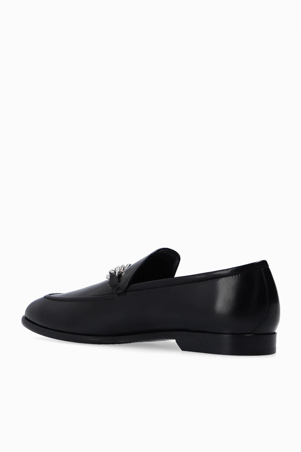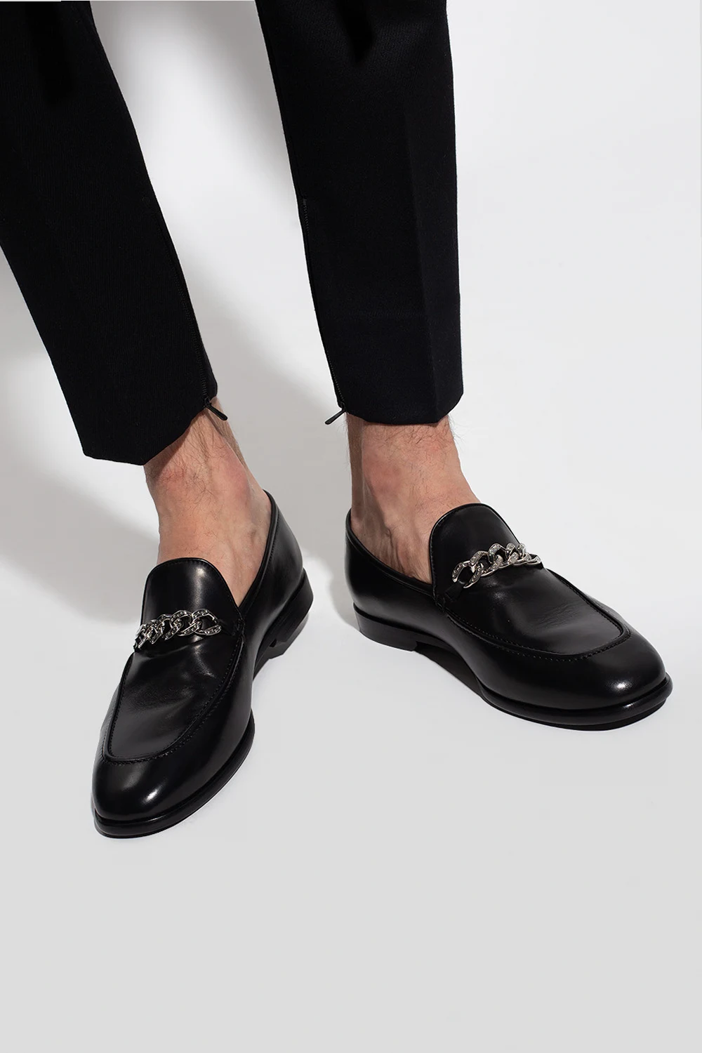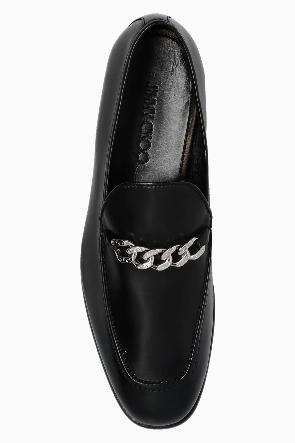Black ‘Marti’ moccasins from Jimmy Choo. Made of suede, this pair sits on a black leather sole and features a silver-tone chain accessory on the front.
