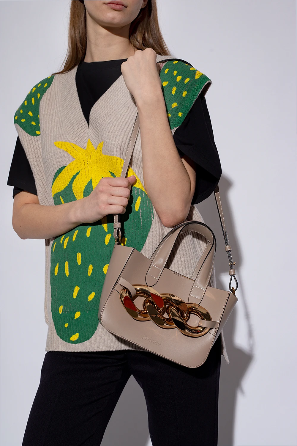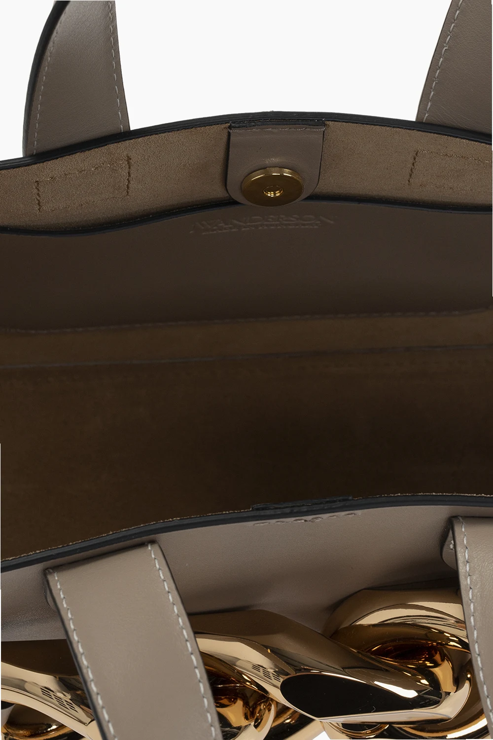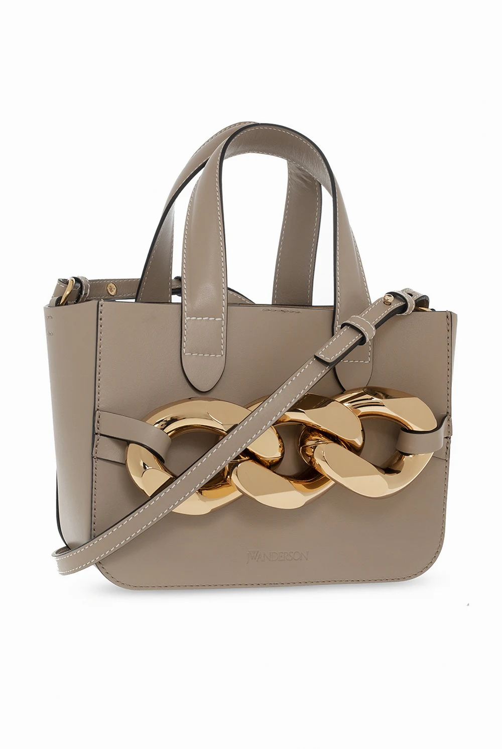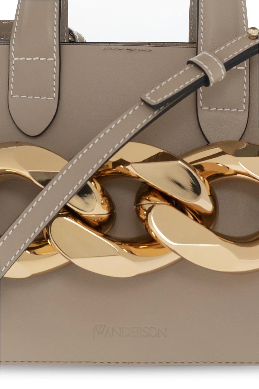 Beige and gray 'Mini Chain' shoulder bag from JW Anderson. Made of cow leather. Closed with a magnetic clasp. Decorated with a chain applique. Two semicircular handles. Shoulder strap. One compartment and a slip pocket inside. Metal golden finish.