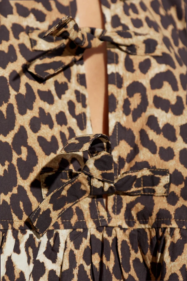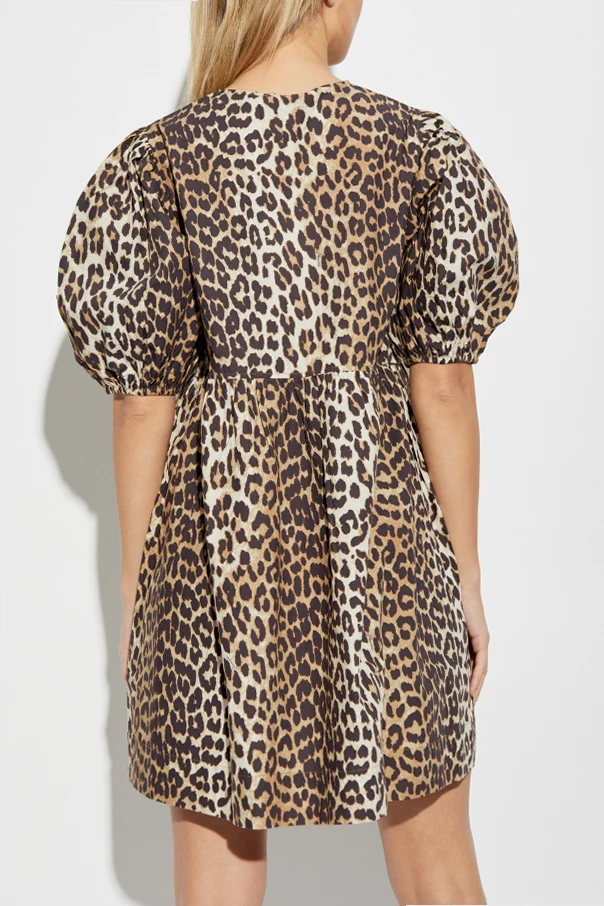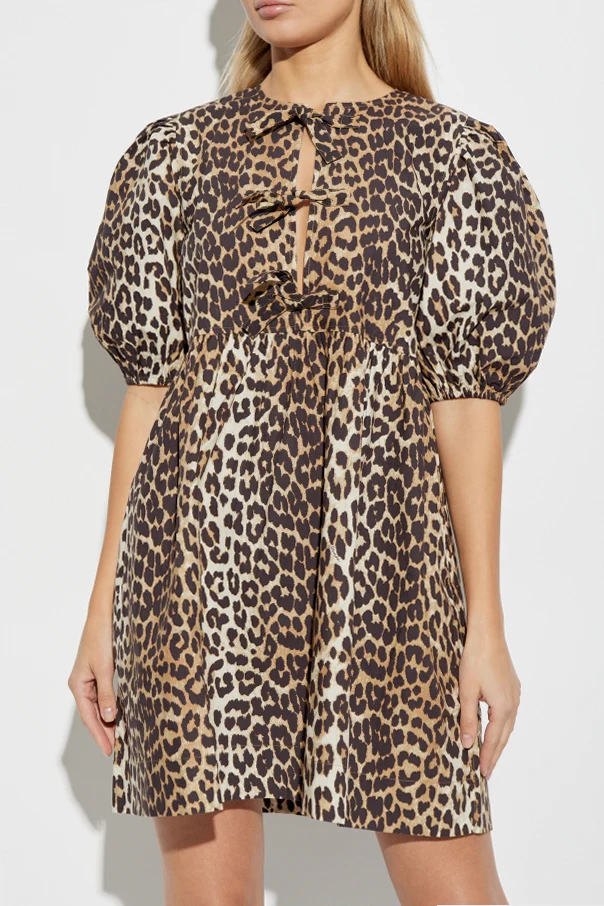Wir präsentieren das Kleid mit Tiermuster der dänischen Marke GANNI , die meisterhaft Klassik mit Lässigkeit verbindet. Dieses kurze Kleid mit Puffärmeln und einem zarten Ausschnitt am Dekolleté, verziert mit subtilen Bindungen, ist die Quintessenz von Eleganz und modernem Stil.