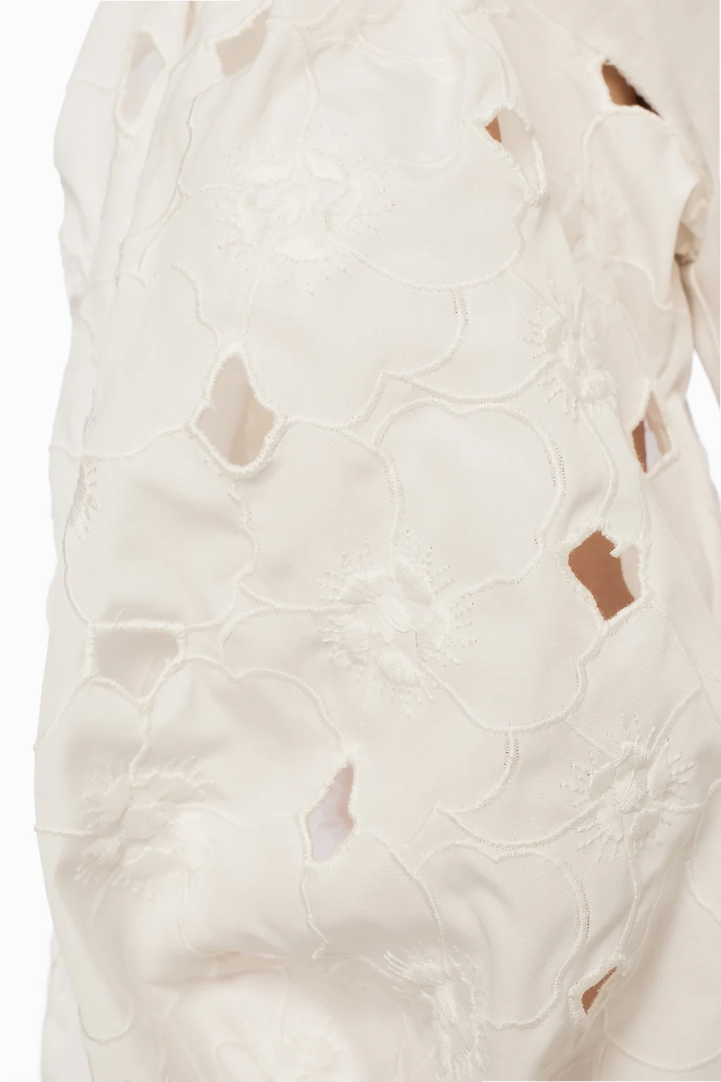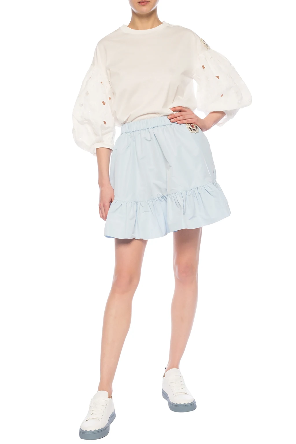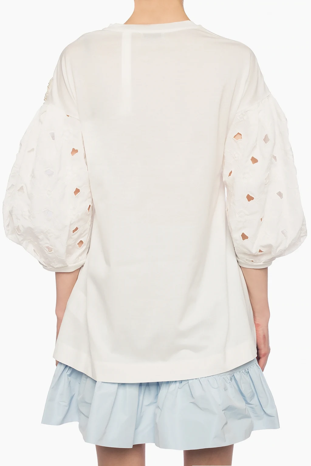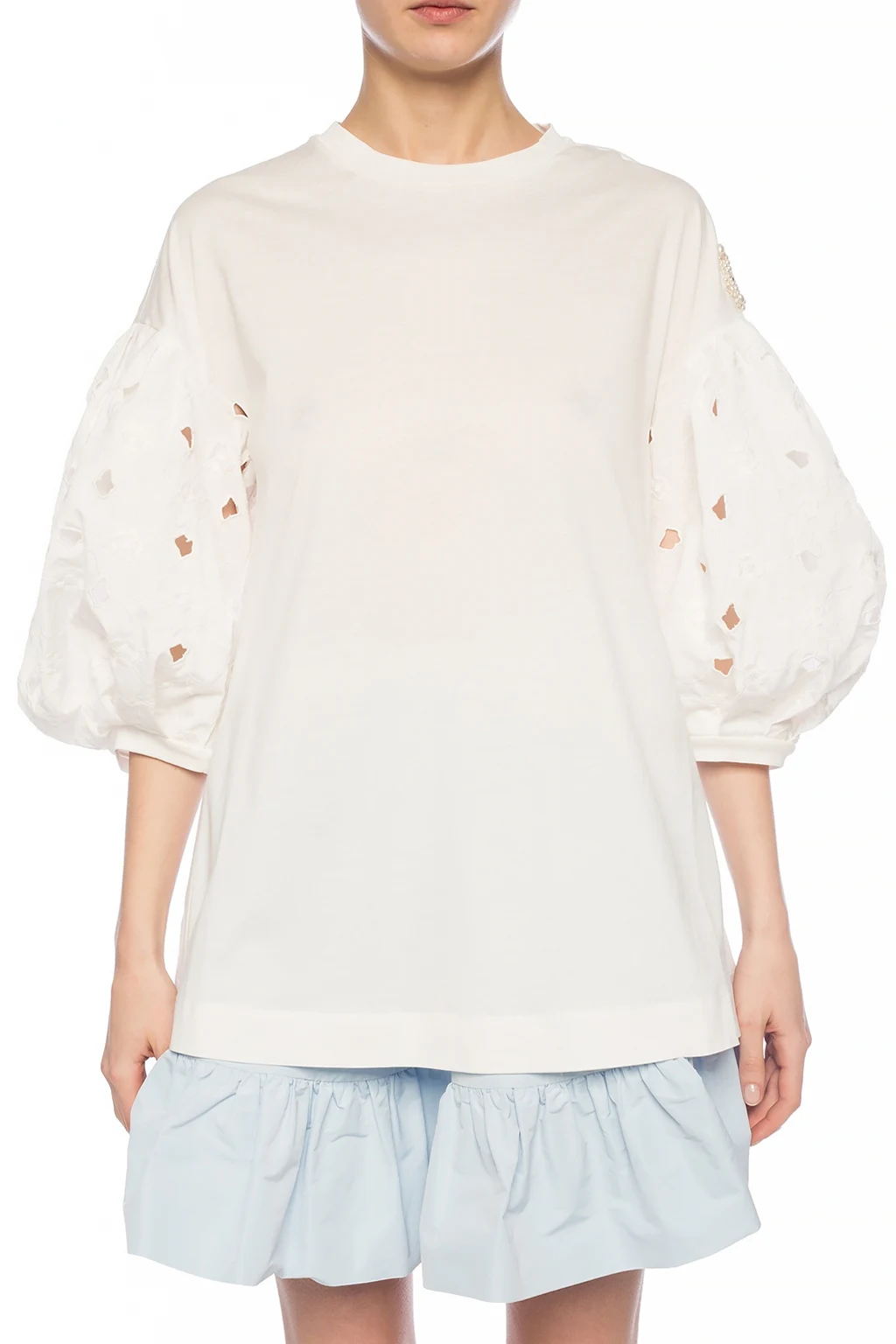 White T-shirt from Moncler Genius, ‘Simone Rocha no. 4’ collection. Made of cotton. Decorated with a logo patch featuring an applique. Decorative openwork sleeves with an embroidered floral pattern. Ribbed ham and cuffs. Round neck.