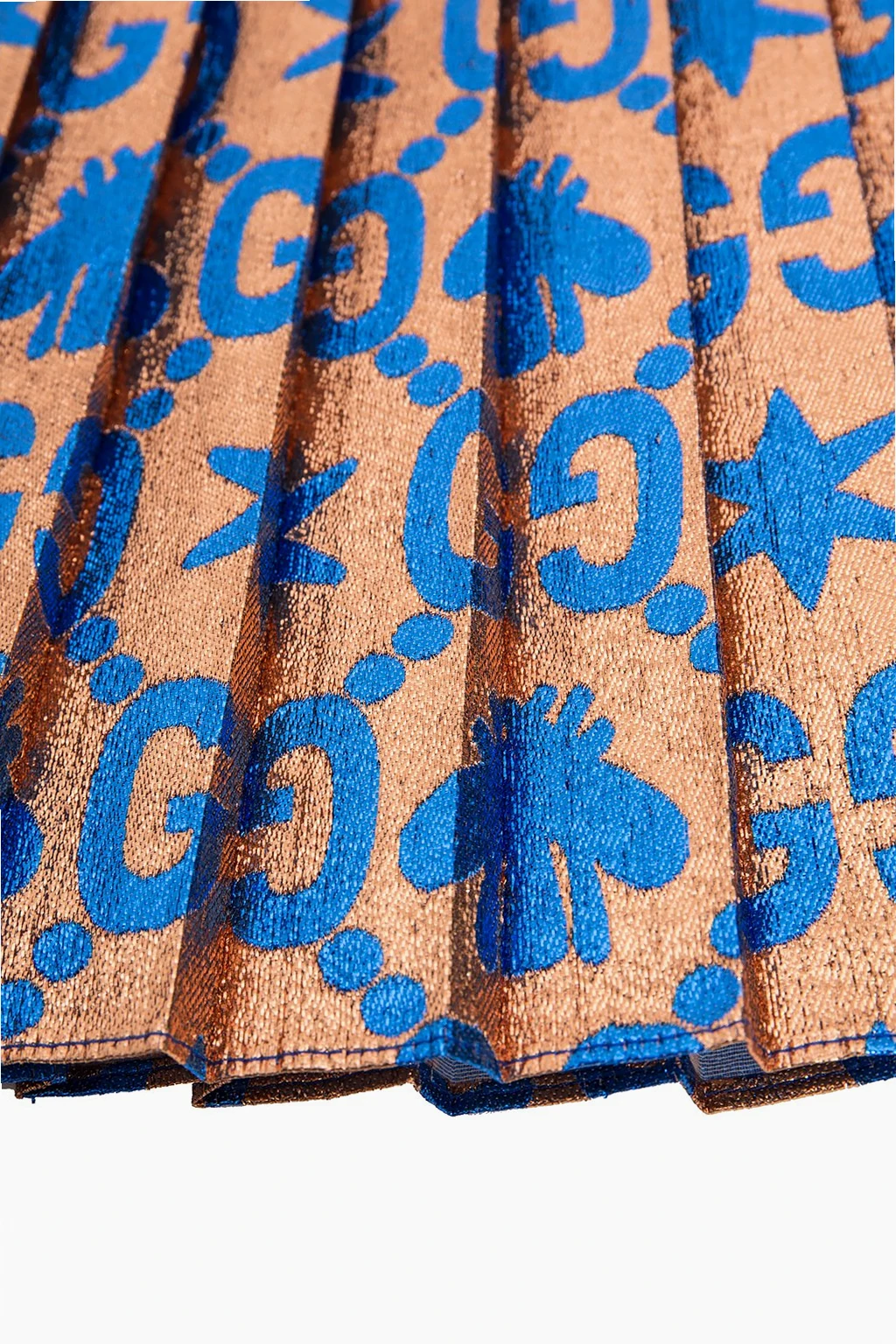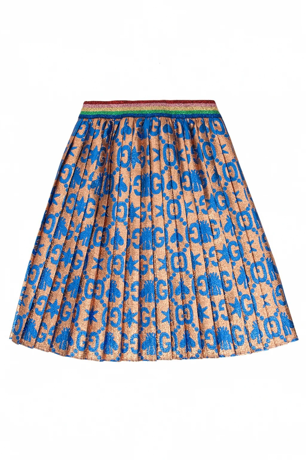 Gold-tone pleated two-layered skirt from Gucci. Elastic waistband trimmed with a colorful pattern embroidered with a lurex thread. Decorated with a logo pattern.