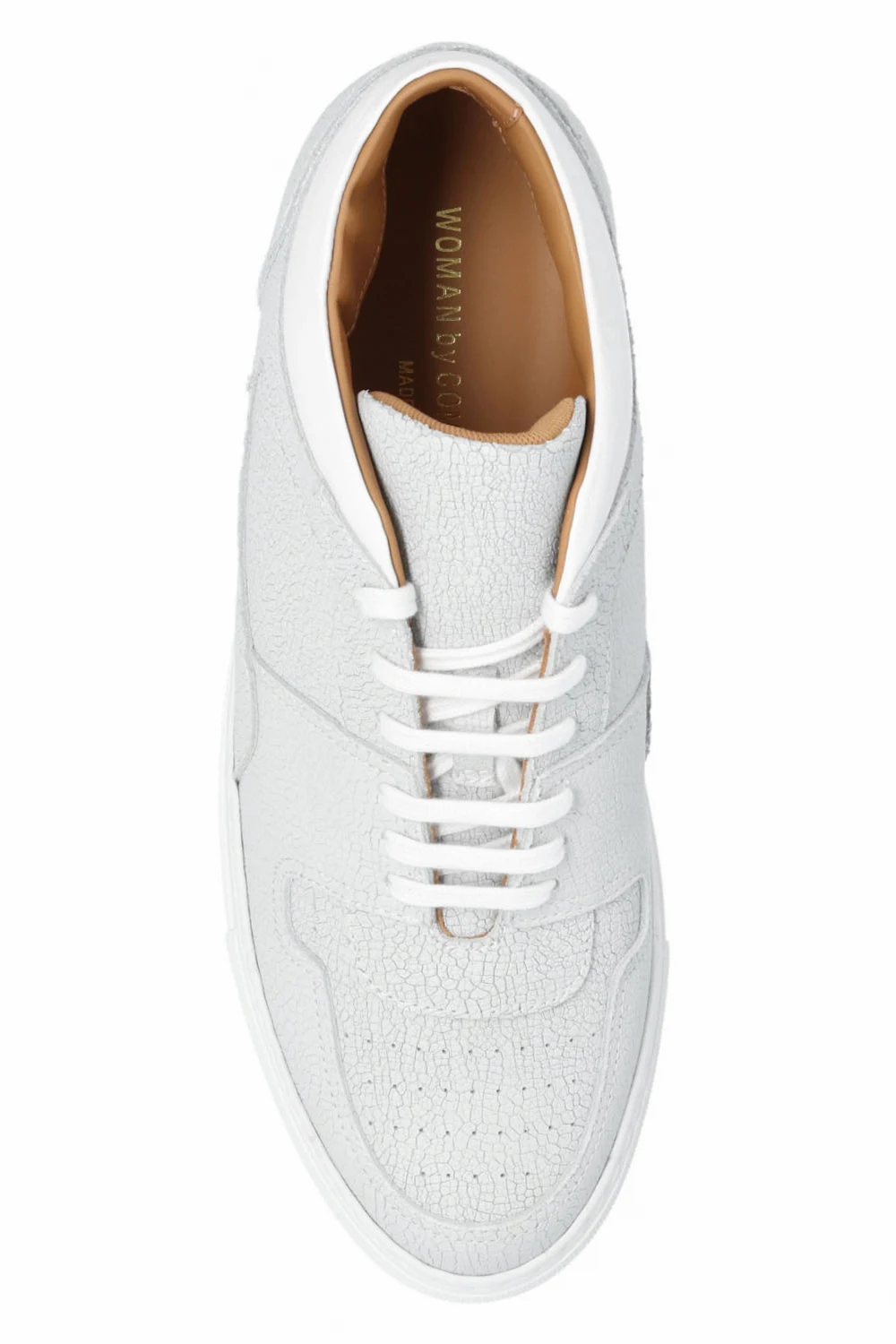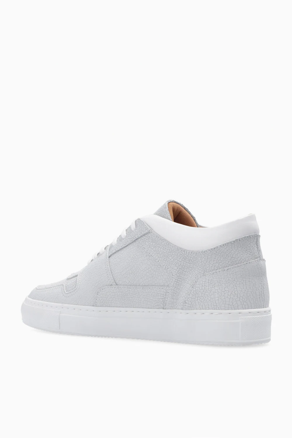 Grey and white ‘Decades Mid’ sneakers from Common Projects. Crafted from leather with a cracked effect, this lace-up model features a gold-tone print on the side, a perforated toe and a white rubber sole. Swappable shoelaces included.