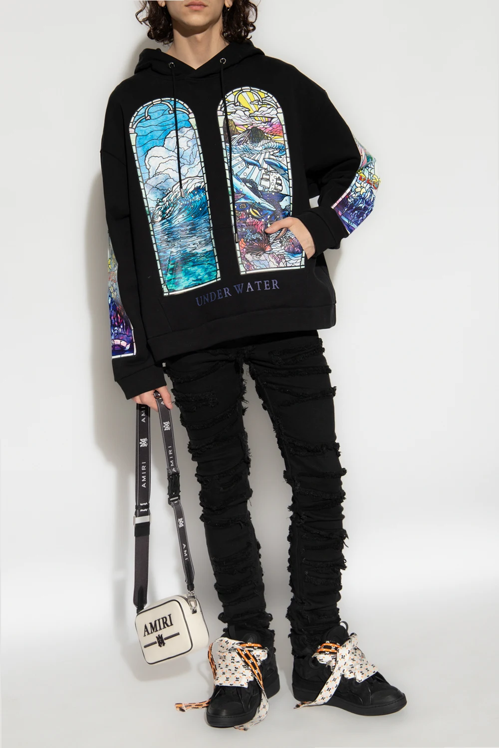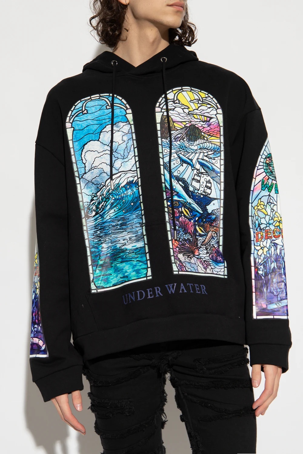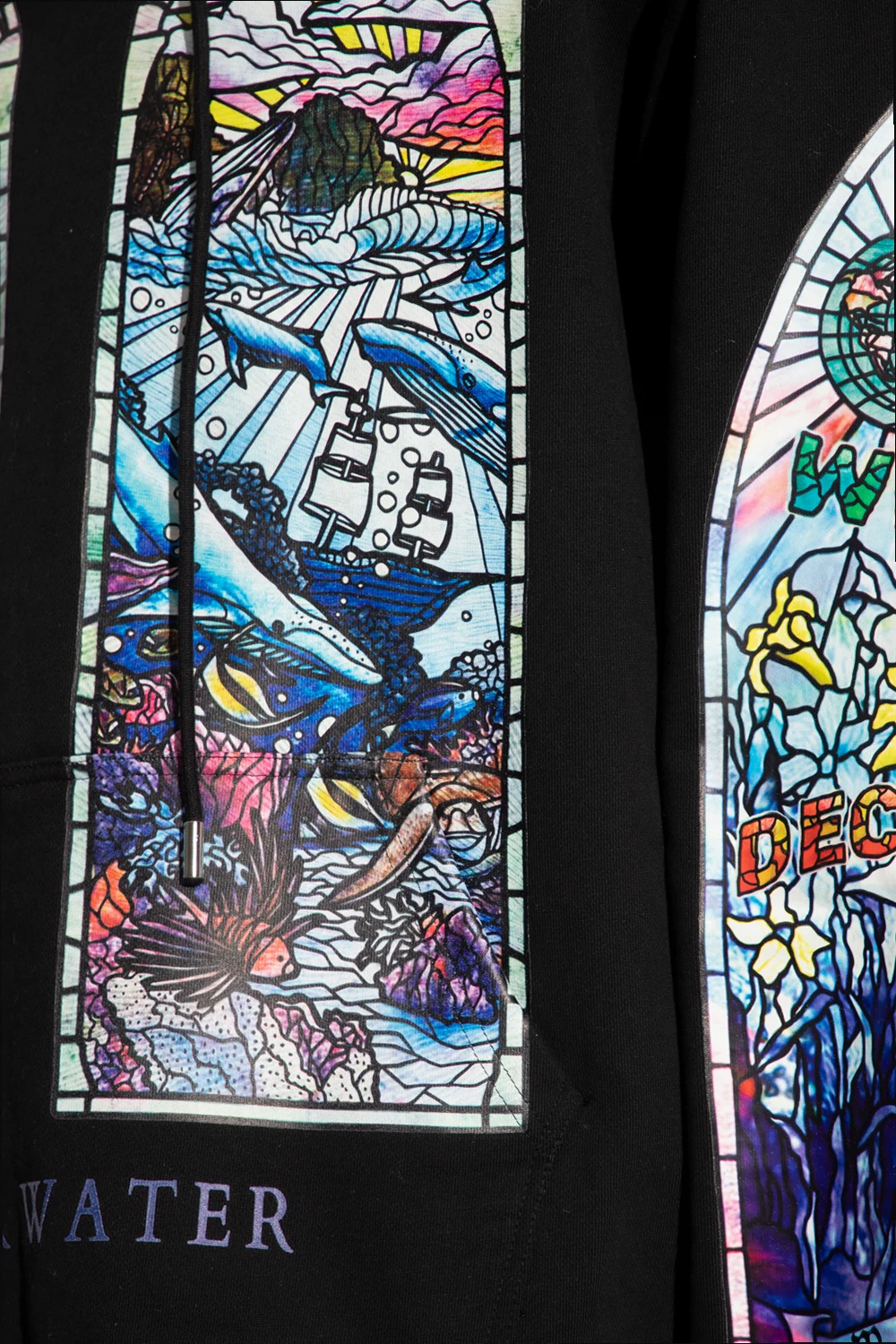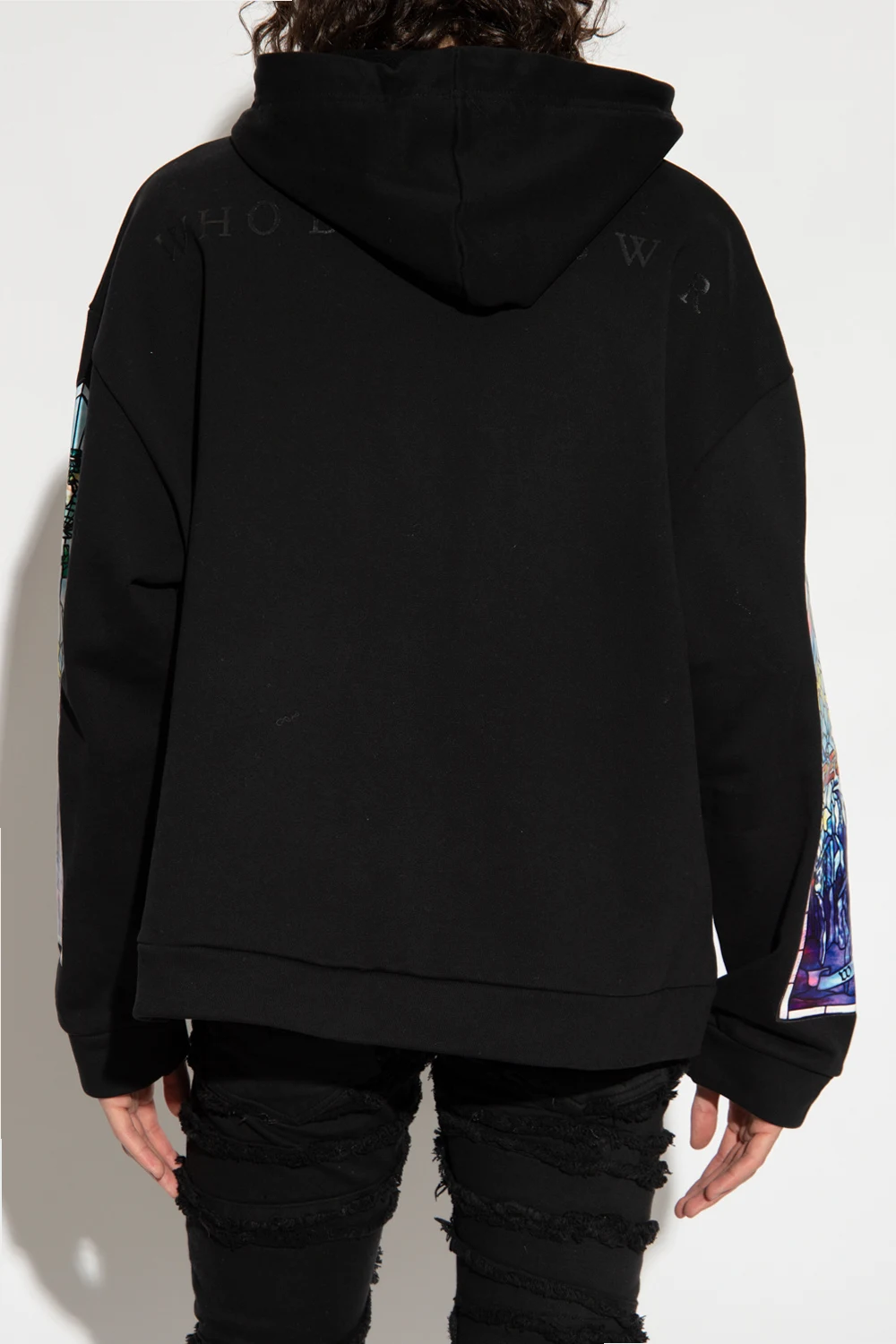 Black hoodie from Who Decides War. Made of cotton, this design features a multicolored stainless glass pattern, drawstring hood, slip pocket and ribbed trims at the hem and cuffs.