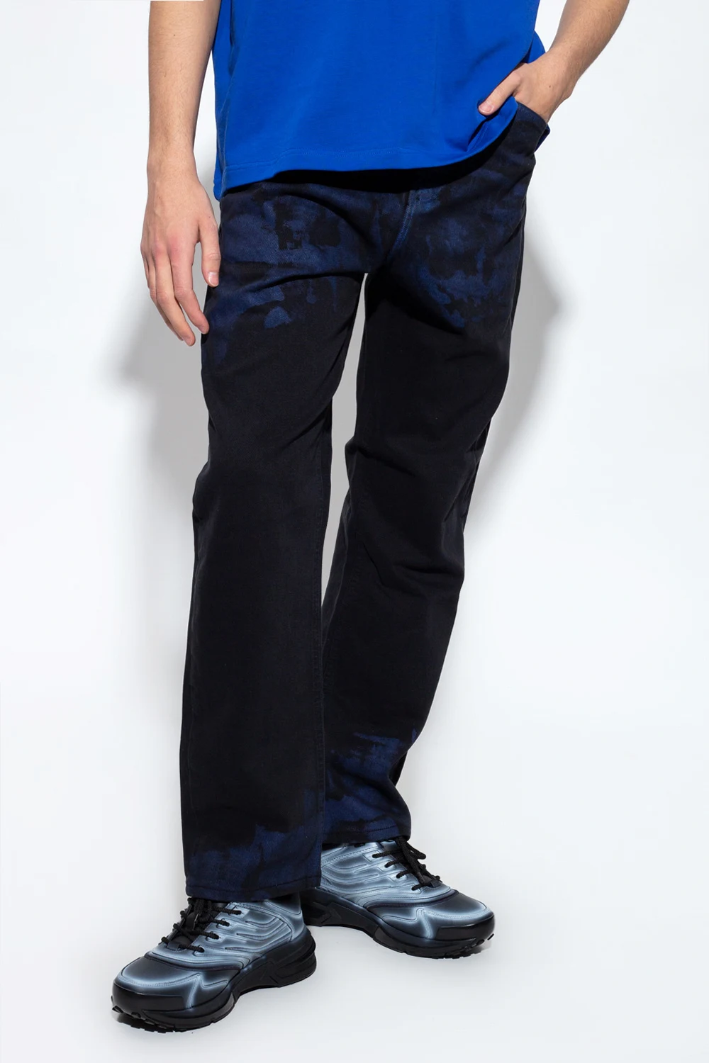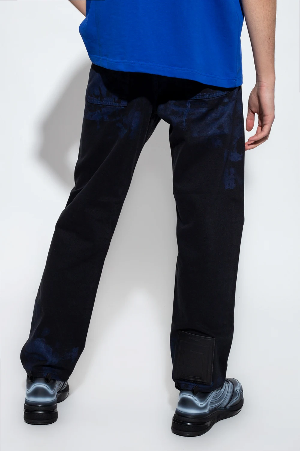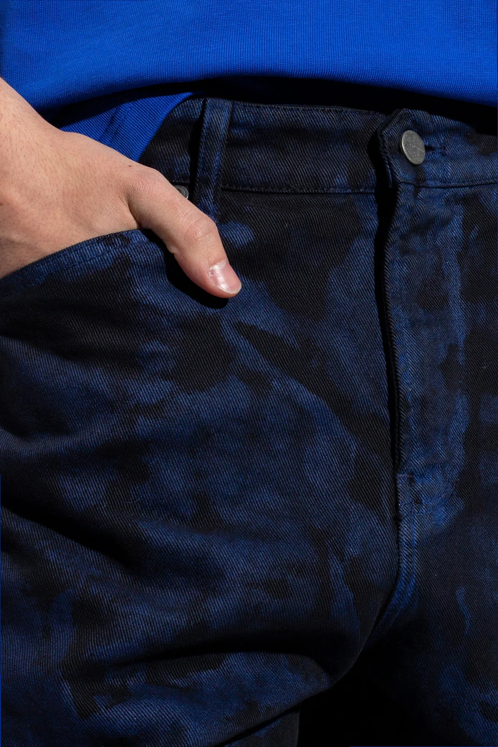 Black and navy jeans from A-Cold-Wall. Fastened with a zip and button, this pair falls down with slightly tapered legs and is complete with three front pockets, two back pockets and a black logo patch.