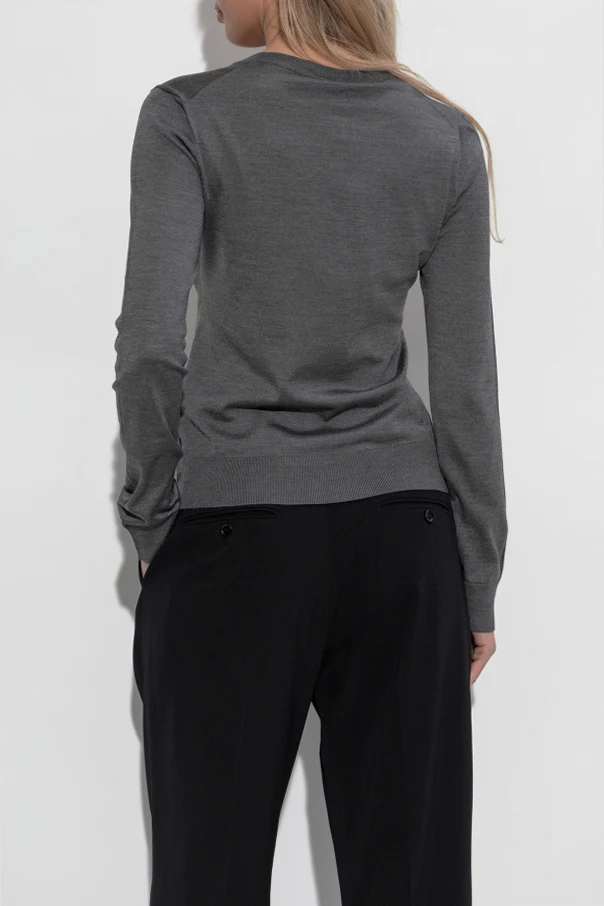 Der Cardigan zeichnet sich durch einen klassischen Schnitt mit langen Ärmeln und V-Ausschnitt aus. Auf der Vorderseite befindet sich eine Reihe von Knöpfen mit Logo, die seinen exklusiven Charakter unterstreichen. Ein dezentes Designerlogo-Patch auf der linken unteren Seite zeugt vom Prestige der Marke.