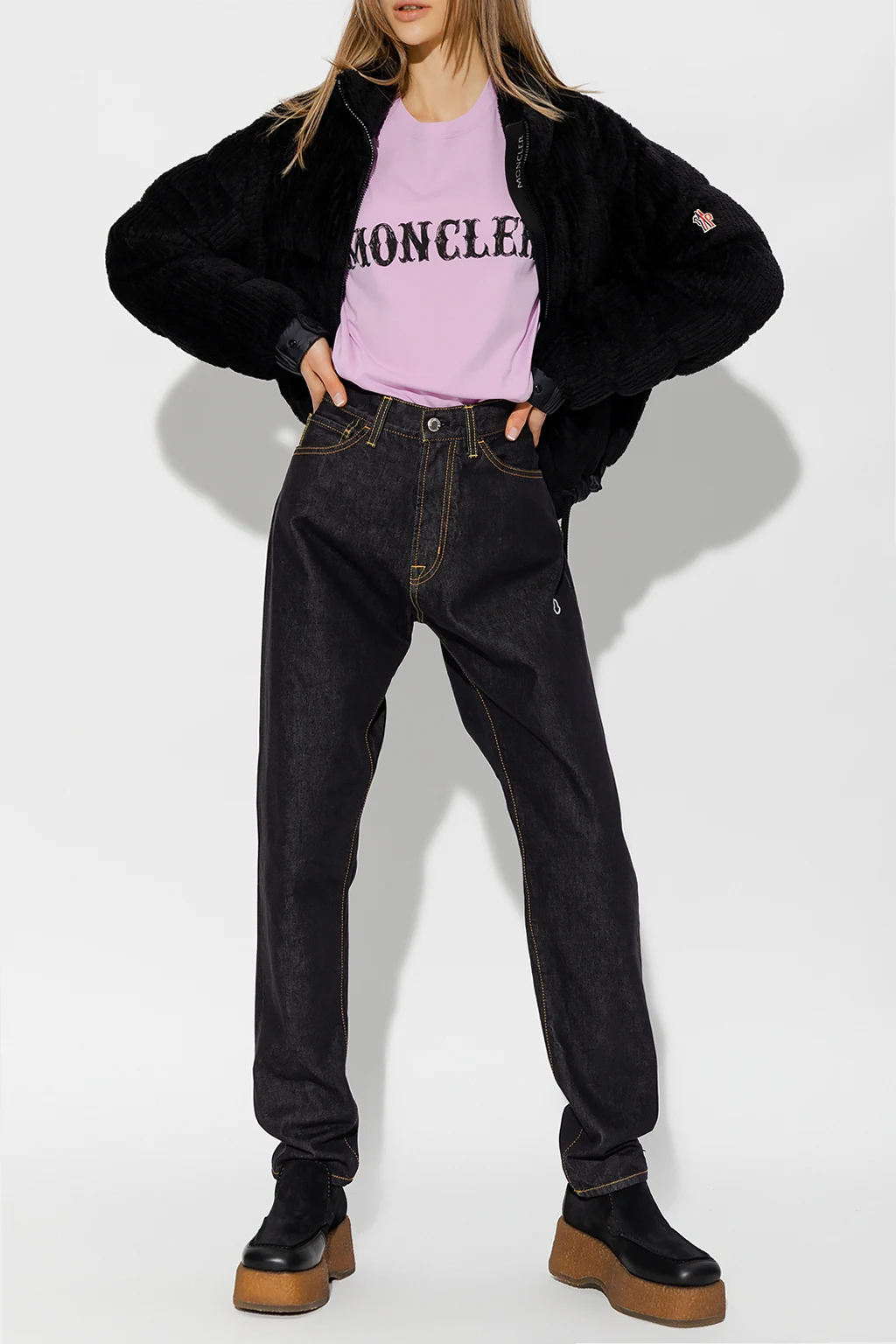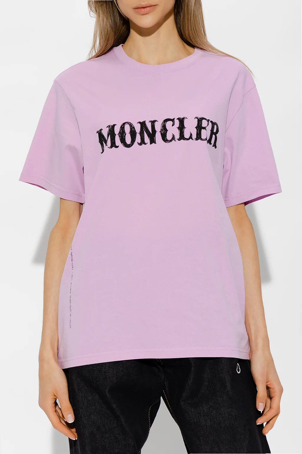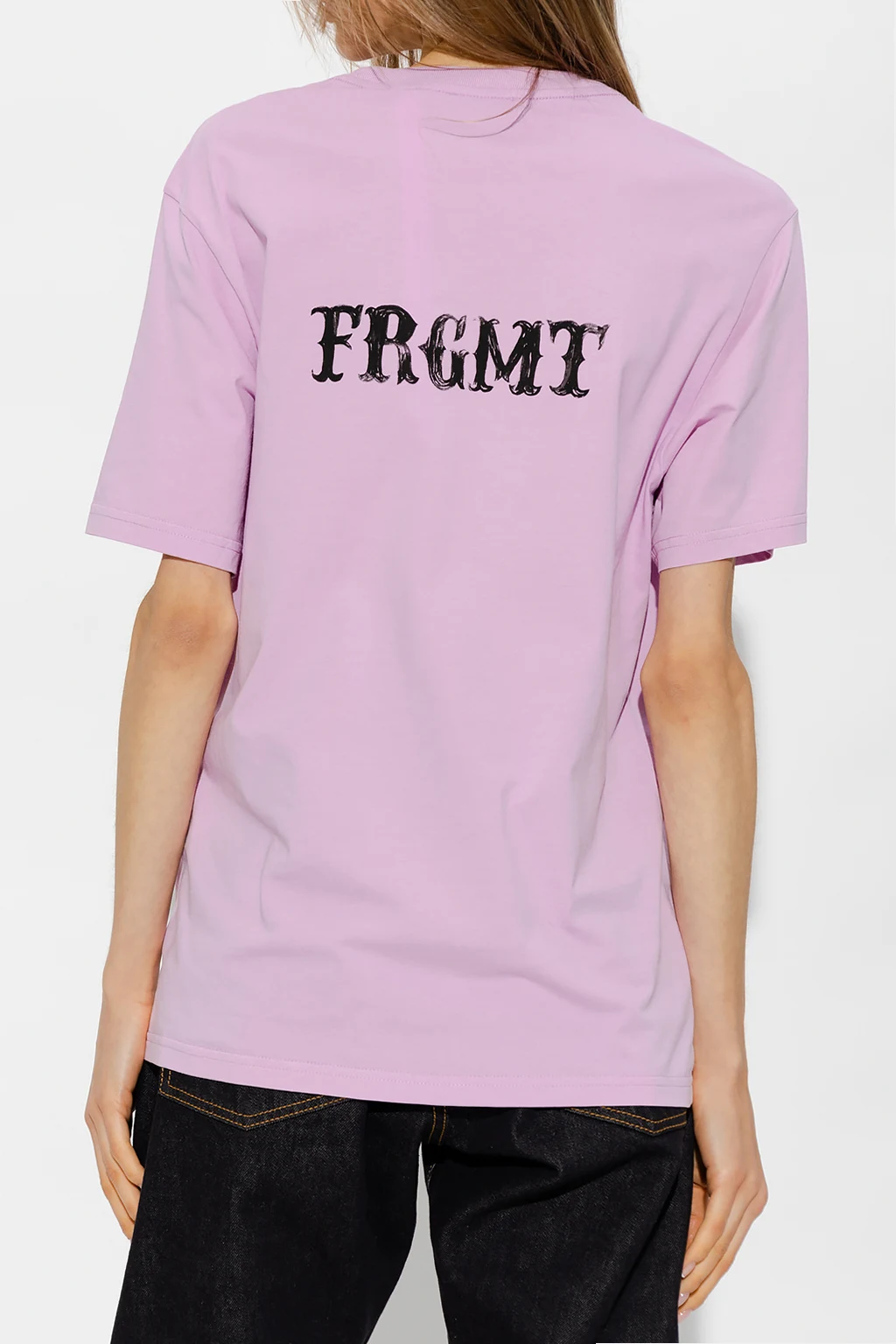 Pink crewneck T-shirt from Moncler Genius, the ‘7 Moncler FRGMT Hiroshi Fujiwara’ collection. Crafted from cotton, this style features short sleeves, an elasticated collar and a black logo print.