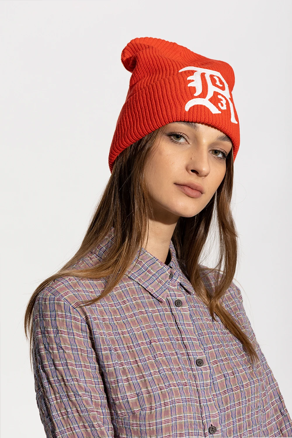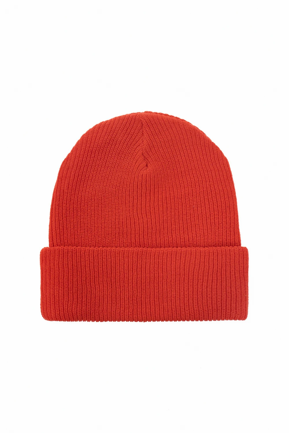 Red beanie from R13. Trimmed with ribbed cotton, this design features a white logo patch.