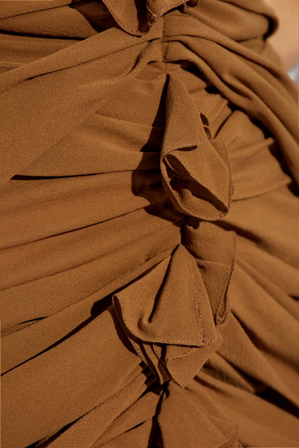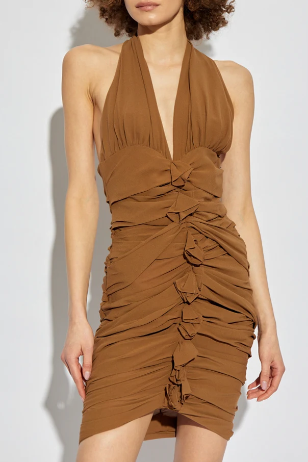 Wir präsentieren Ihnen das Seidenkleid der Marke Saint Laurent , das die Quintessenz von Eleganz und raffiniertem Stil darstellt. Dieses braune Kleid im Mini-Schnitt, das vollständig aus hochwertigster Seide gefertigt ist, begeistert mit seinem subtilen Glanz und seiner Zartheit. Der tiefe Halter-Ausschnitt betont Schultern und Rücken und schafft eine äußerst sinnliche Silhouette.