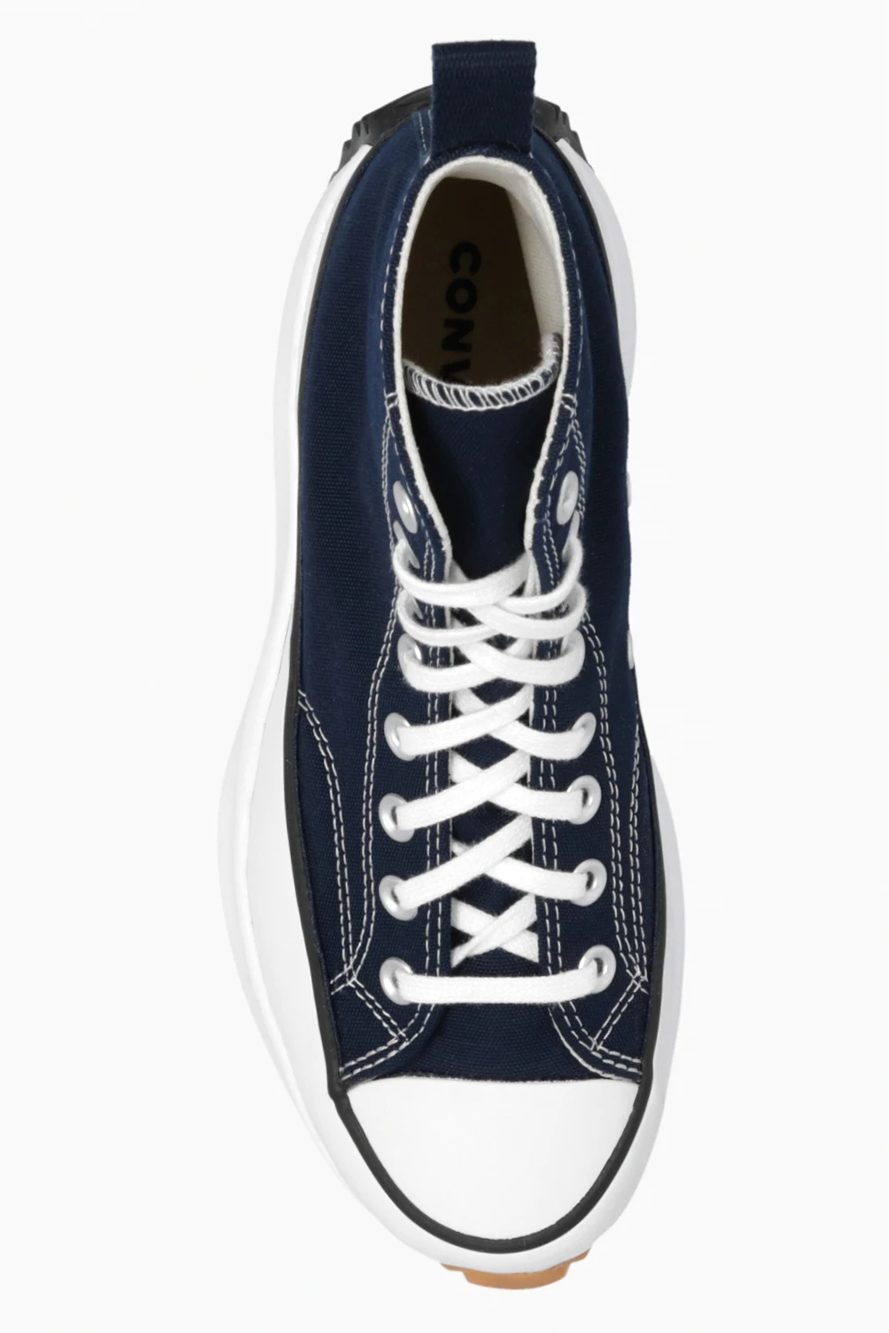 Navy blue and white ‘Run Star Hike’ high-top sneakers from Converse. Crafted from fabric, this lace-up model sits on a black, white and beige rubber sole and showcases the brand's logo, an iconic ‘Chuck Taylor’ patch and the specially contoured SmartFOAM insole providing additional comfort.
