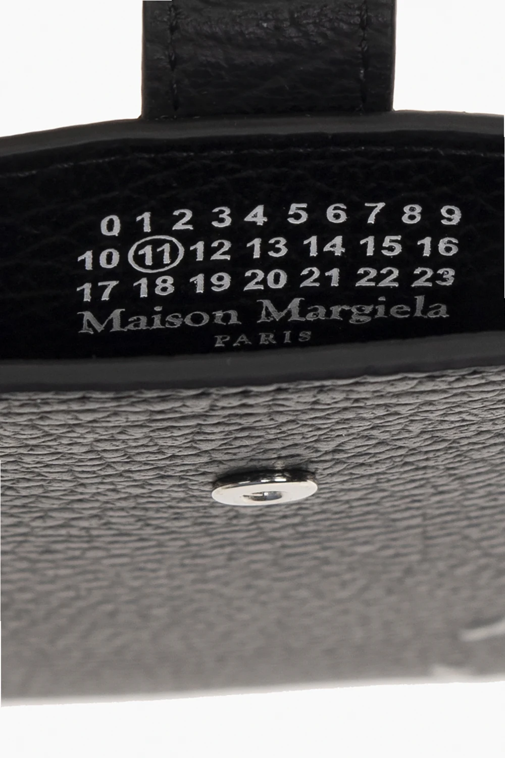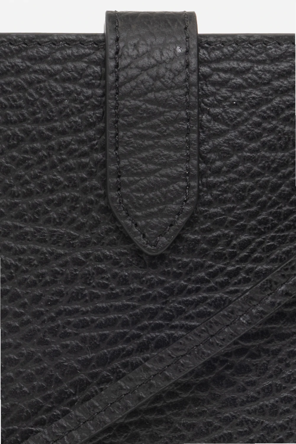 Black phone pouch from Maison Margiela. Crafted from calf leather, this item features a snap closure, white logo embroidery, one internal compartment, detachable and adjustable strap and silver-tone metal hardware.