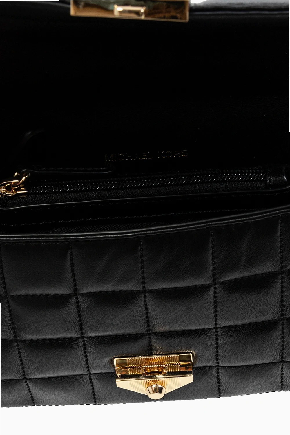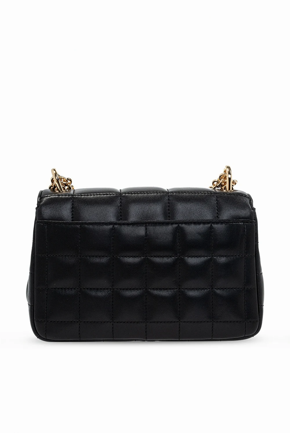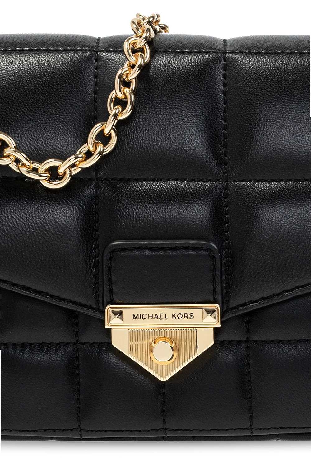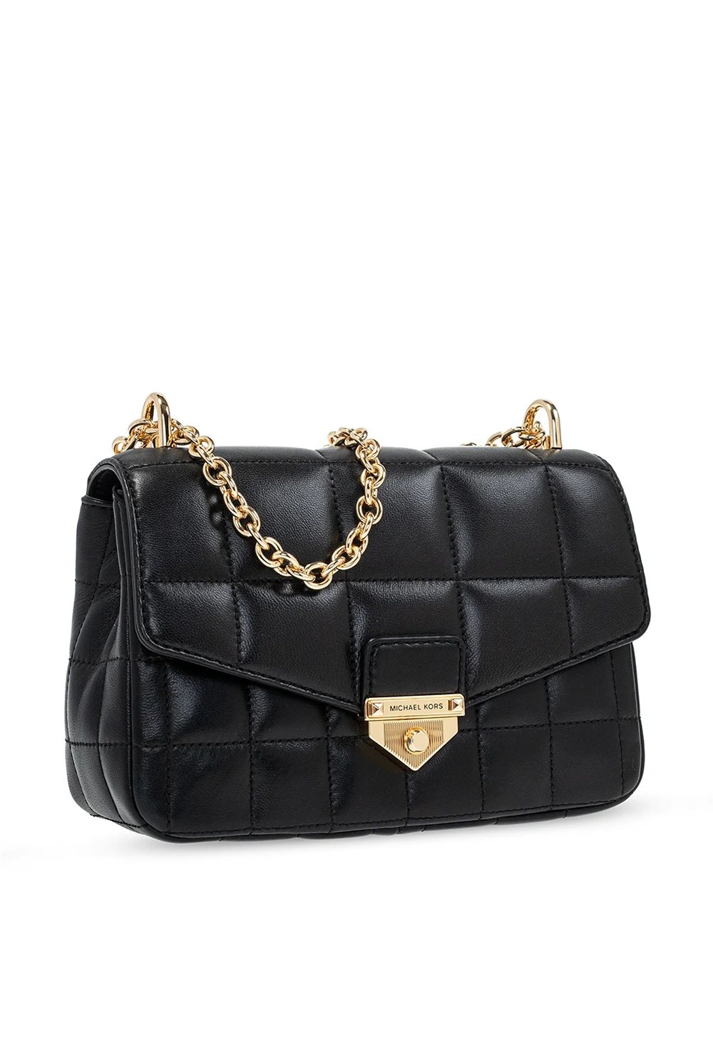 Black 'Soho' quilted shoulder bag from Michael Michael Kors. Size small. Crafted from lamb leather, this design secures with a decorative fastener and showcases exposed stitching details and an engraved logo. It is complete with a snap-fastened pocket at the back, a chain shoulder strap, gold-tone metal hardware and an interior with two compartments, one slip pocket and two zipped pockets.