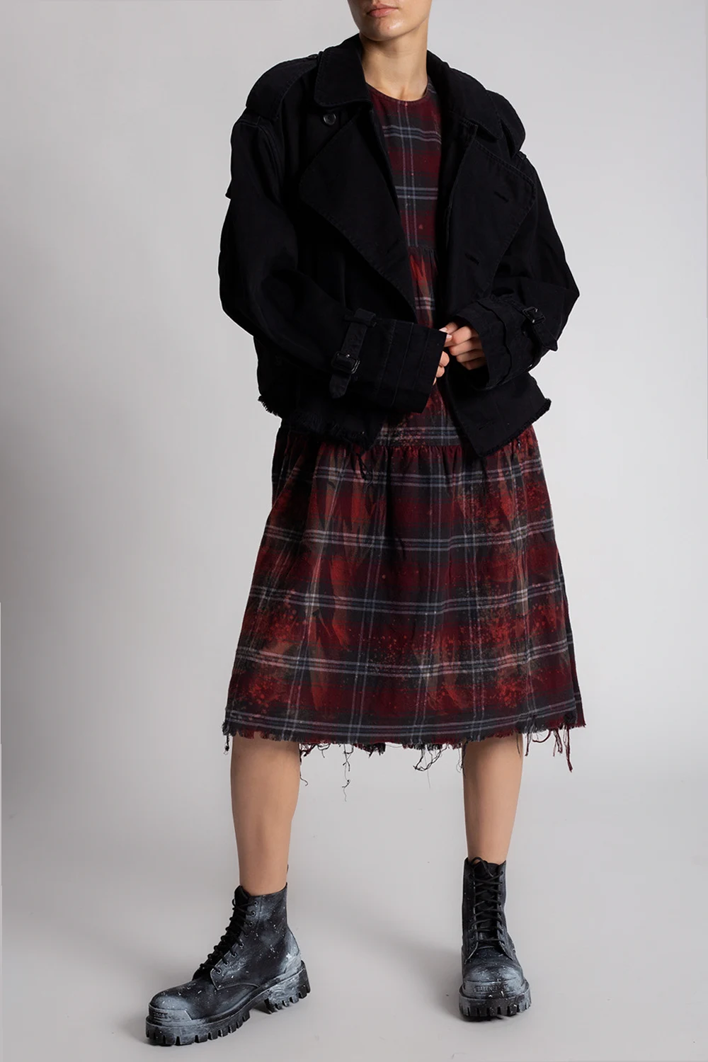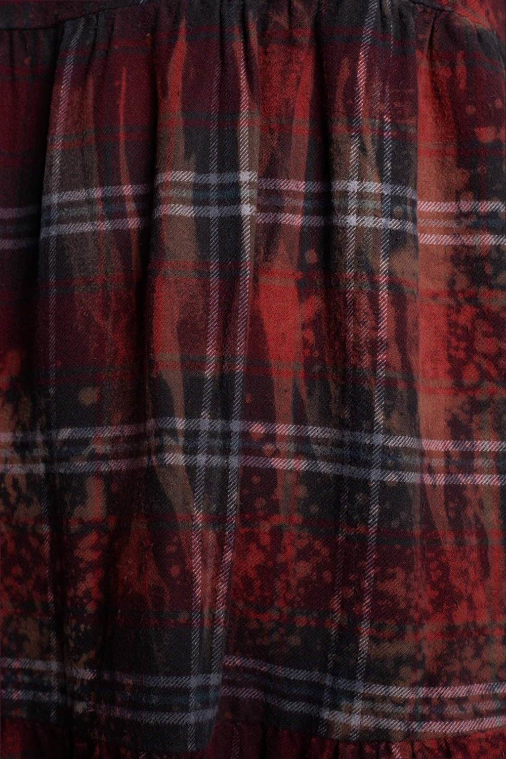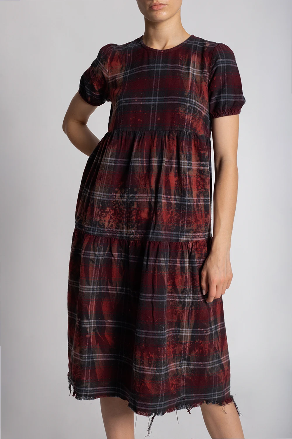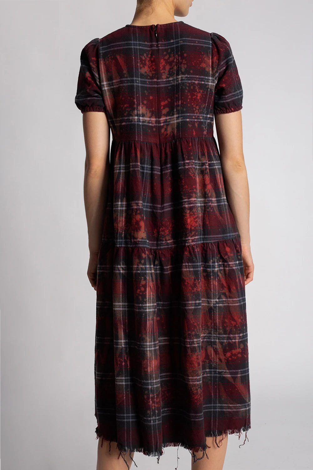 Maroon and grey distressed dress from R13. Crafted from cotton, this round neck design features a back zip, check pattern, paint splatter effect, short sleeves and raw cut edges.
